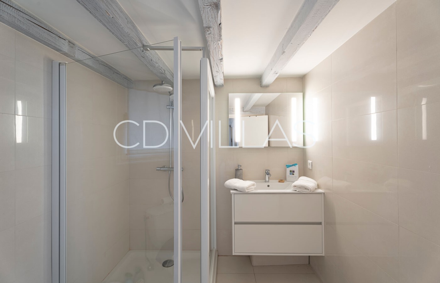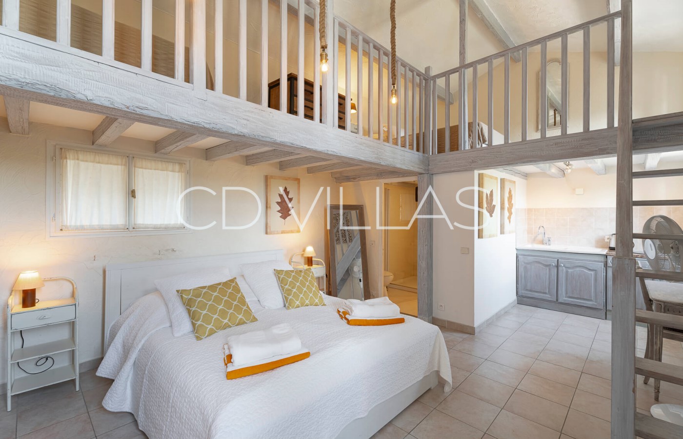 Bedroom 4 - Airconditioned up a flight of external steps with its own entrance, is an independent guest apartment with large double bed with modern kitchenette, ENSUITE modern shower room with a shower, basin and loo. Low-ceilinged mezzanine, only suitable for older children, with a large single and a second single bed.