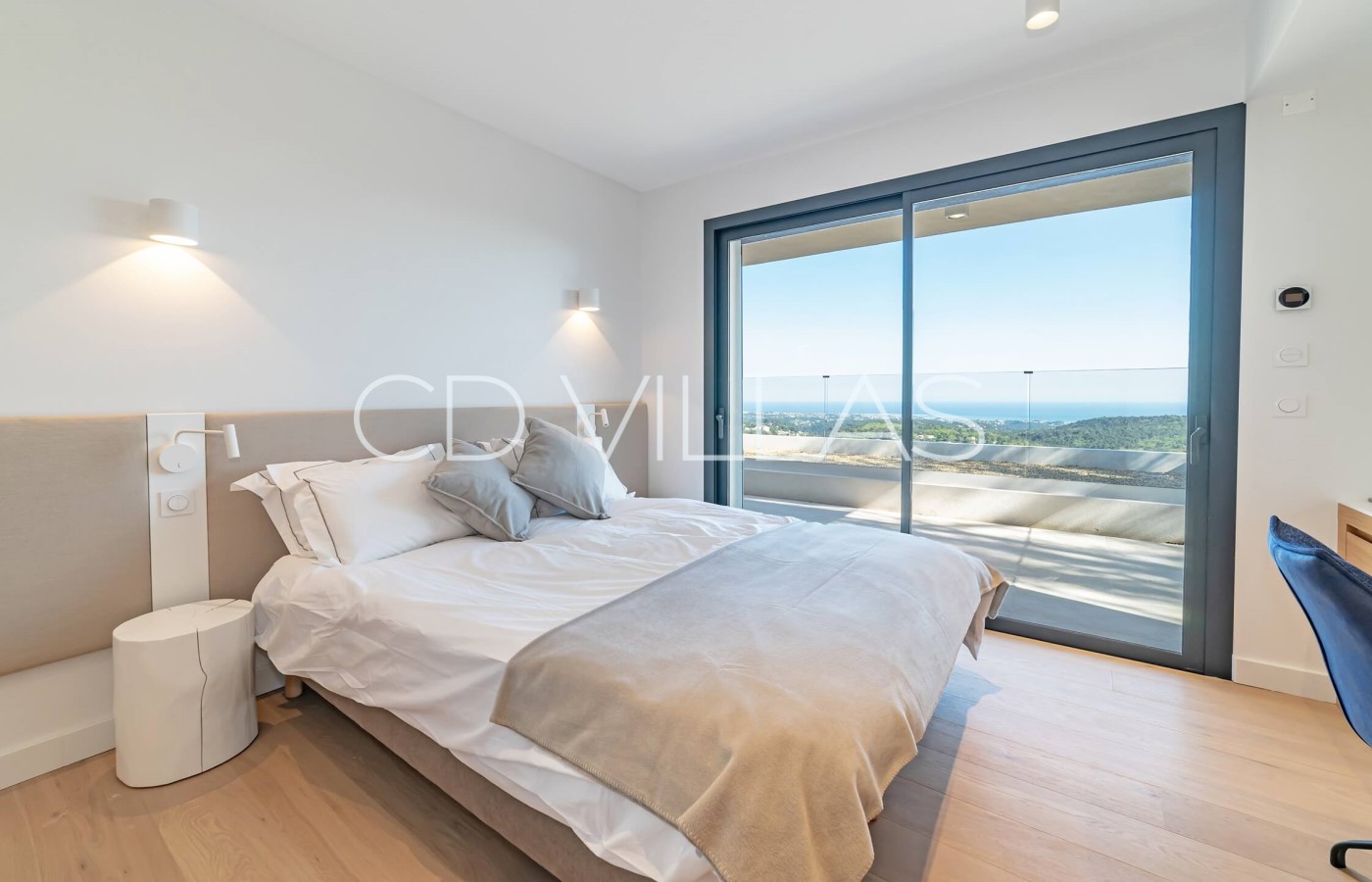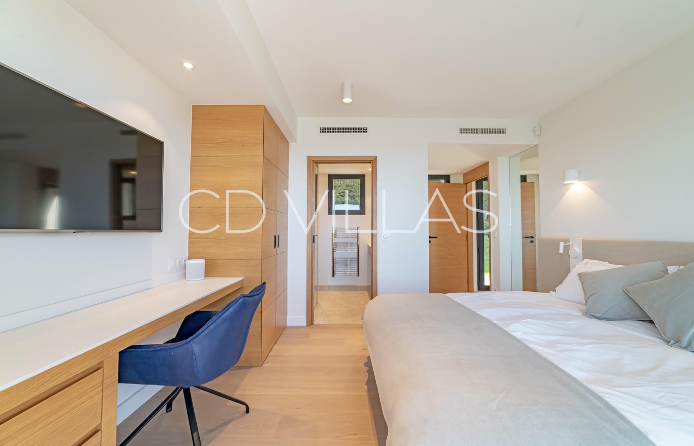 Bedroom 5 - Main Guest room with large double bed with ensuite bathroom, shower, twin basins and hairdryer. wifi, data point, Sonos, TV, AC, safe, security shutters