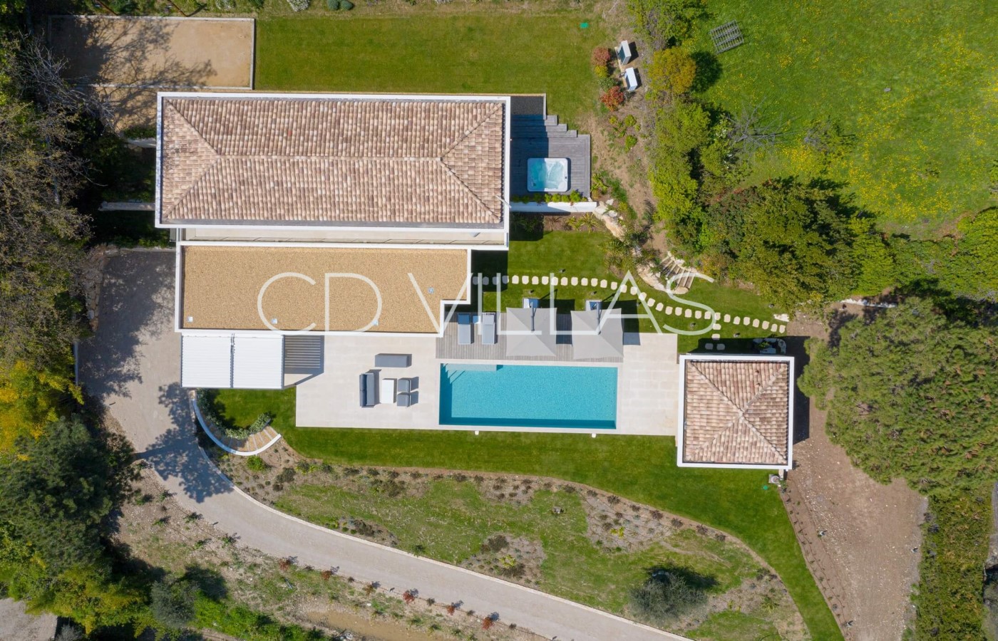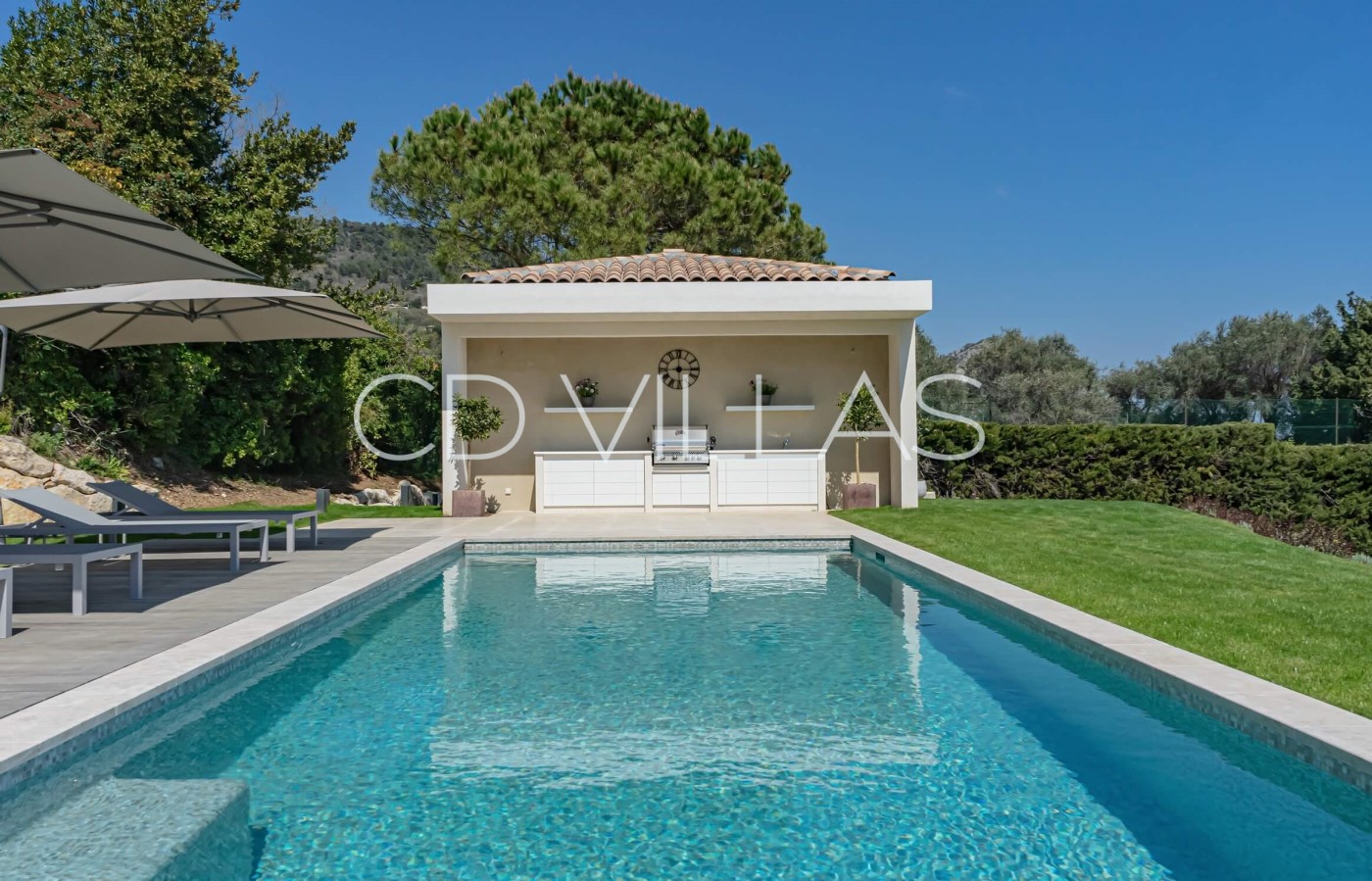 The property is nestled in the hills and offers privacy and quiet surroundings. Outdoor dining is delightful throughout the day while enjoying the view at all times! The pool is a saltwater pool and can be heated upon request. The beautiful pool house is equipped with a gas barbecue and rotisserie.