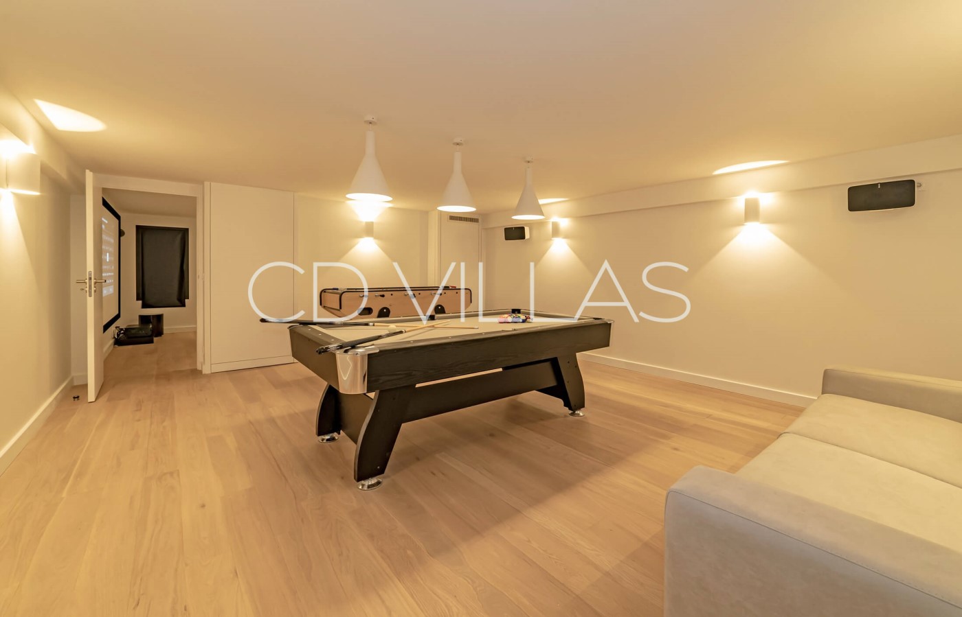The lower ground floor is dedicated to entertainment with a large play room with pool table, table football, Sonos, comfortable seating and integrated sound system. Amazon Firestick allows guests to enjoy Netflix and Amazon Prime (own subscription needed).