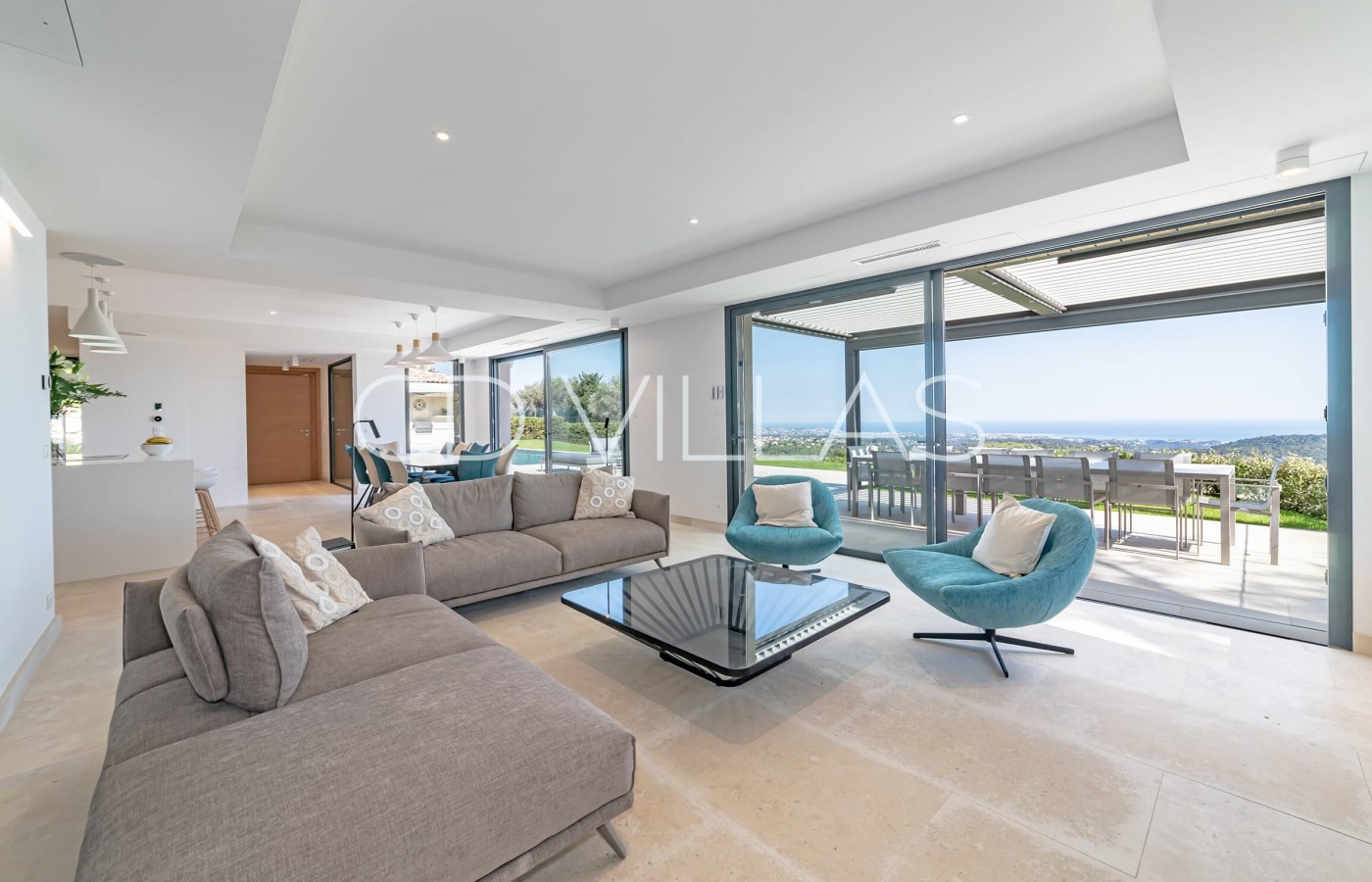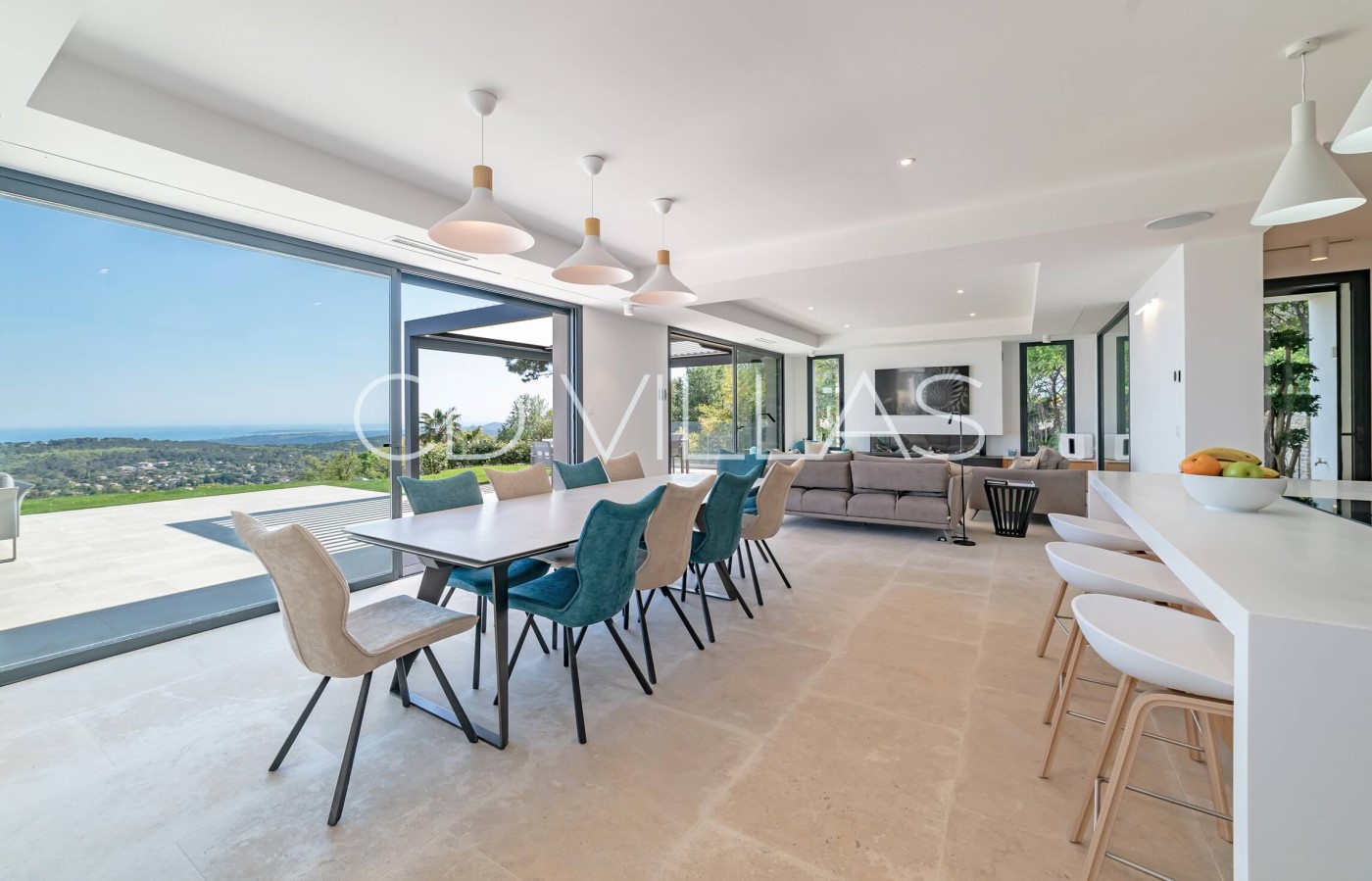 Living room - Open plan living / dining room, boasting the beautiful sea views Dining for 12 guests / Large TV allowing Netflix and Amazon Prime etc. (own account needed) / Gas fire / Sonos sound system / AC