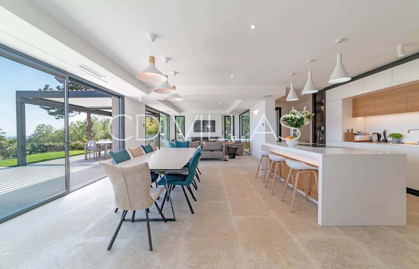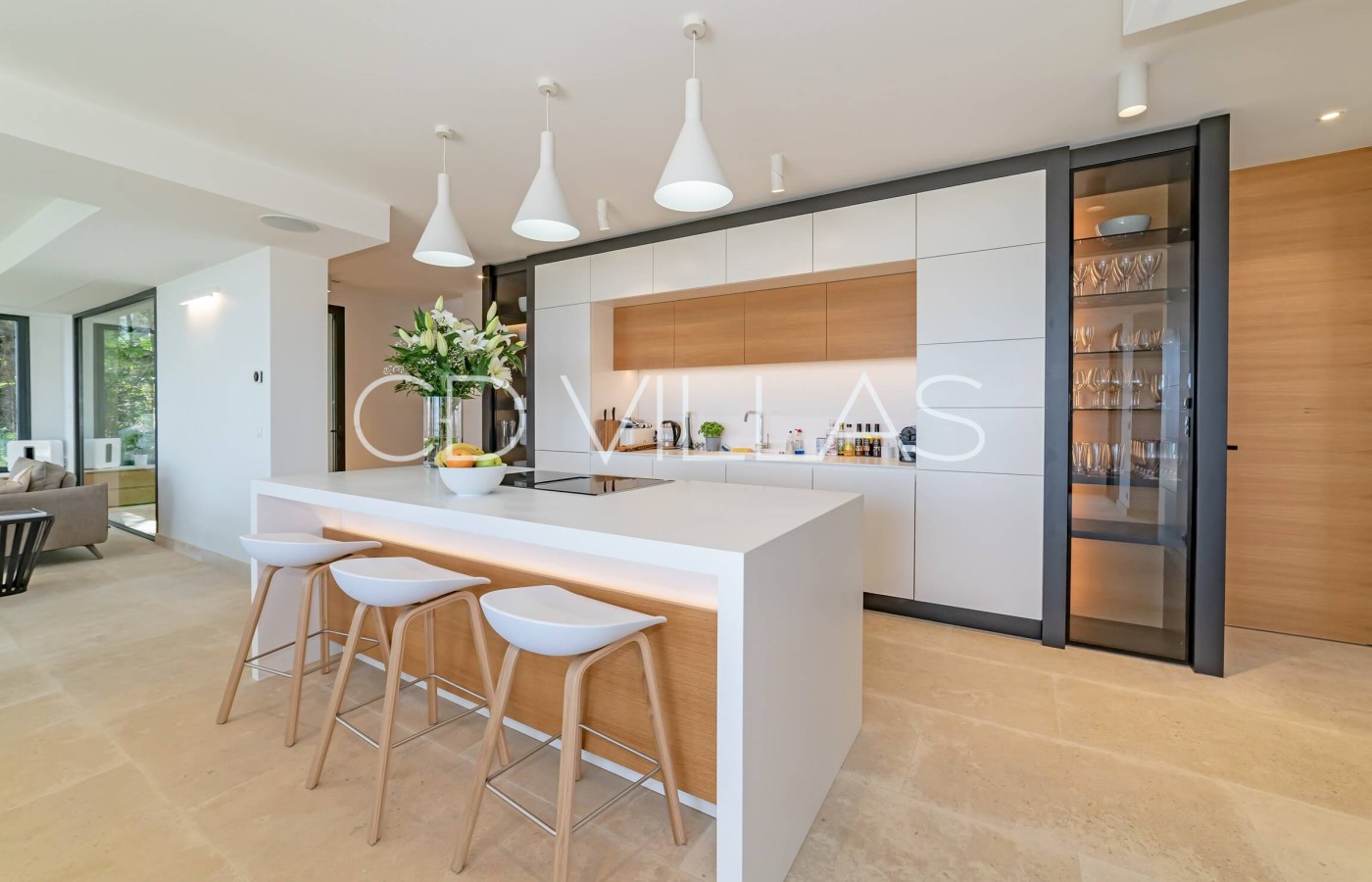 On the ground floor there is a large open plan living area with modern and fully equipped kitchen with breakfast island.