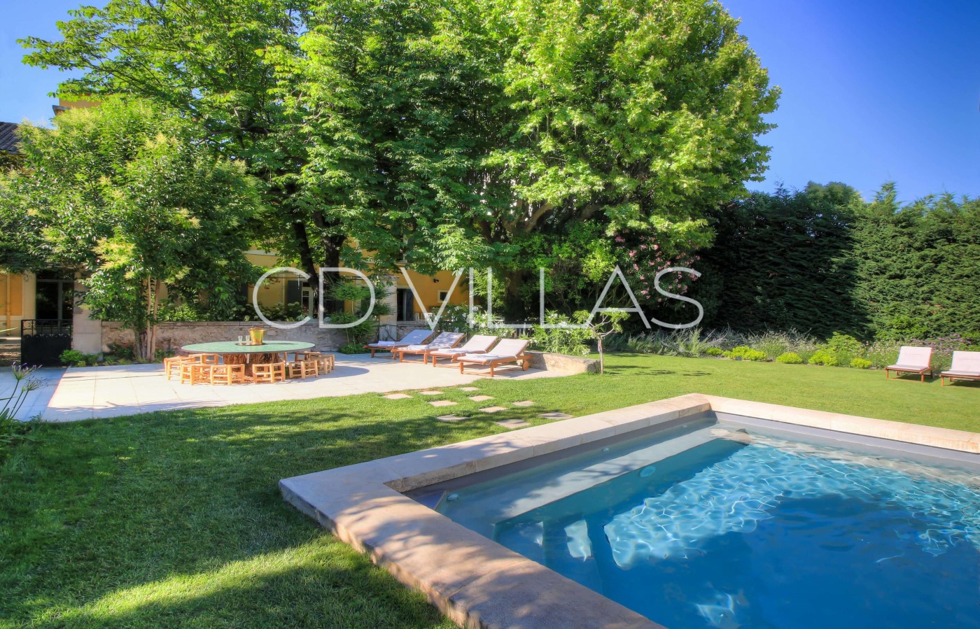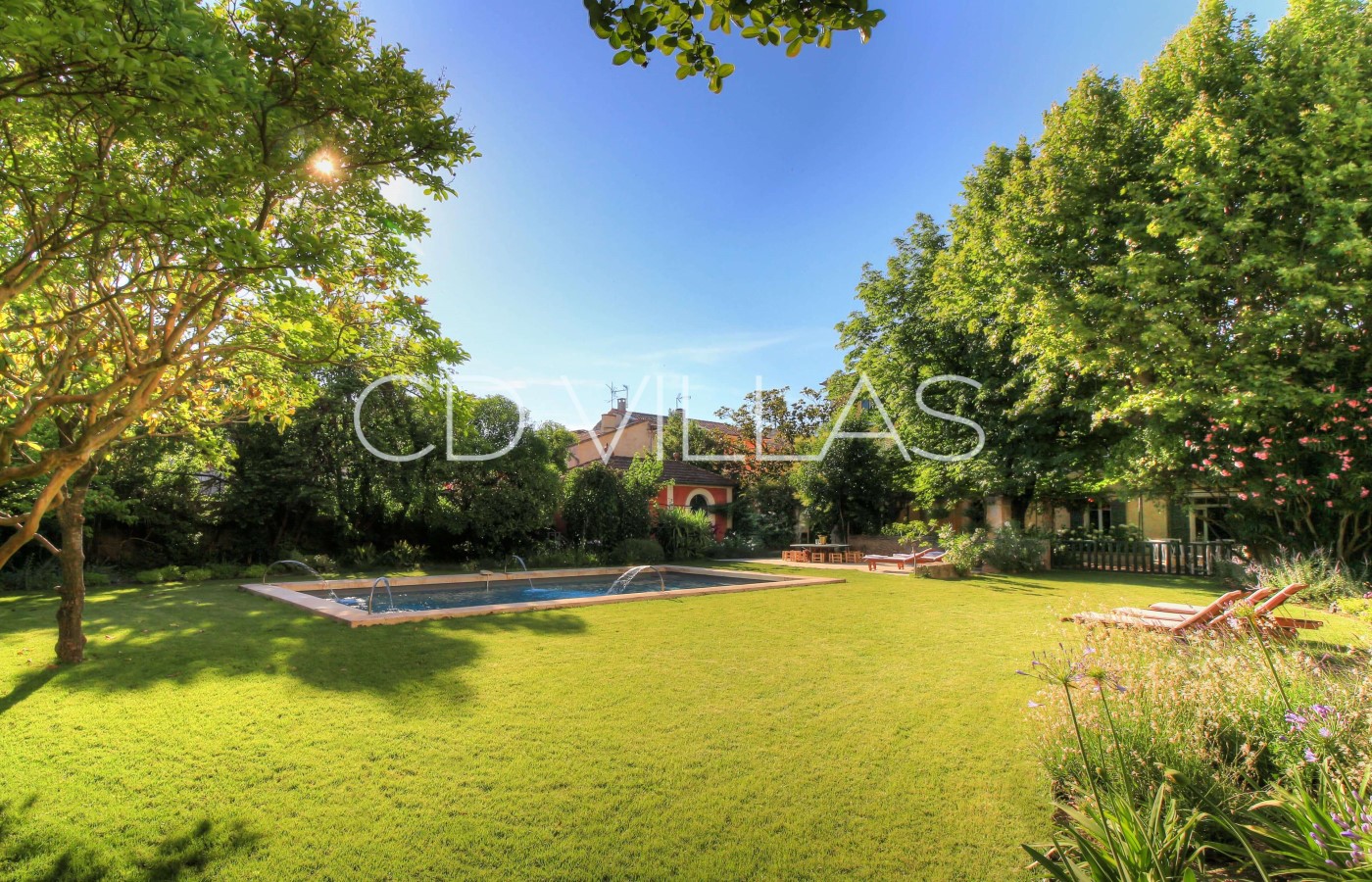 The lovely walled garden is completely private and offers a shaded terrace for al fresco dining, a lounge area, and a swimming pool surrounded by a flat lawn and sun loungers. The garden is planted with mature trees and plants that flower throughout the year.