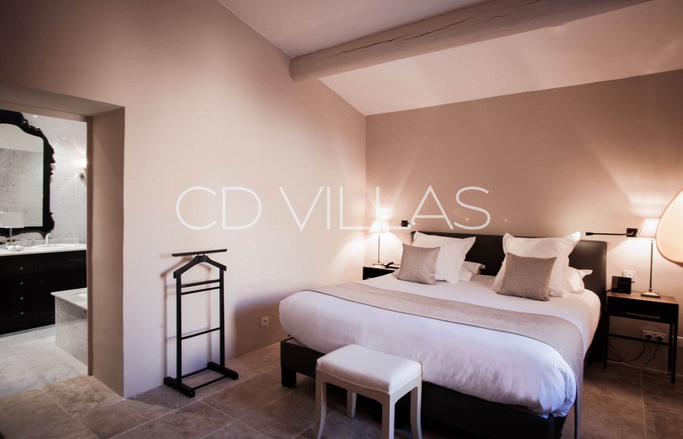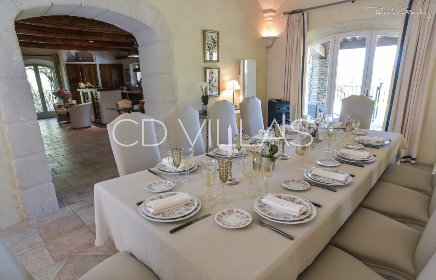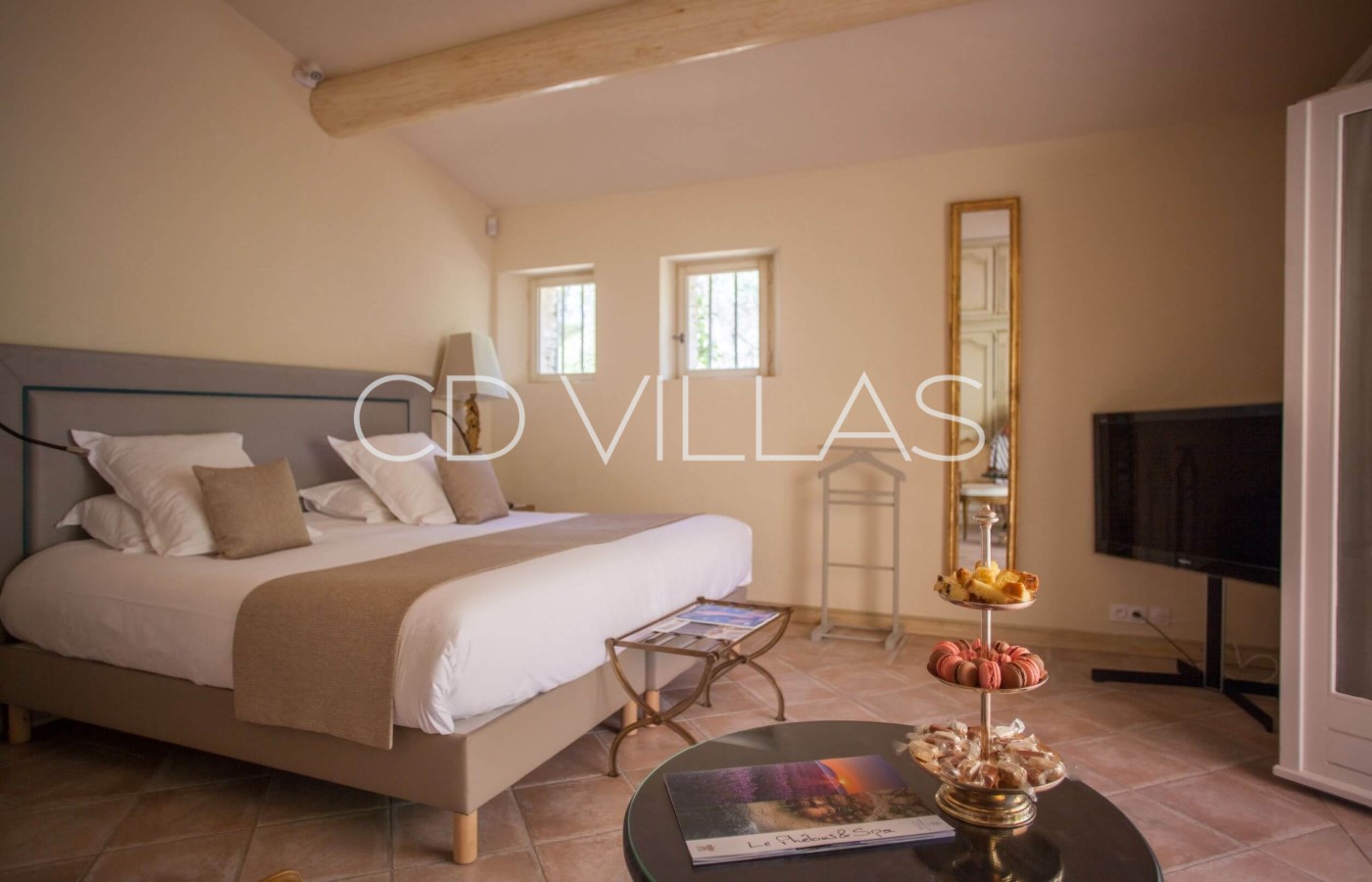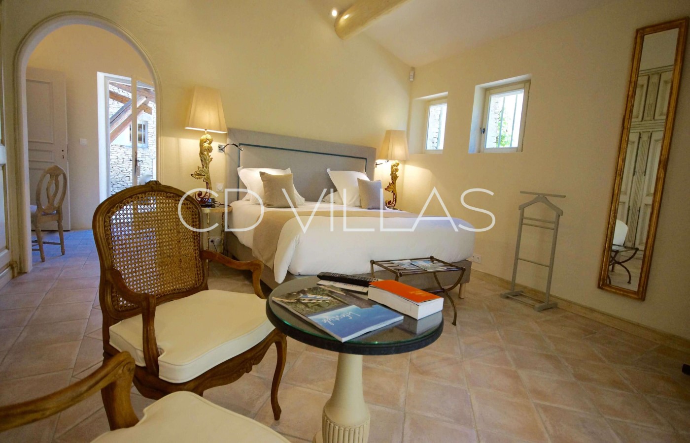 The property has seven beautiful bedrooms, all with en-suite bathroom, to accommodate up to 14 people. Three bedroom suites are located in the main part of the house, two bedrooms form the terrace wing with direct access to a private terrace and the pool, and a further two bedrooms are in the new luxury guest house, just a few steps from the main house. At the heart of the property is a light and spacious living room with high ceilings where family and guests can relax or walk out onto a large covered terrace with comfy seating and outdoor dining area overlooking the pool and views of the Luberon hills. Adjacent to the living room is is a big, fully-equipped family kitchen with breakfast area. A separate dining room connects the living room and kitchen with elegant dining table and access to the outside terrace. The villa is fully air-conditioned.
