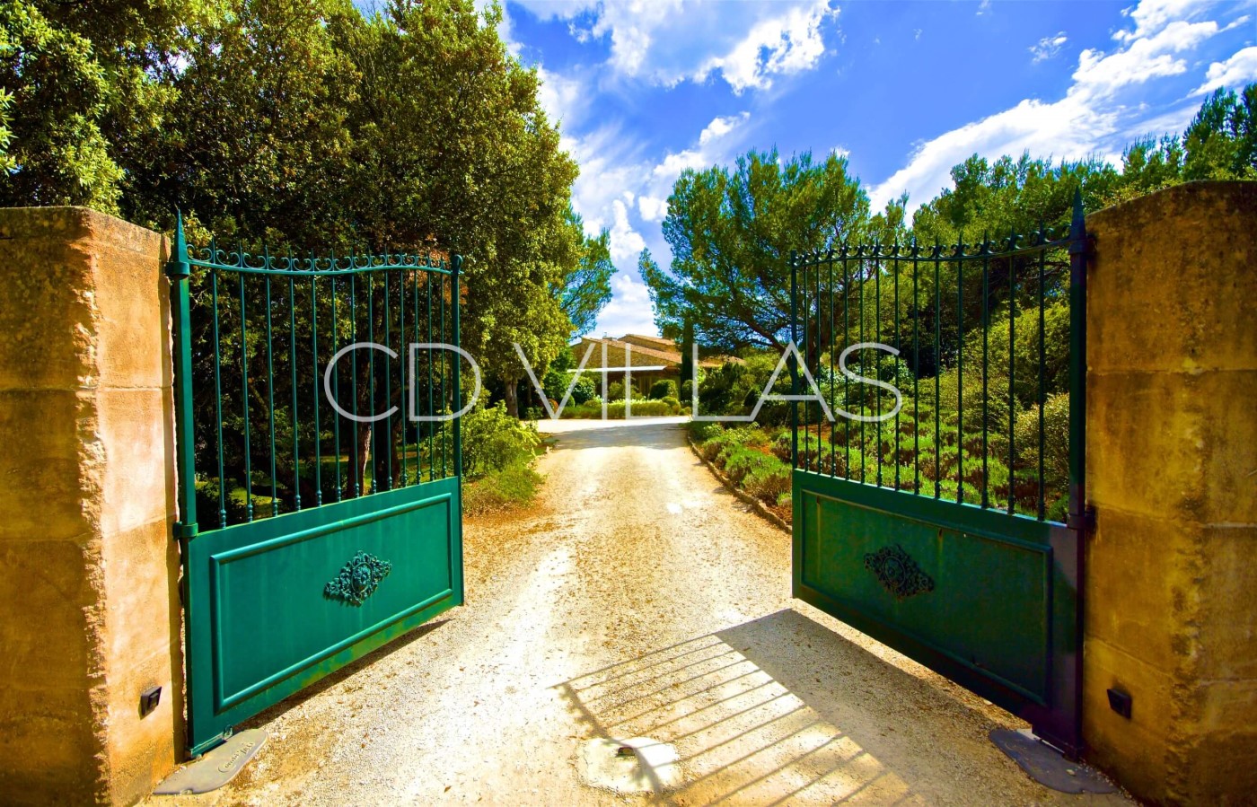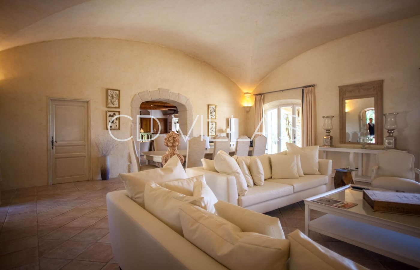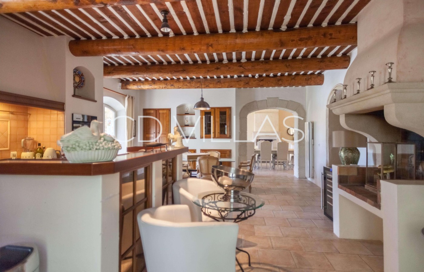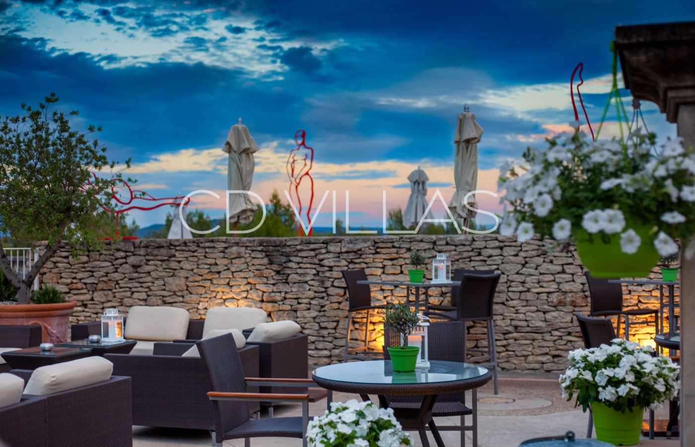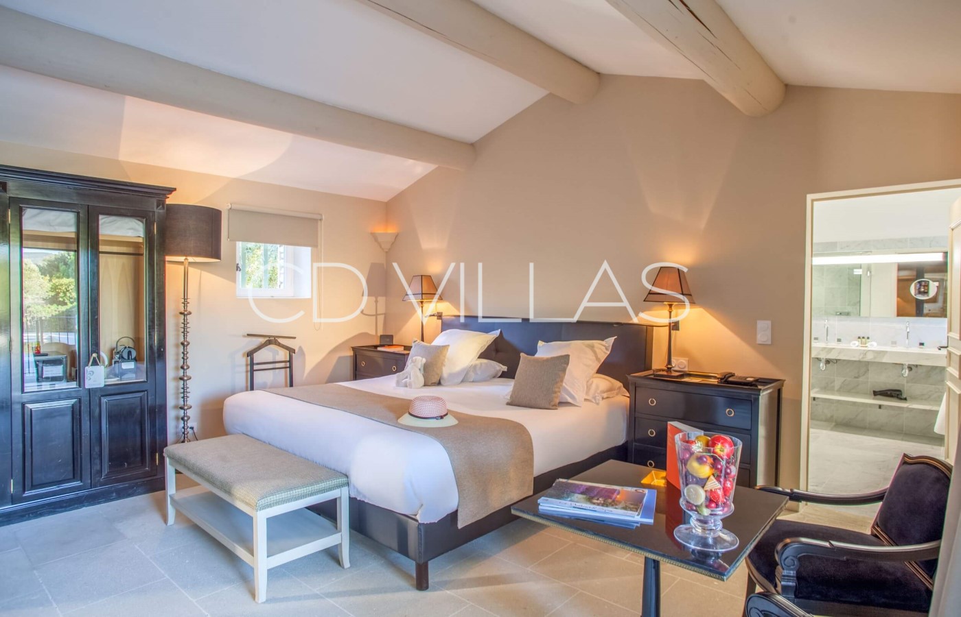 The property has seven beautiful bedrooms, all with en-suite bathroom, to accommodate up to 14 people. Three bedroom suites are located in the main part of the house, two bedrooms form the terrace wing with direct access to a private terrace and the pool, and a further two bedrooms are in the new luxury guest house, just a few steps from the main house. At the heart of the property is a light and spacious living room with high ceilings where family and guests can relax or walk out onto a large covered terrace with comfy seating and outdoor dining area overlooking the pool and views of the Luberon hills. Adjacent to the living room is is a big, fully-equipped family kitchen with breakfast area. A separate dining room connects the living room and kitchen with elegant dining table and access to the outside terrace. The villa is fully air-conditioned.