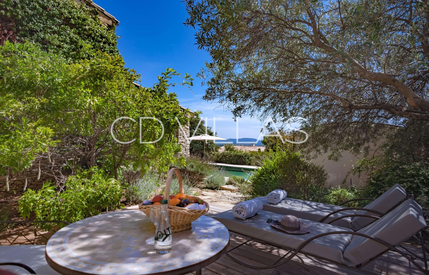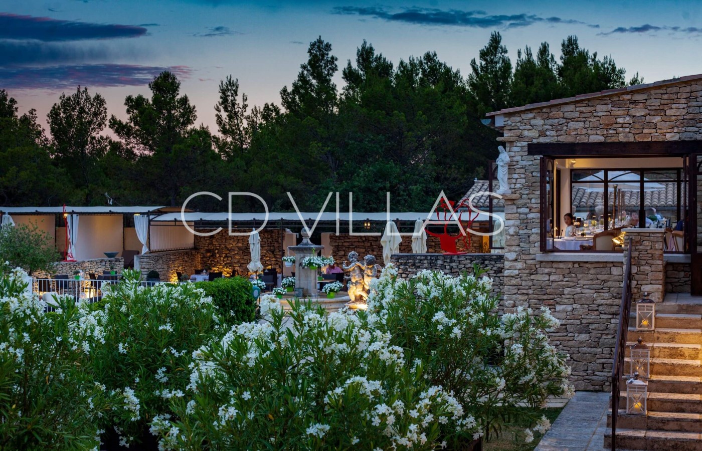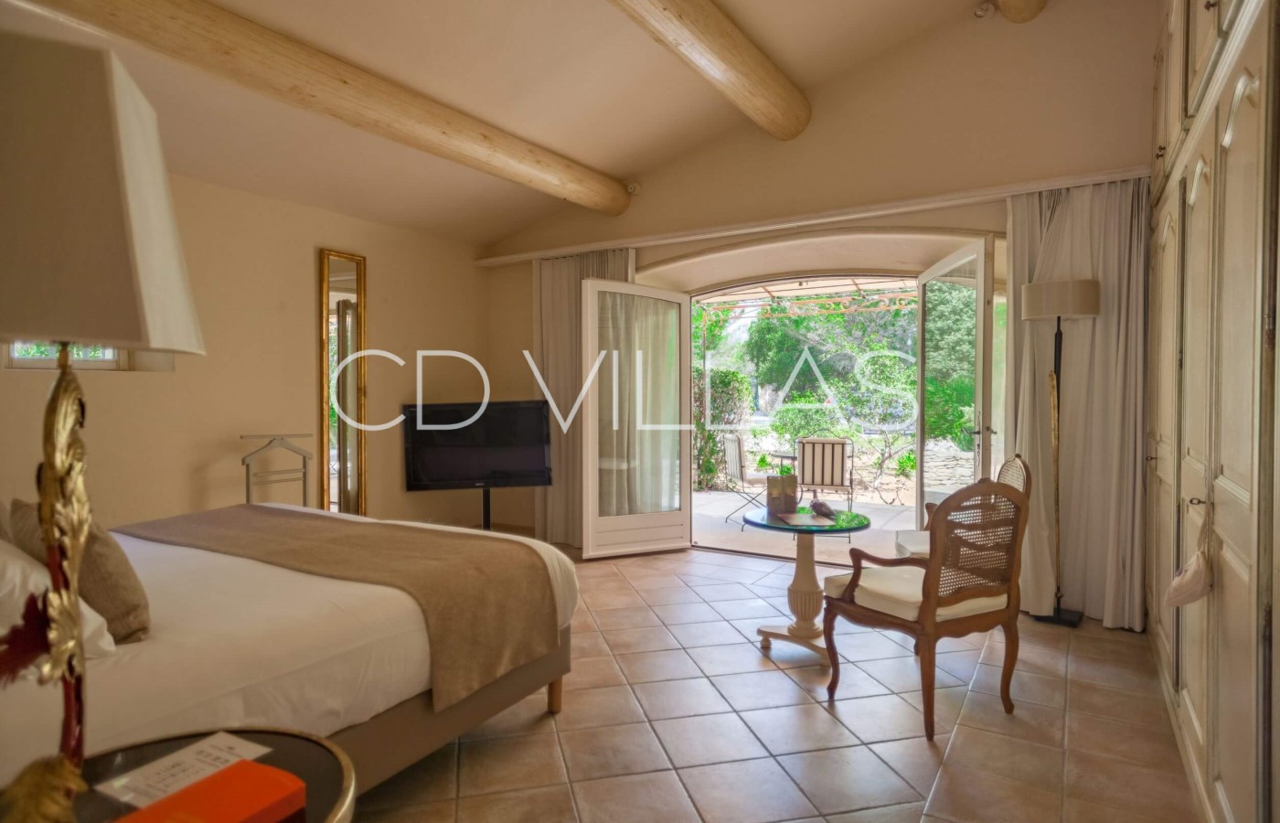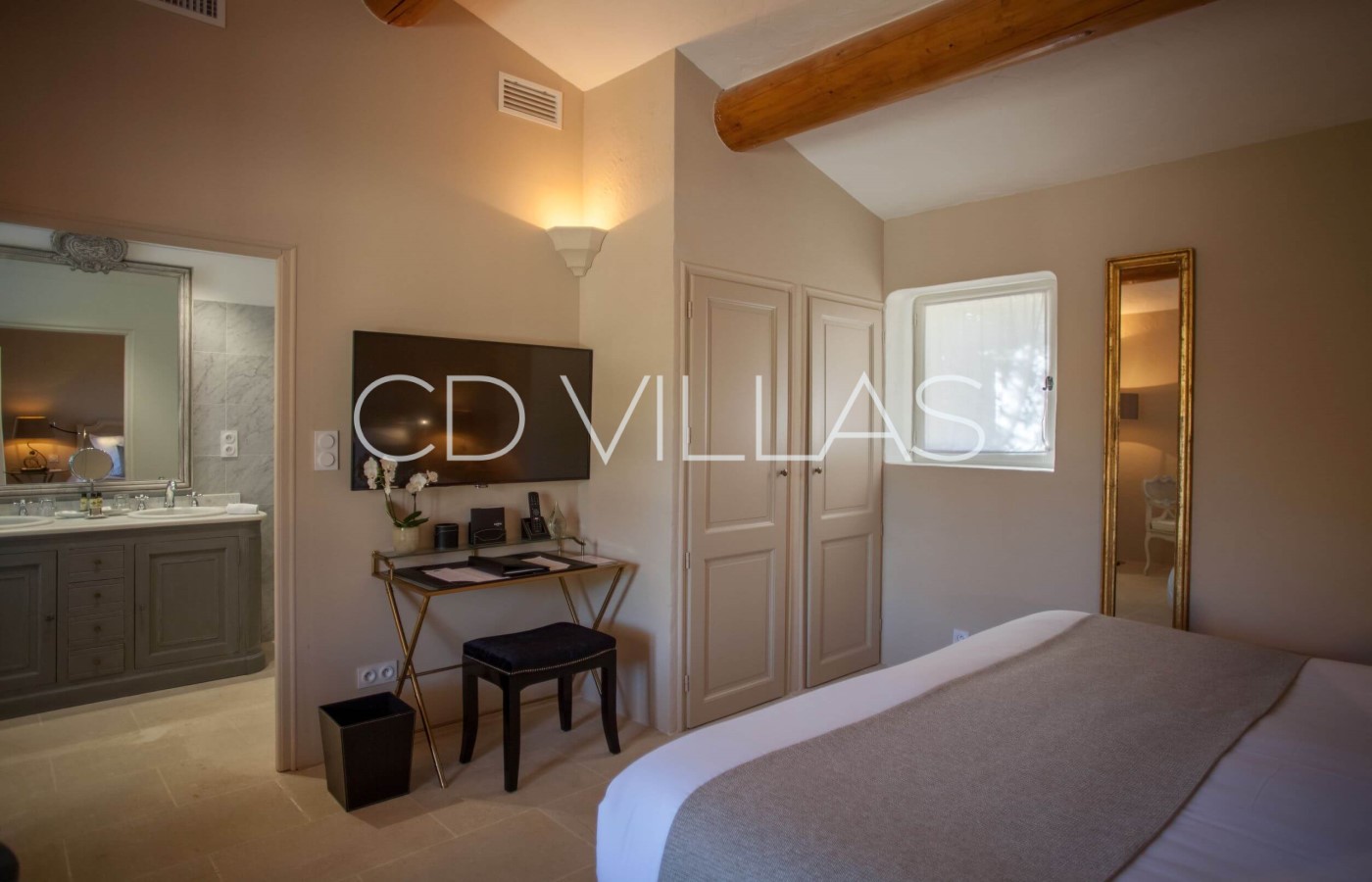 The villa is set within a lovely Mediterranean garden of over 7,000m2 planted with fragrant trees and shrubs with lawns and shaded areas plus petanque court. The heated swimming pool measures 12x6 metres and has gentle steps as well as being elegantly fenced for child security while offering plenty of terrace space for sunbathring. The entrance to the property is via securitsed gates from a small country road leading into the village. At the same time guests can enjoy all the benefits and services of the adjoining 5-star boutique hotel which can be accessed via a gate at the bottom of the garden. This includes a personalised chef, butler, babysitting and night guardian for security. Guests can also enjoy all the hotel services including the Michelin-star restaurant, bistrot, bar, tennis court, large indoor and outdoor pools and a professional Spa offering a wonderful range of well-being treatments.