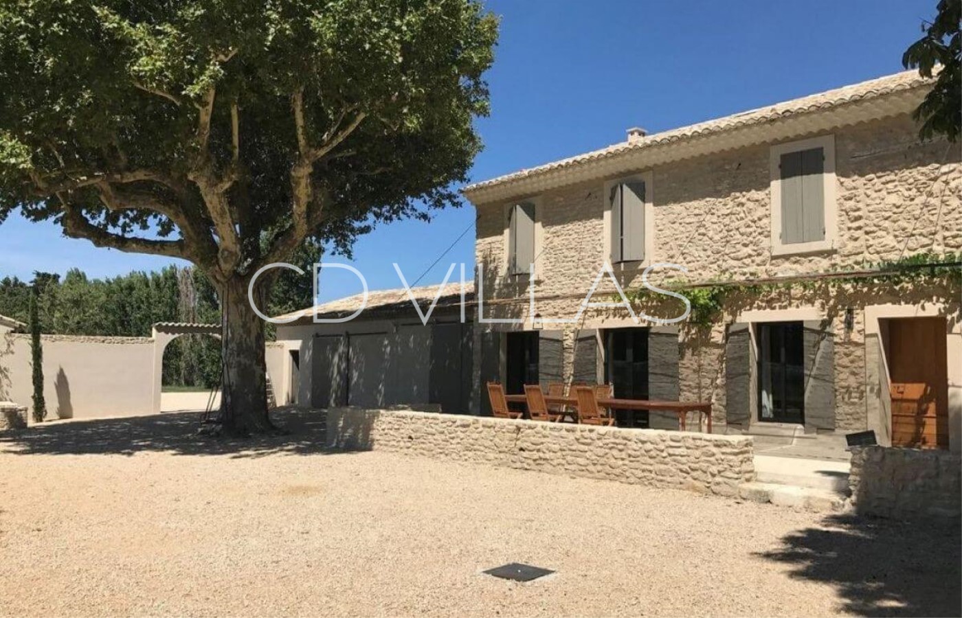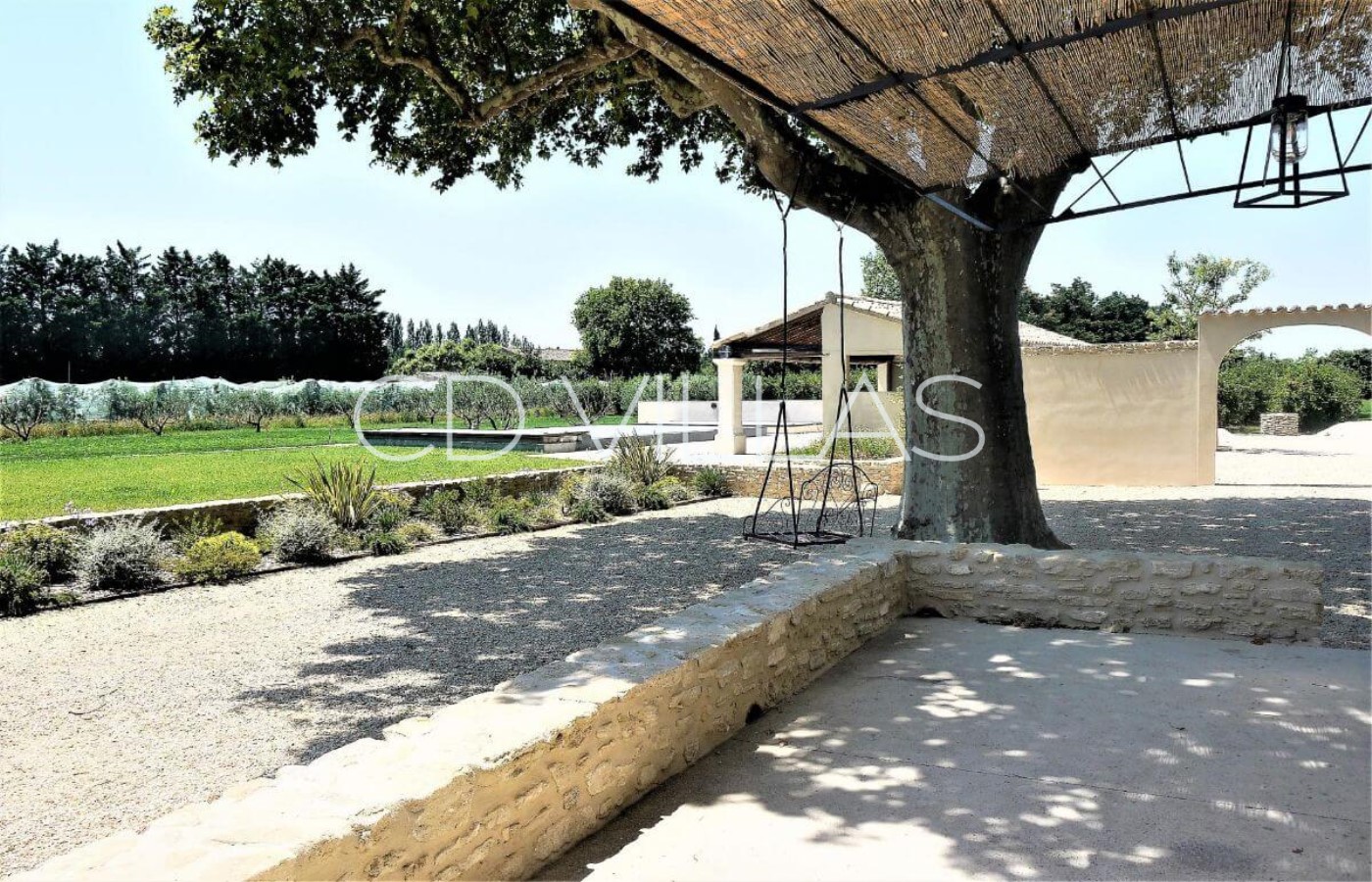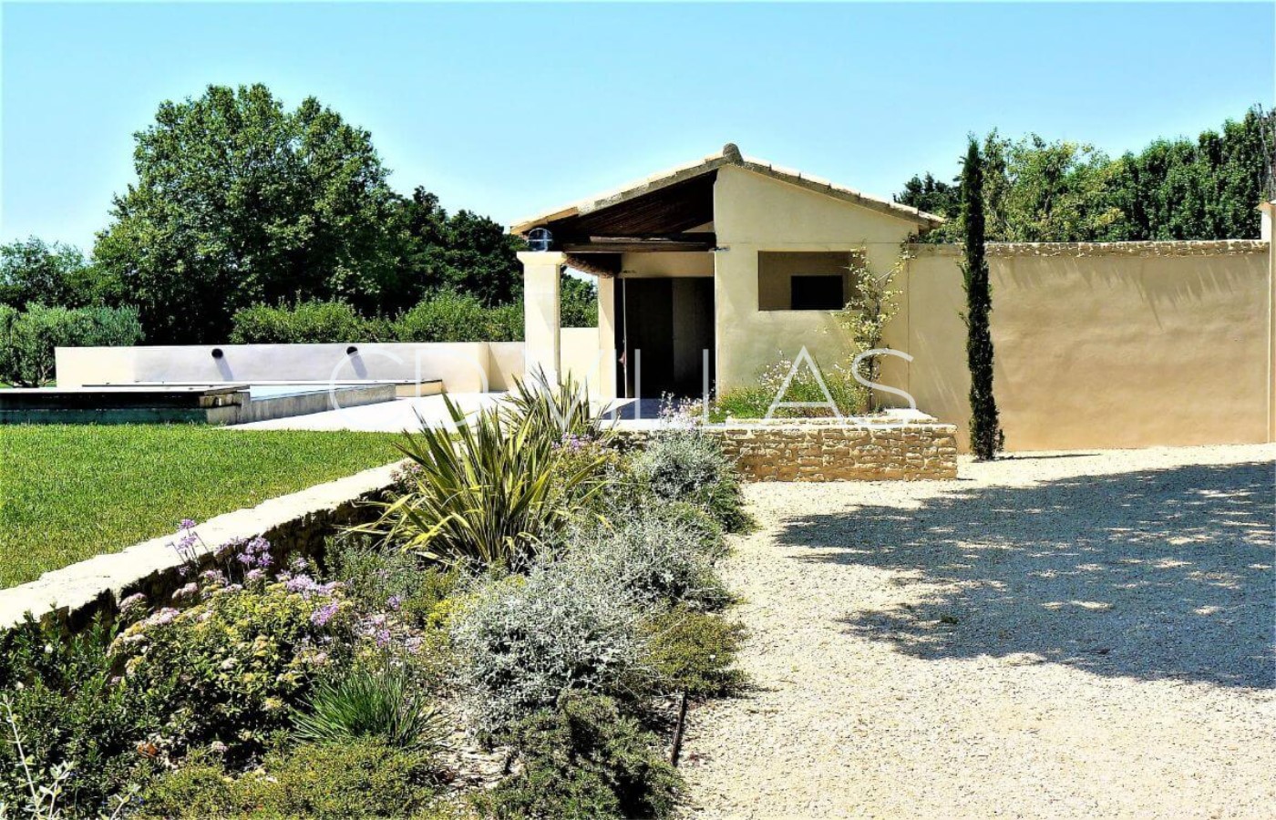 The mas is set in the countryside and boasts grounds of just under a hectare in size, which are surrounded by orchards of mainly apple trees. The garden itself, with olive trees, Mediterranean plants and an aged plane tree, is well maintained and features a covered overflow swimming pool with beach for young children, a large pool house with shower, basin and WC and a shaded terrace immediately to the front of the property.