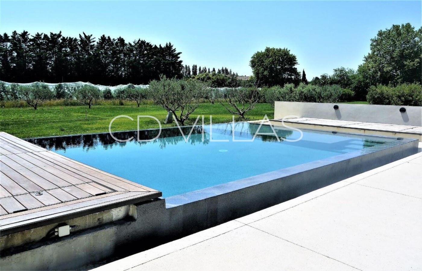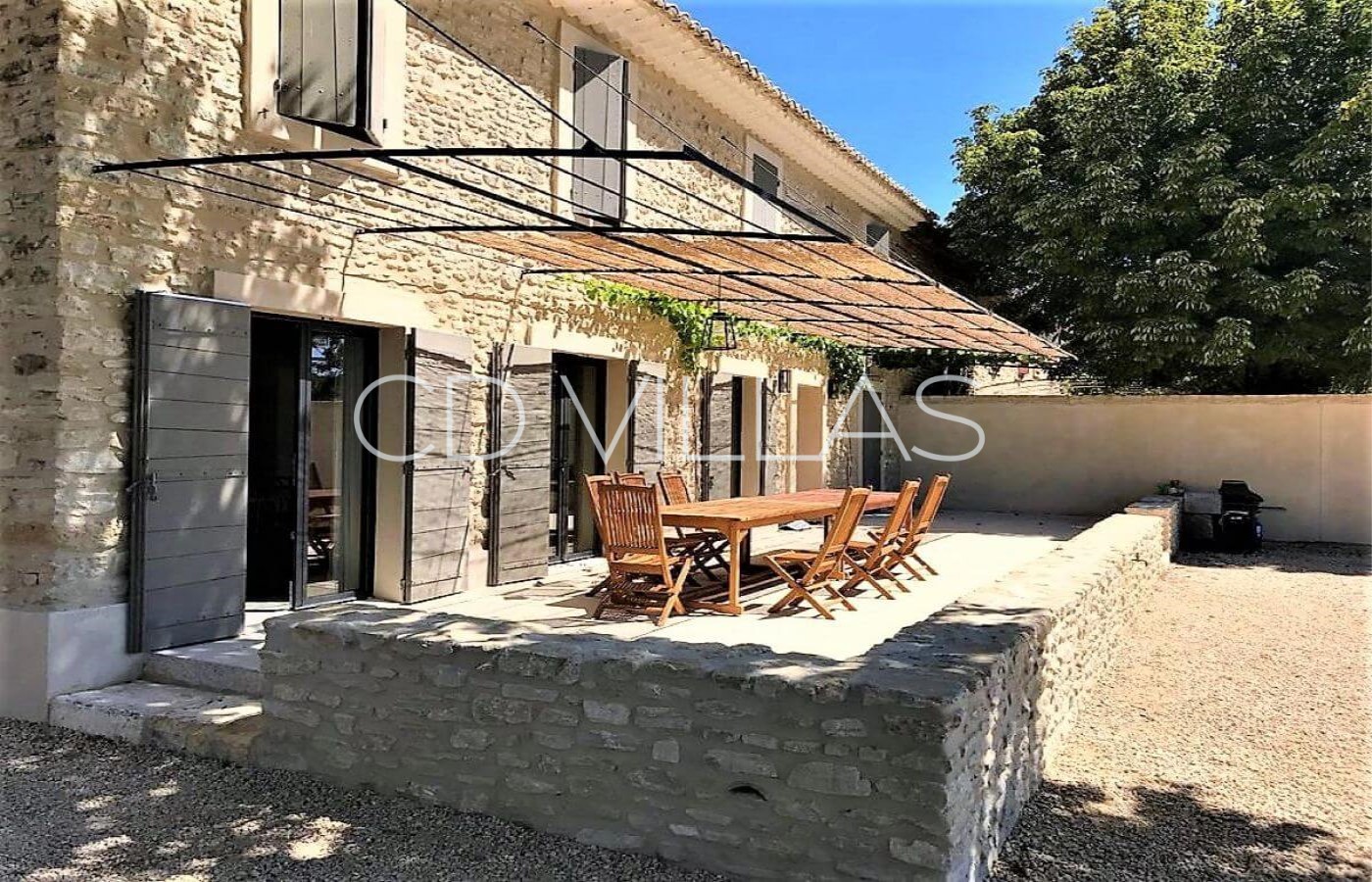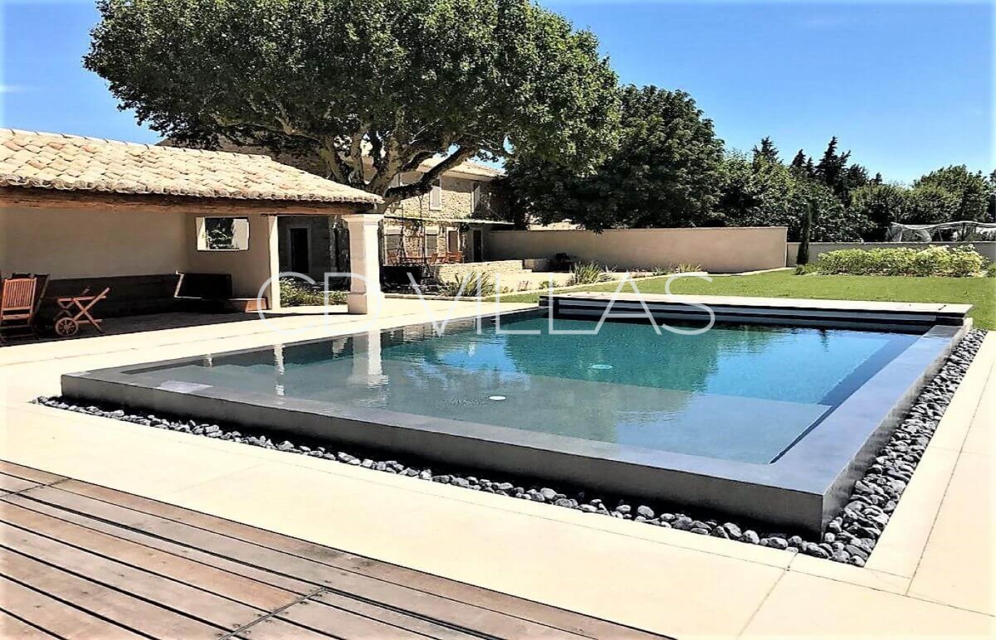 The mas is set in the countryside and boasts grounds of just under a hectare in size, which are surrounded by orchards of mainly apple trees. The garden itself, with olive trees, Mediterranean plants and an aged plane tree, is well maintained and features a covered overflow swimming pool with beach for young children, a large pool house with shower, basin and WC and a shaded terrace immediately to the front of the property.