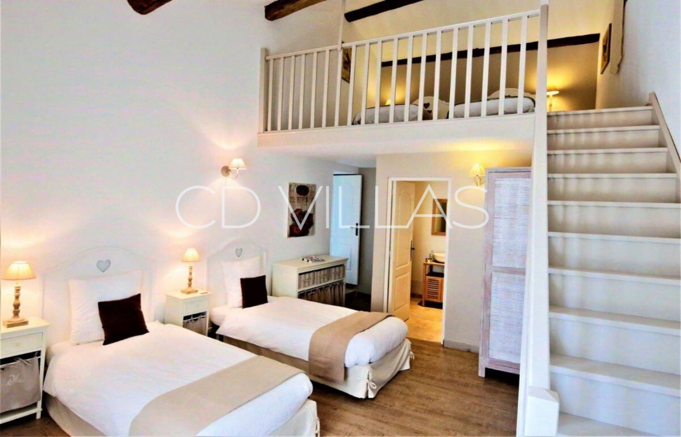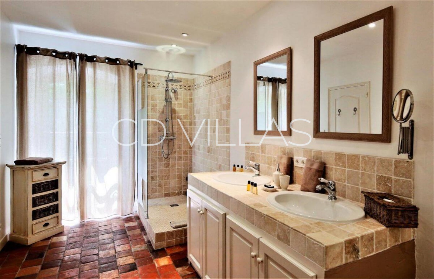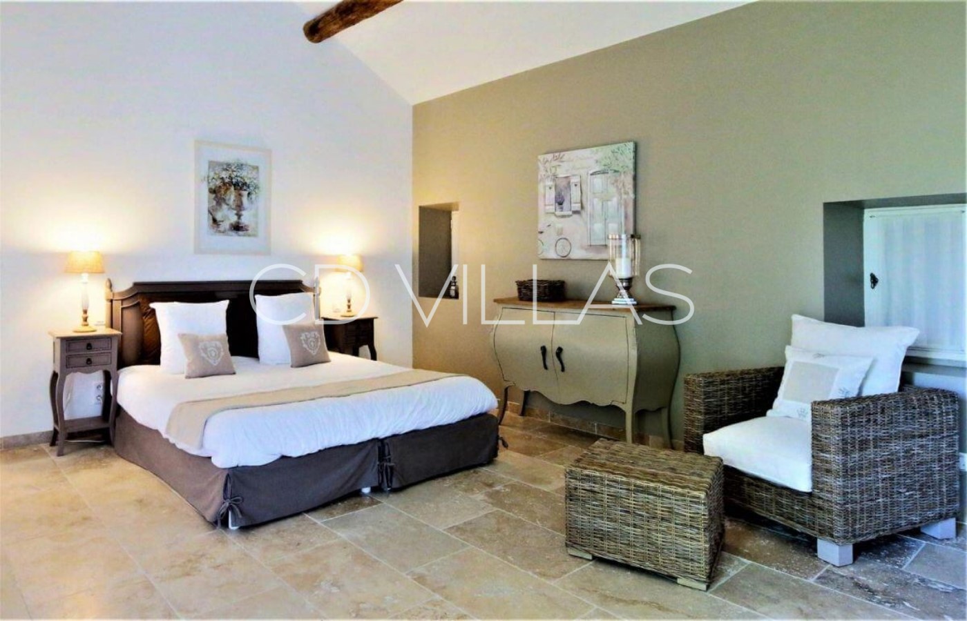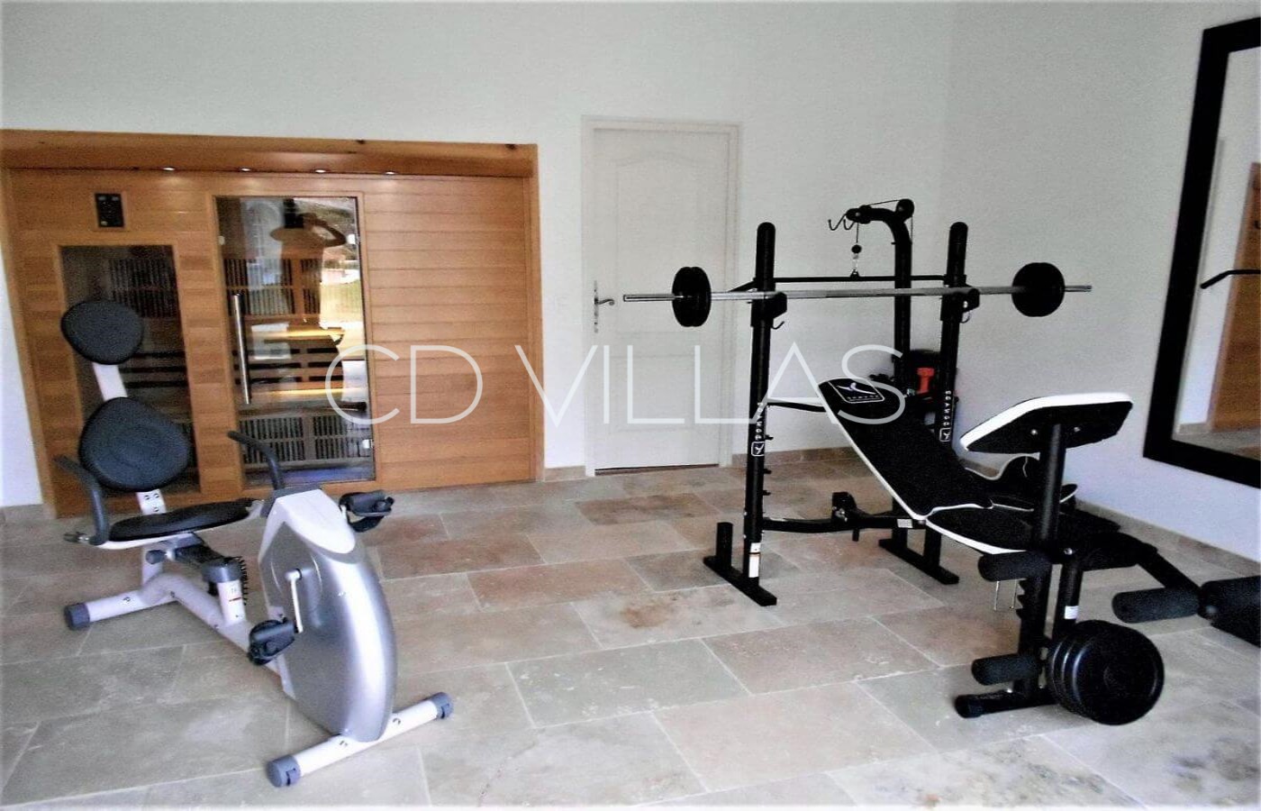 Other impressive features to note are the immense 100 sqm summer lounge with 6 metre high ceiling, which features a fully equipped summer kitchen, including American fridge/freezer, range, gas BBQ, plancha and dishwasher, a magnificent dining table that can seat up to 24 people, a large Provencal fireplace, a TV, DVD, Home Cinema and large wrought iron French windows that overlook the pool, garden and pretty central fountain. Next door to which, is a fully equipped fitness room, with sauna, exercise machines, CD player, walk-in shower and separate WC.