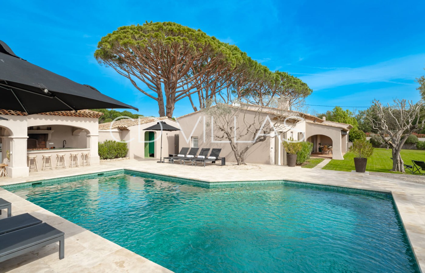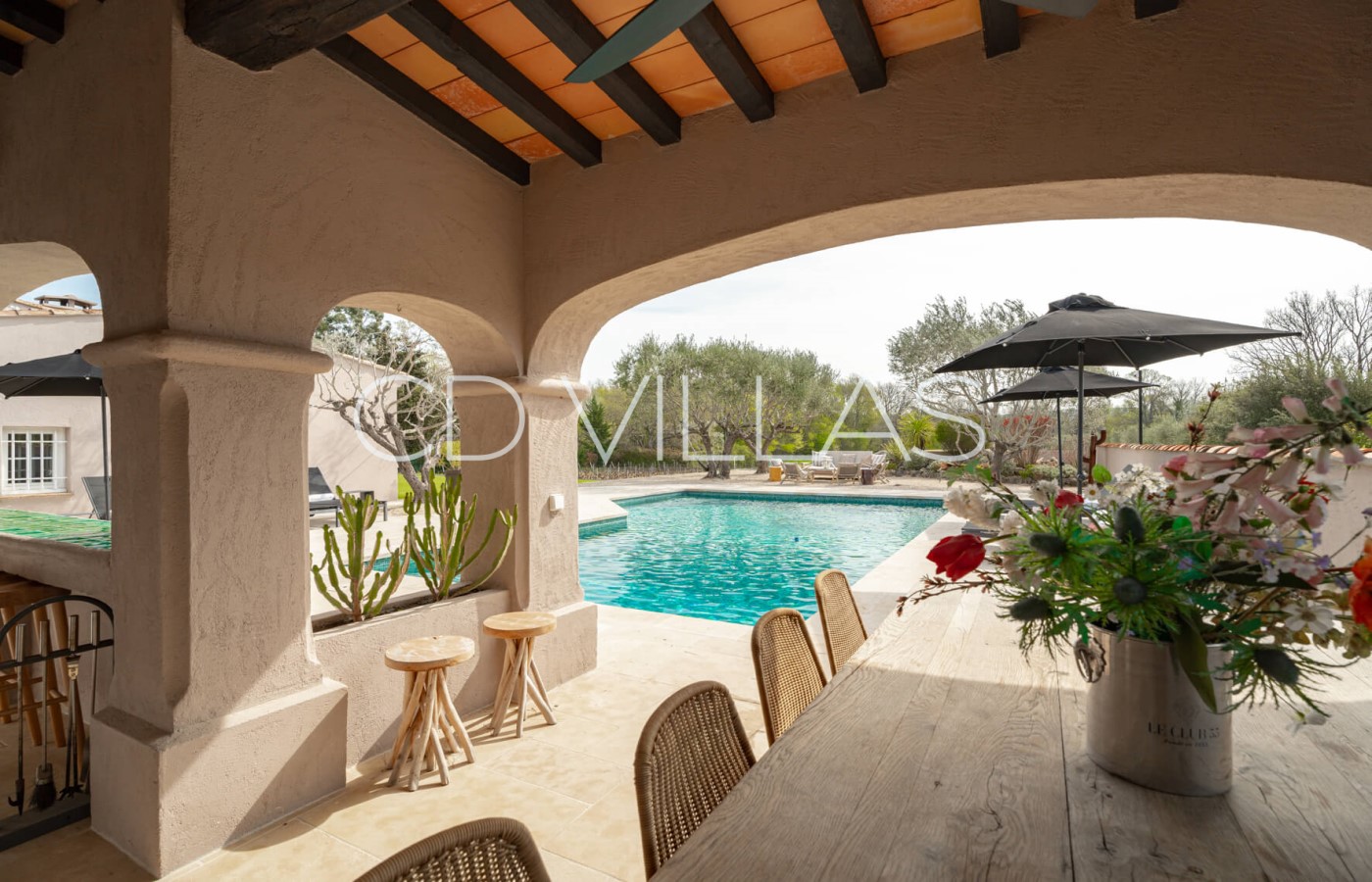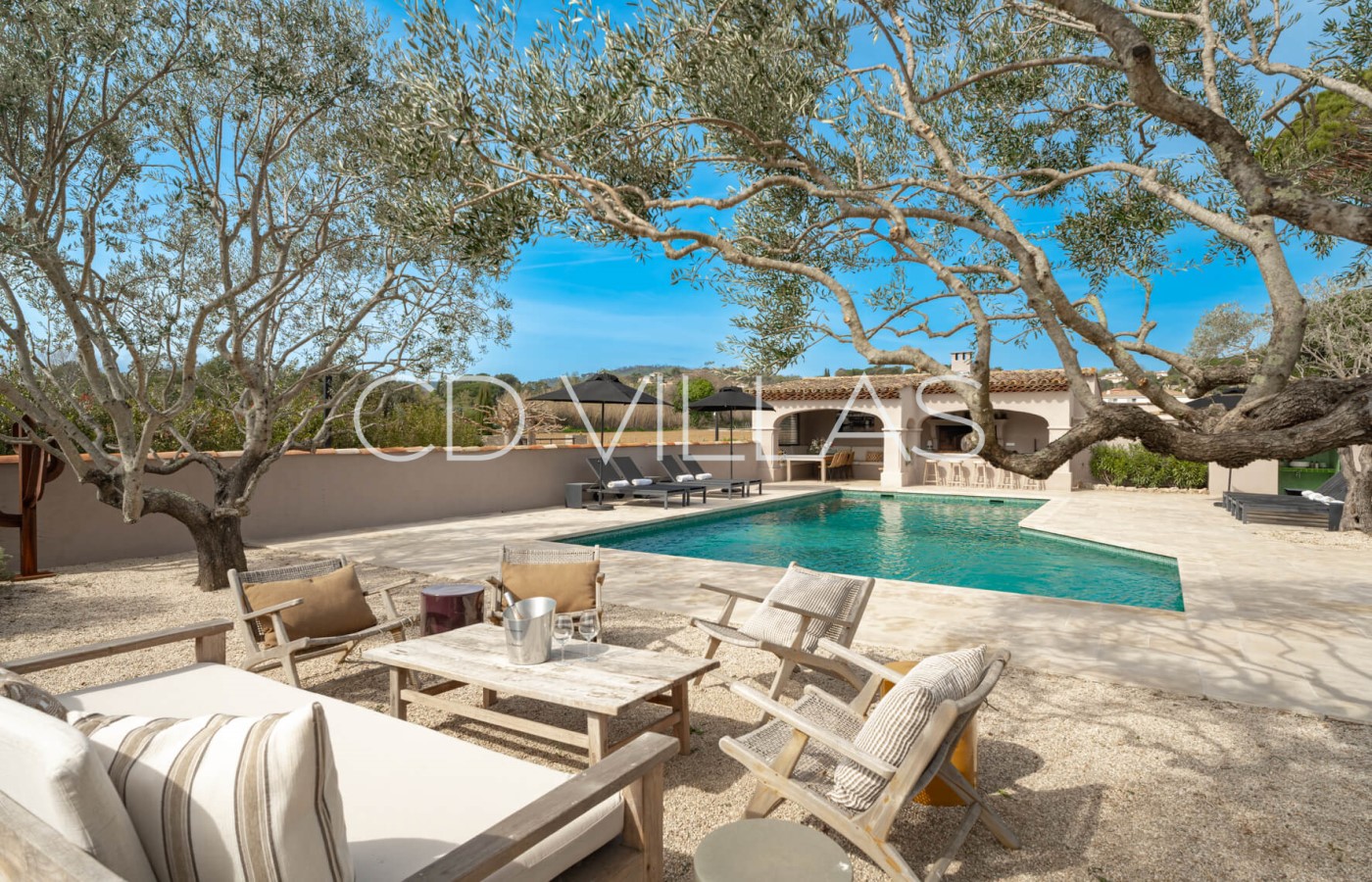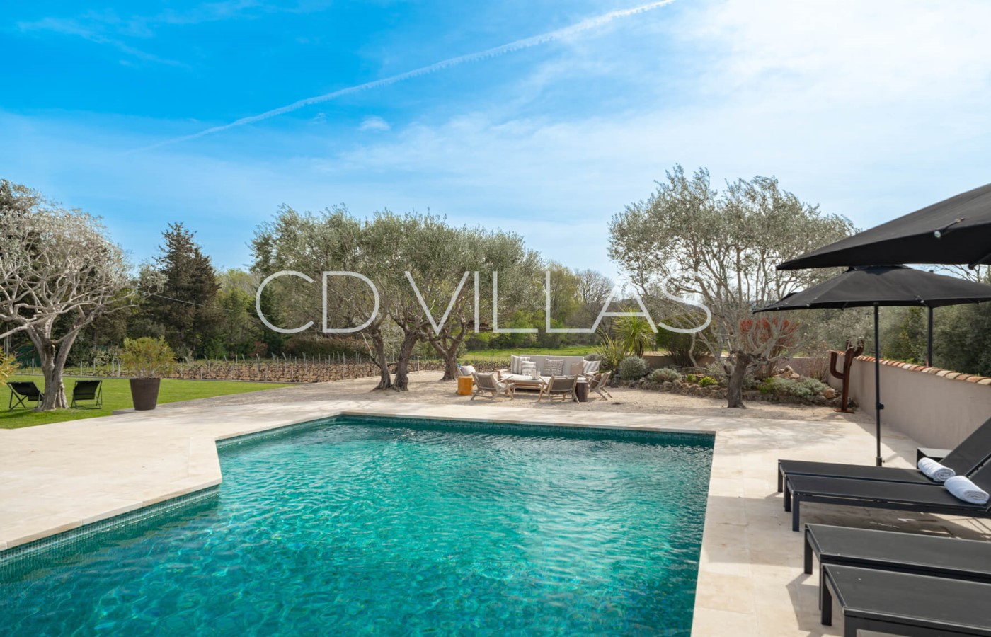 Villa Les Vergerets a traditional property renovated with authentic features while keeping some Provencal charms. Outside there is a large pool which is boardered by landscaped gardens , with olive trees , mediterranean plants and a soft grassy lawn. The pool terrace is leading to the pool house and outdoor kitchen equipped with a traditional BBQ, dishwasher, bar area and dining table in a shaded spot ideal for a peaceful lunch or dinner overlooking on its own vineyard, all inviting a flowing in out lifestyle.