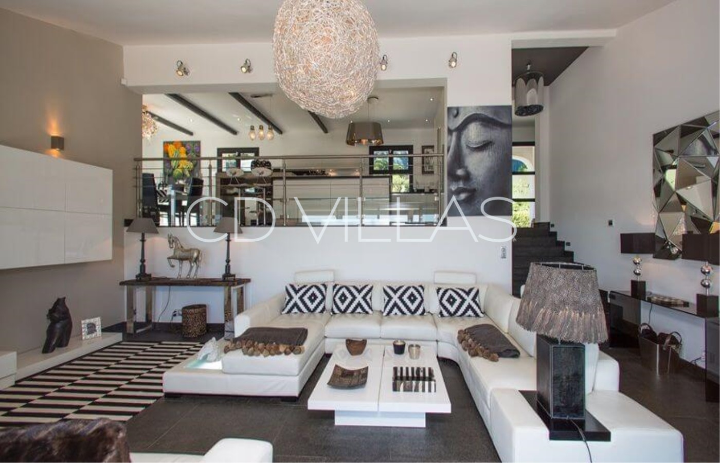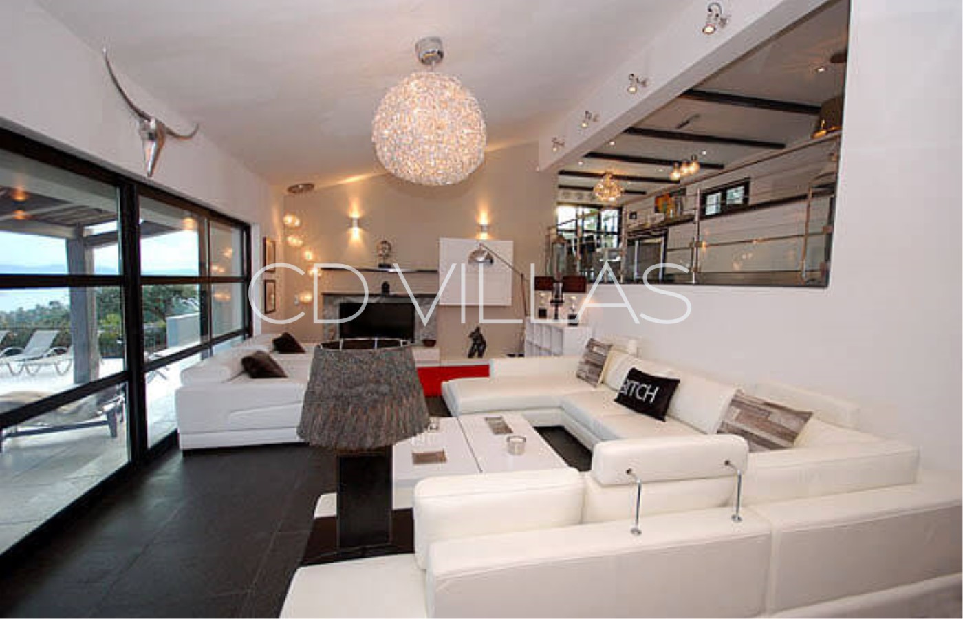 Living Room - with large sofas, flat screen TV. Opens onto the terrace with pool and summer lounge. With seaview