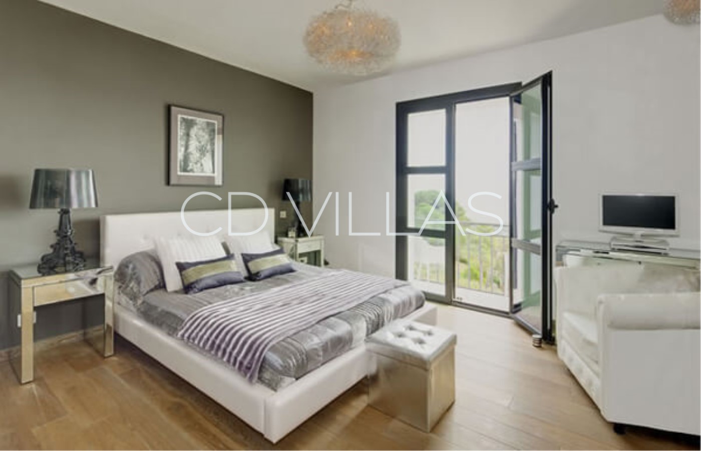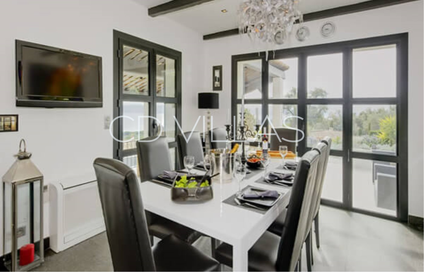 The villa is set in spacious fully enclosed private grounds with electric gates and parking for several cars. The gardens are stepped and include lavender beds, olive trees and even a small vineyard. The 5 x 10 metre azur blue pool is edged with giant white pebbles and the quality wood decking is furnished with several different seating areas with sofas, sun beds and there is a pergola covered outside dining area.