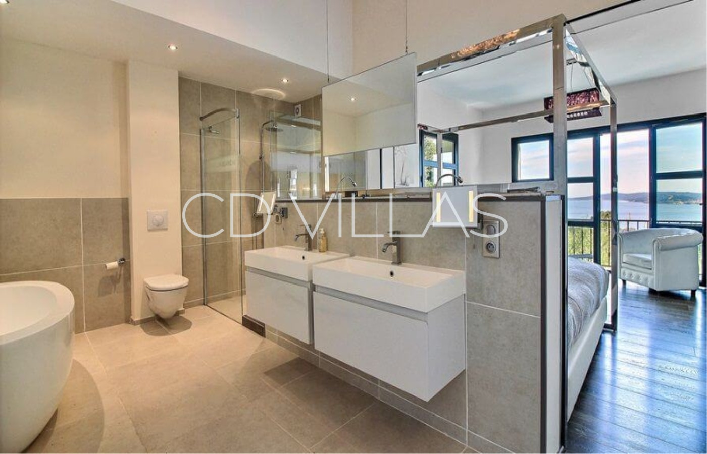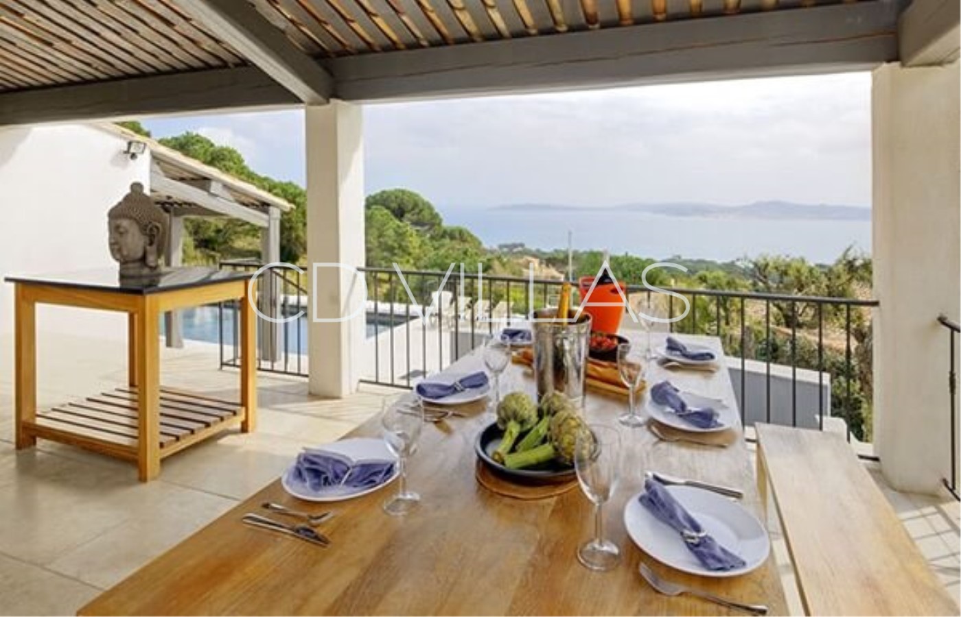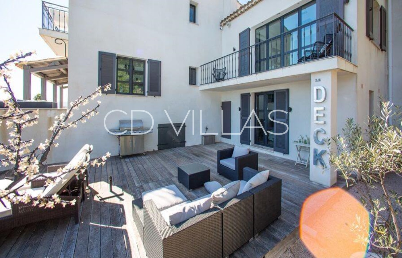 The open common room is split over 2 levels with a large living room opening onto the terrace and a fully equipped kitchen with a dining table and opening on a large shaded terrace with an outdoor dining table to enjoy alfresco dining while enjoying the view of the Bay of Saint Tropez