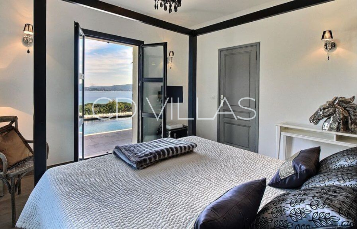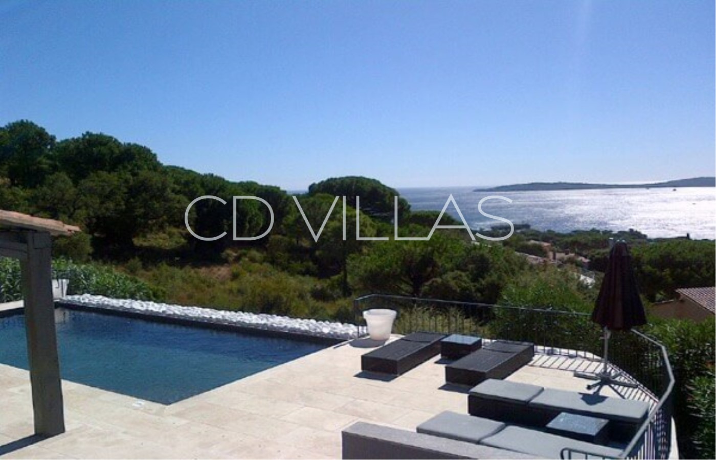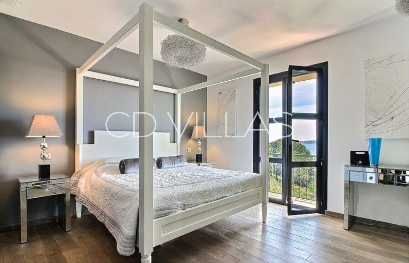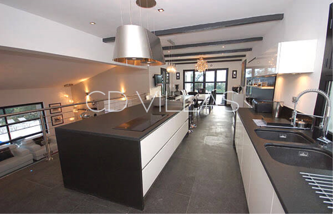 The open common room is split over 2 levels with a large living room opening onto the terrace and a fully equipped kitchen with a dining table and opening on a large shaded terrace with an outdoor dining table to enjoy alfresco dining while enjoying the view of the Bay of Saint Tropez