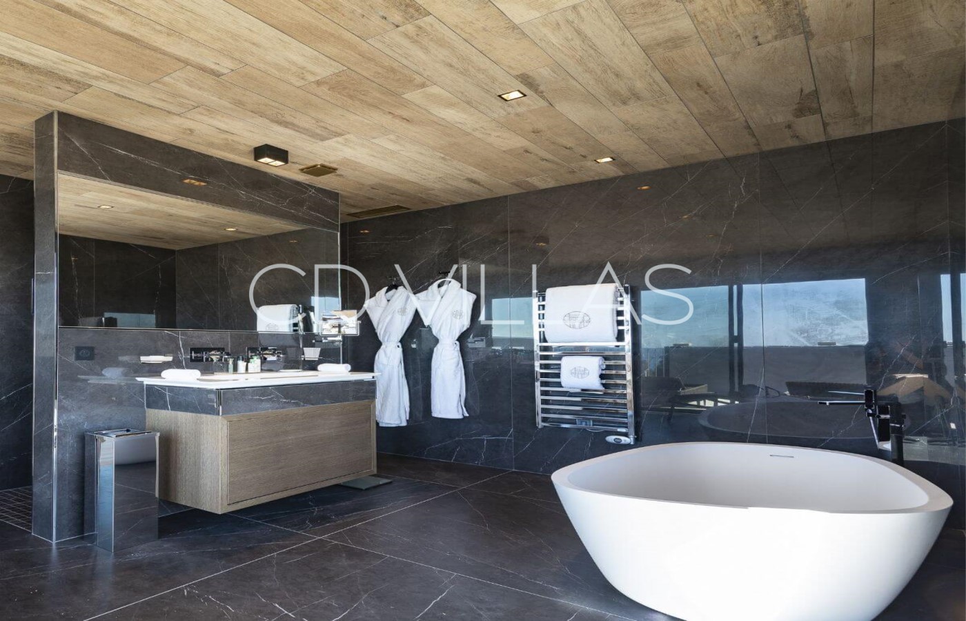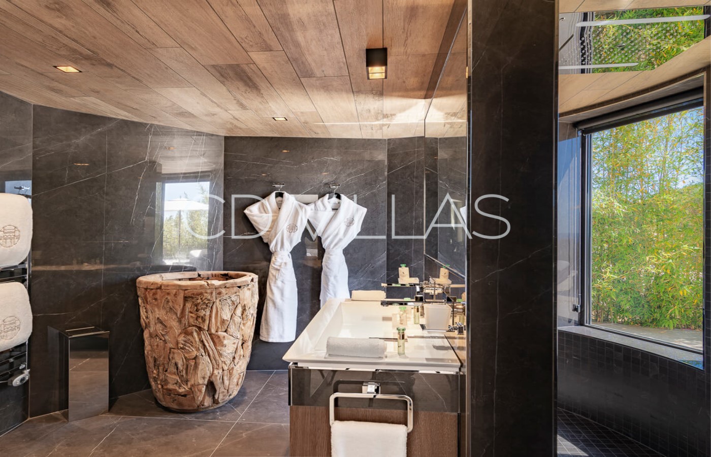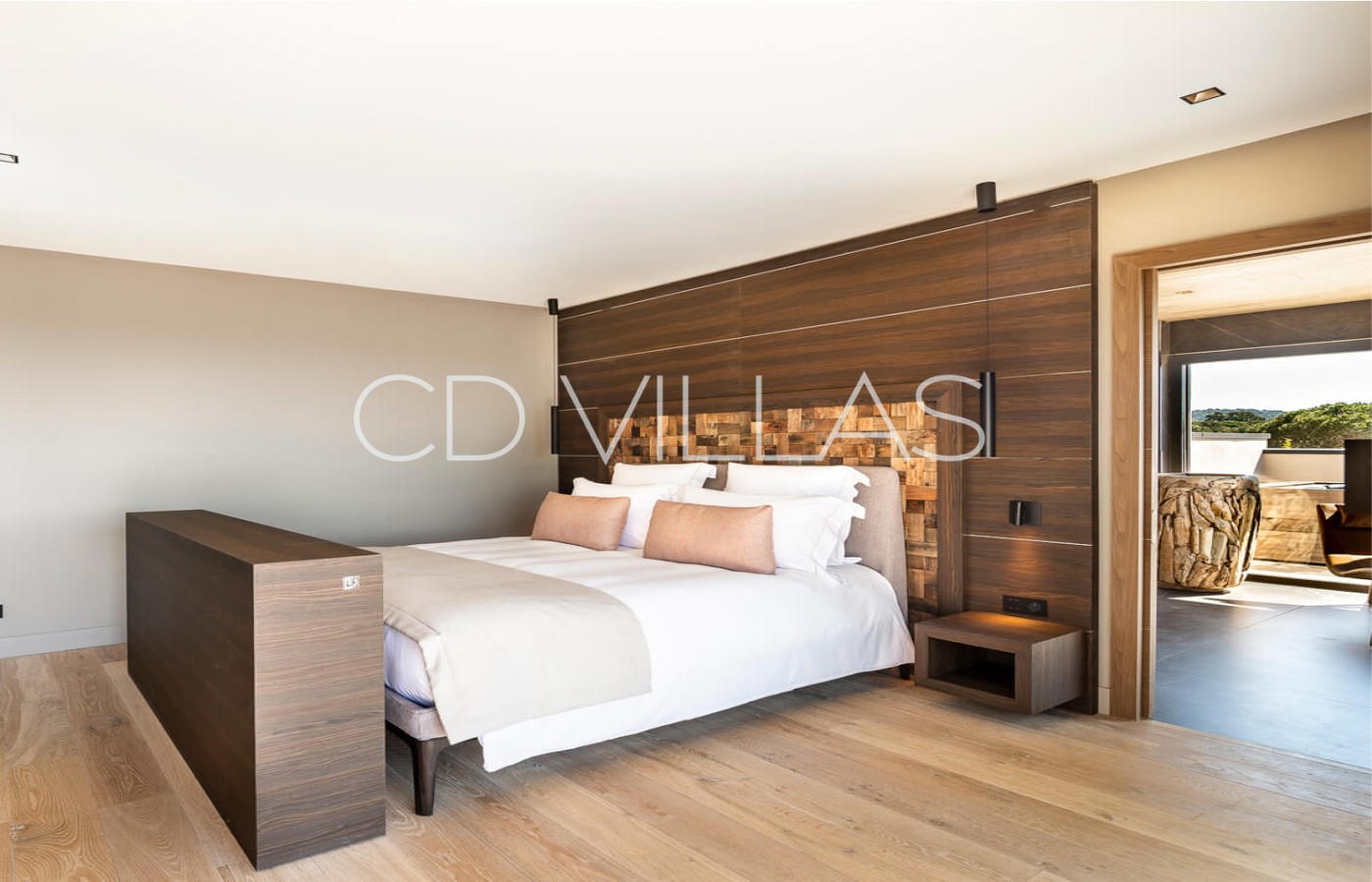 Bedroom 1 - Extra Large Double Bed with ensuite bathroom, fitted wardrobe, AC. Private terrace with sun lounges and jacuzzi