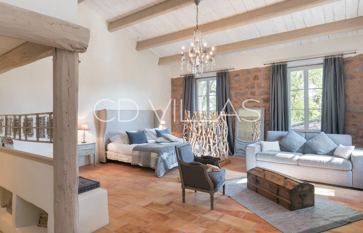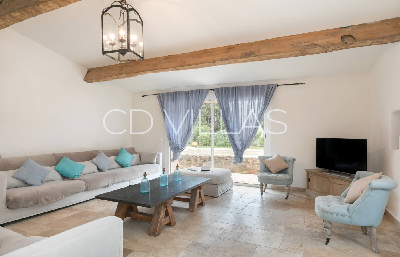 The bastide is beautifully furnished in contemporary rustic style, and the ground floor houses a large fully equipped farmhouse kitchen, a spacious dining room and 2 comfortable living rooms, one with a fireplace and the other with French windows opening onto the outdoor terrace.