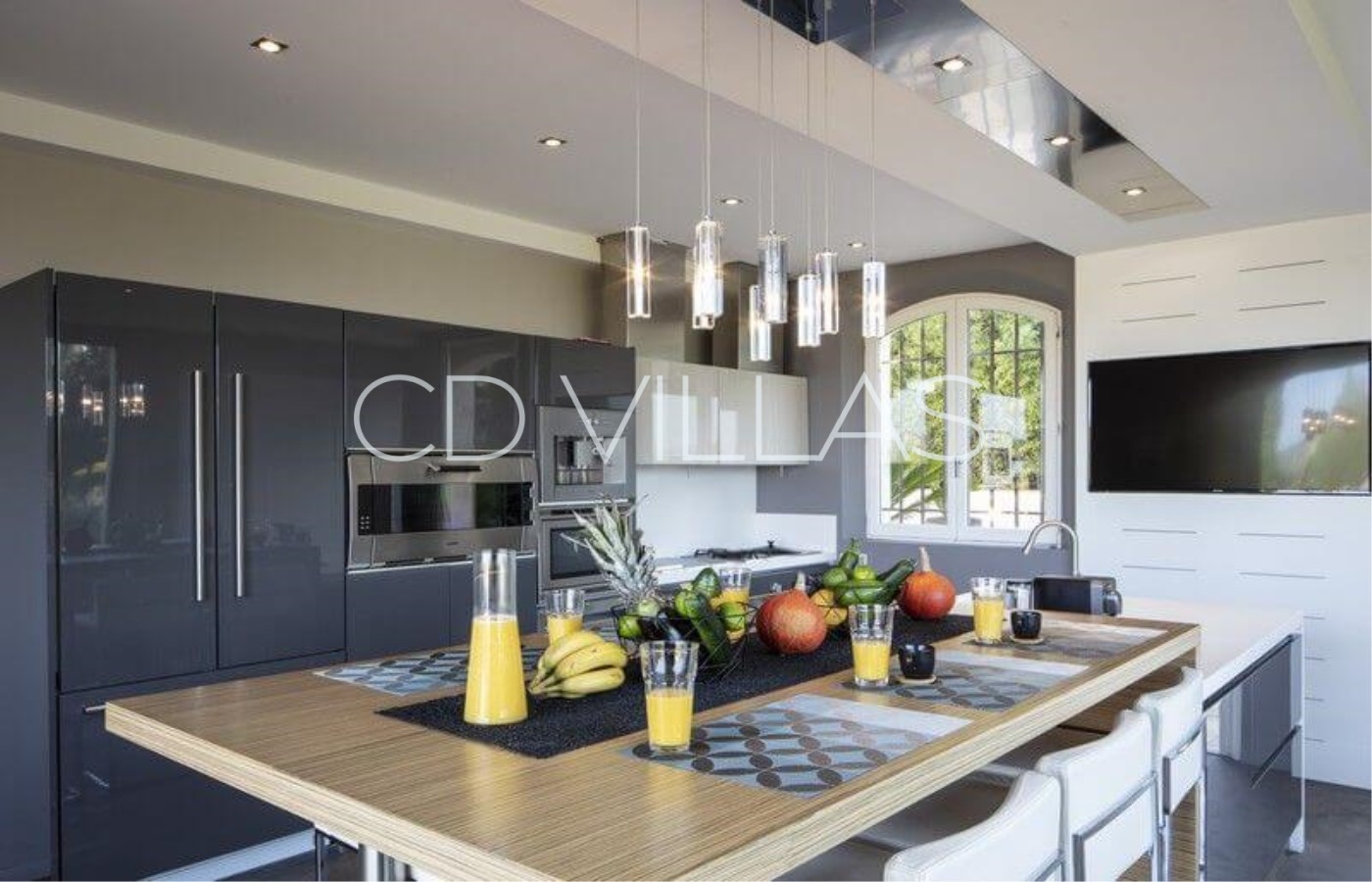 The kitchen is equipped with an extra large oven, microwave, wall integrated coffee machine, Nespresso coffee machine, toaster, kettle, wine cellar, fridge/freezer, dishwasher, teppanyiaki, induction hot plates, gas rings and pasta cooking station. There is a large breakfast bar with stools to enjoy a cup of coffee or a healthy breakfast