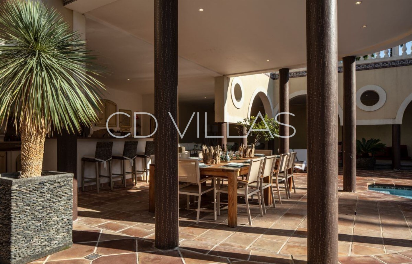 The pool and lounge area is located below the ground floor in a moorish patio. The central 17*7m pool is surrounded by several covered terraces with lounges, sunbeds and a brand new summer kitchen fully fitted with cooking area, large glass fridge, freezer, ice maker, 2 dishwashers, bar, microwave and conventional oven.