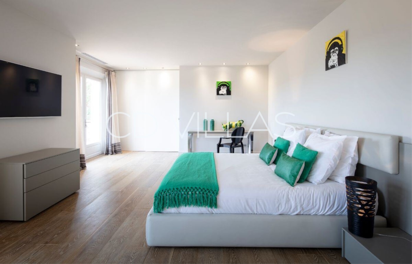 The other 3 bedrooms are on the first floor: Master bedroom with a lounge area, large TV, walk-in closet, full bathroom with shower enclosure, bathtub, double vanity, WC, as well as a large terrace with sun lounges and and seaview.