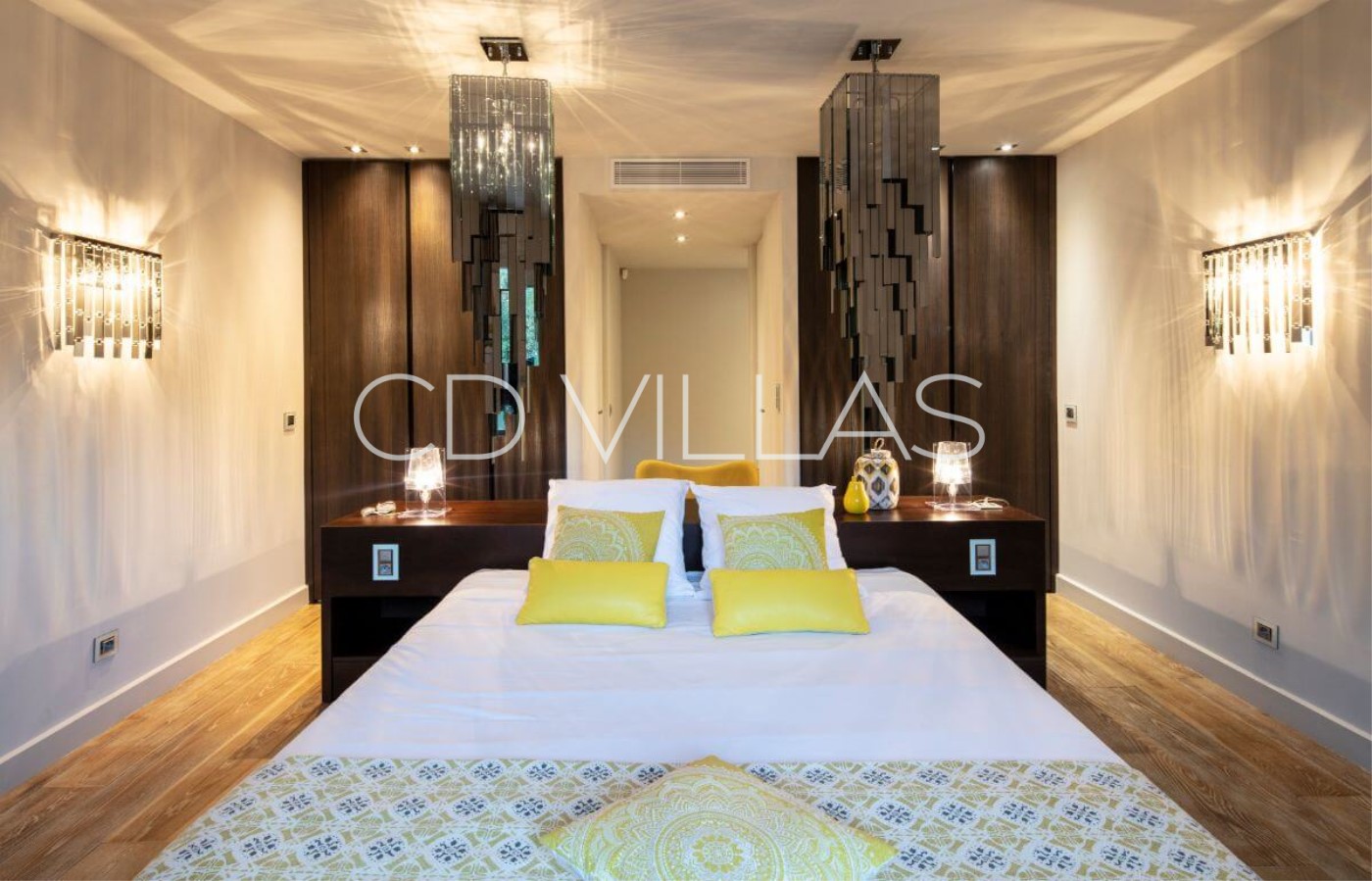 There are 5 bedrooms in the house: 2 on the ground floor; one with a double bed plus a single (which can be turned into 3 singles), with a walk-in closet, an ensuite bathroom (shower enclosure, double vanity, WC) and access to the terrace. The second bedroom is a double room with walk-in closet and ensuite bathroom (bathtub, double vanity and WC).