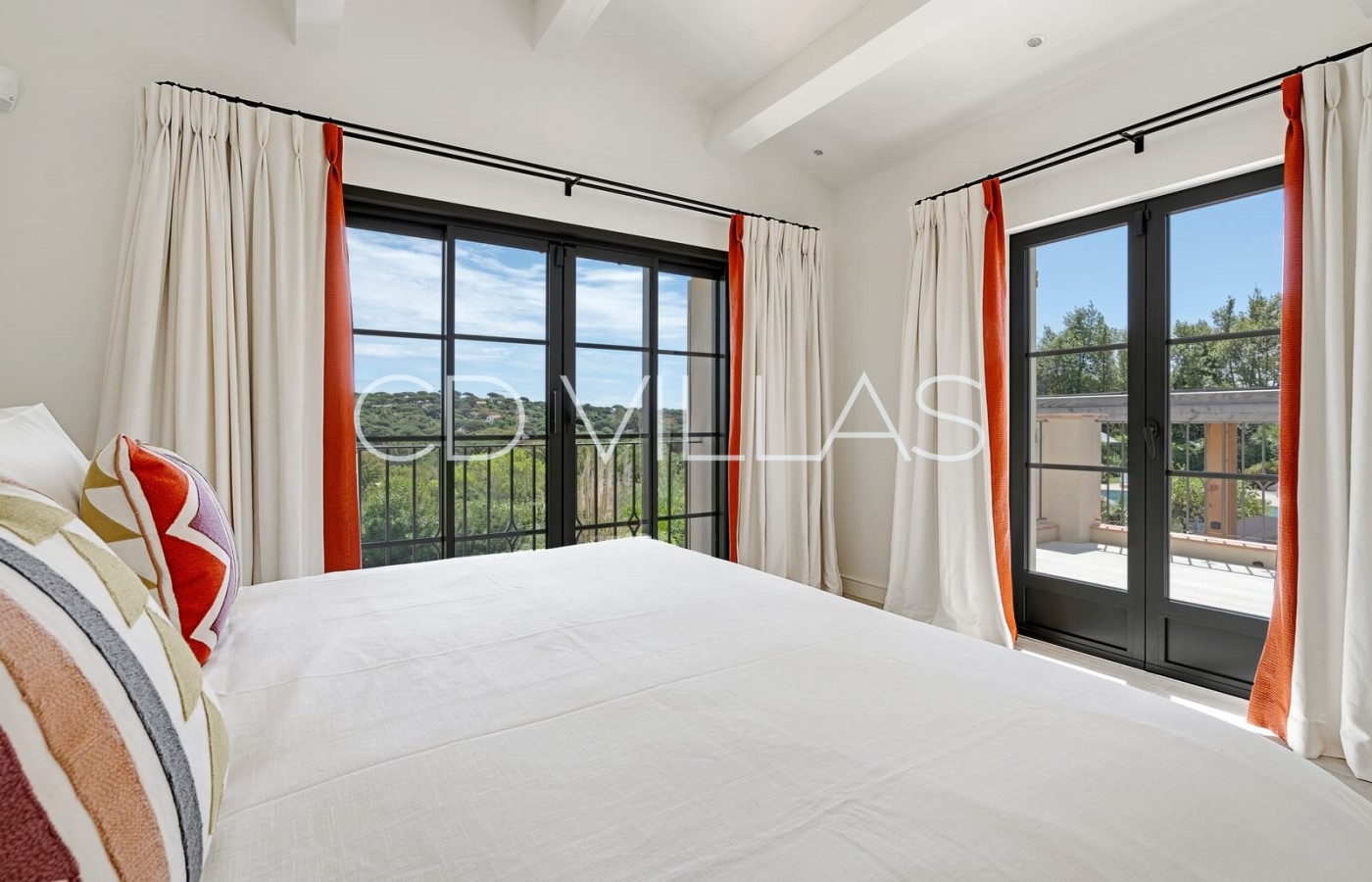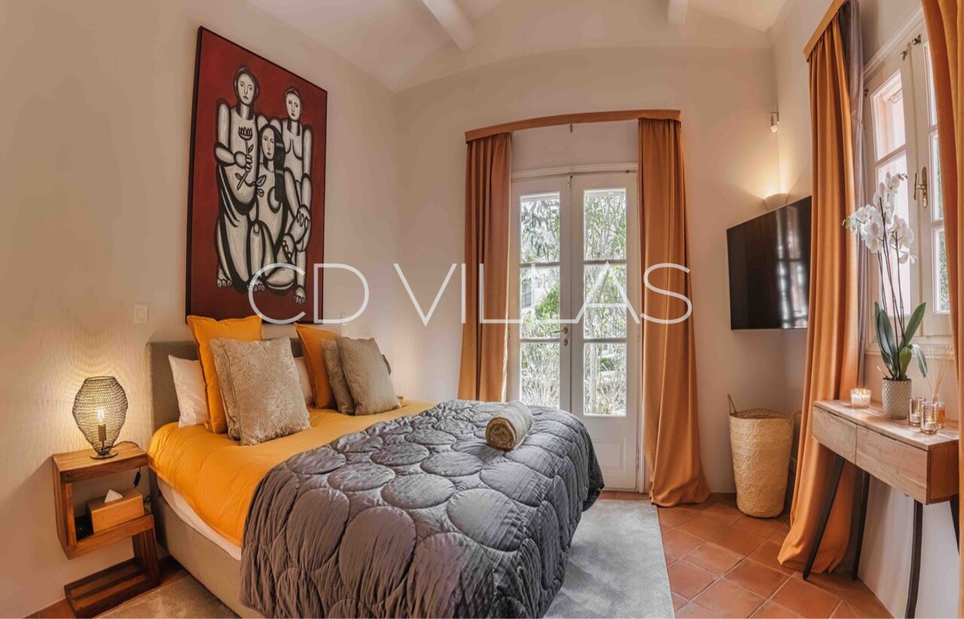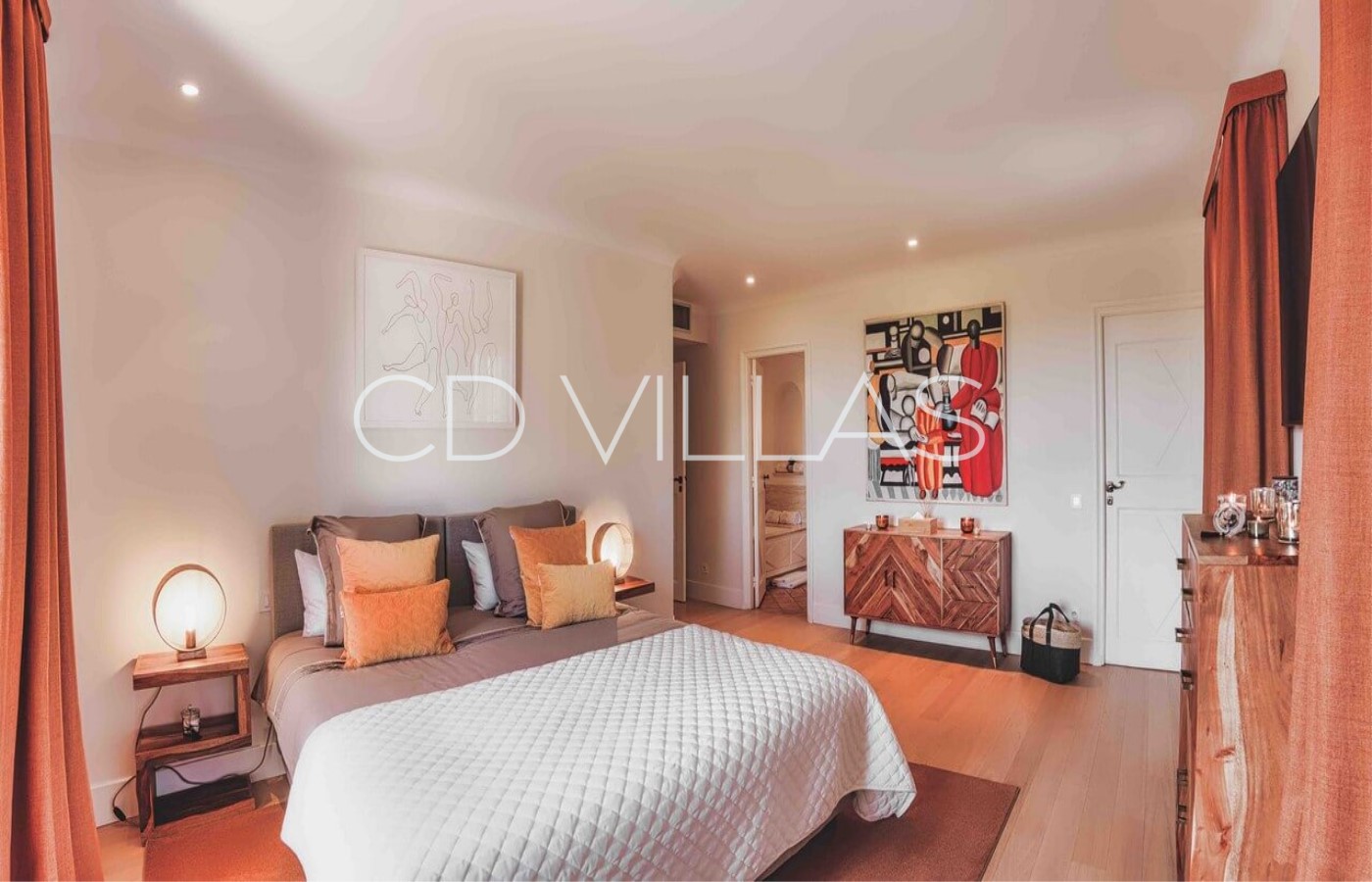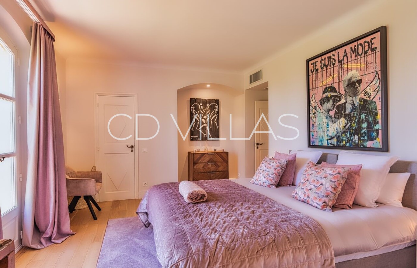 - Master Bedroom "Sirocco" (42 m2), King Size Double Bed 200, Dressing room for Mr, Bathroom for Mr. (Shower, sink, wc), Samsung 75 '' Smart TV, VOD, Satellite TV, Sonos sound system, safe, large dressing room for Madame, bathroom for Madame (Bath, double sink, WC and bidet) access to a terrace and balcony (outdoor lounge under an arbor), full west jaw drop stunning Sea view of the Baie des Canoubiers, the Château Borelli, the Vineyards and the Colline du Capon.