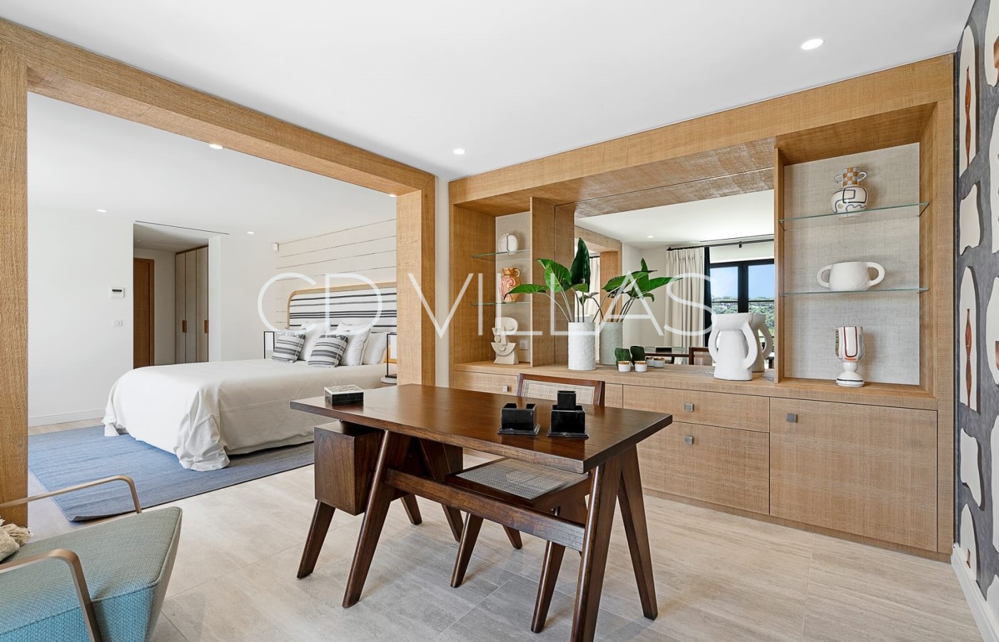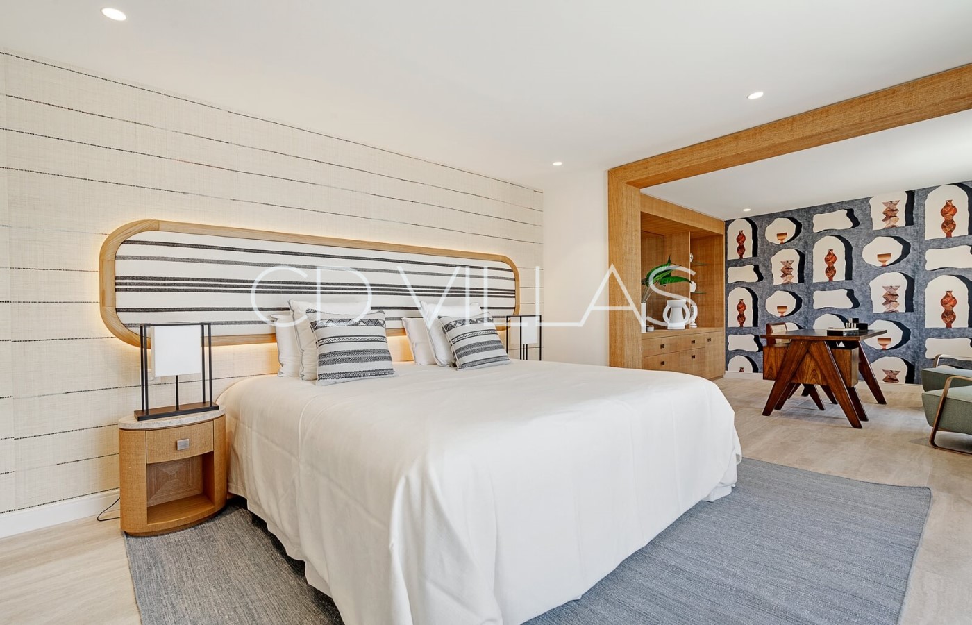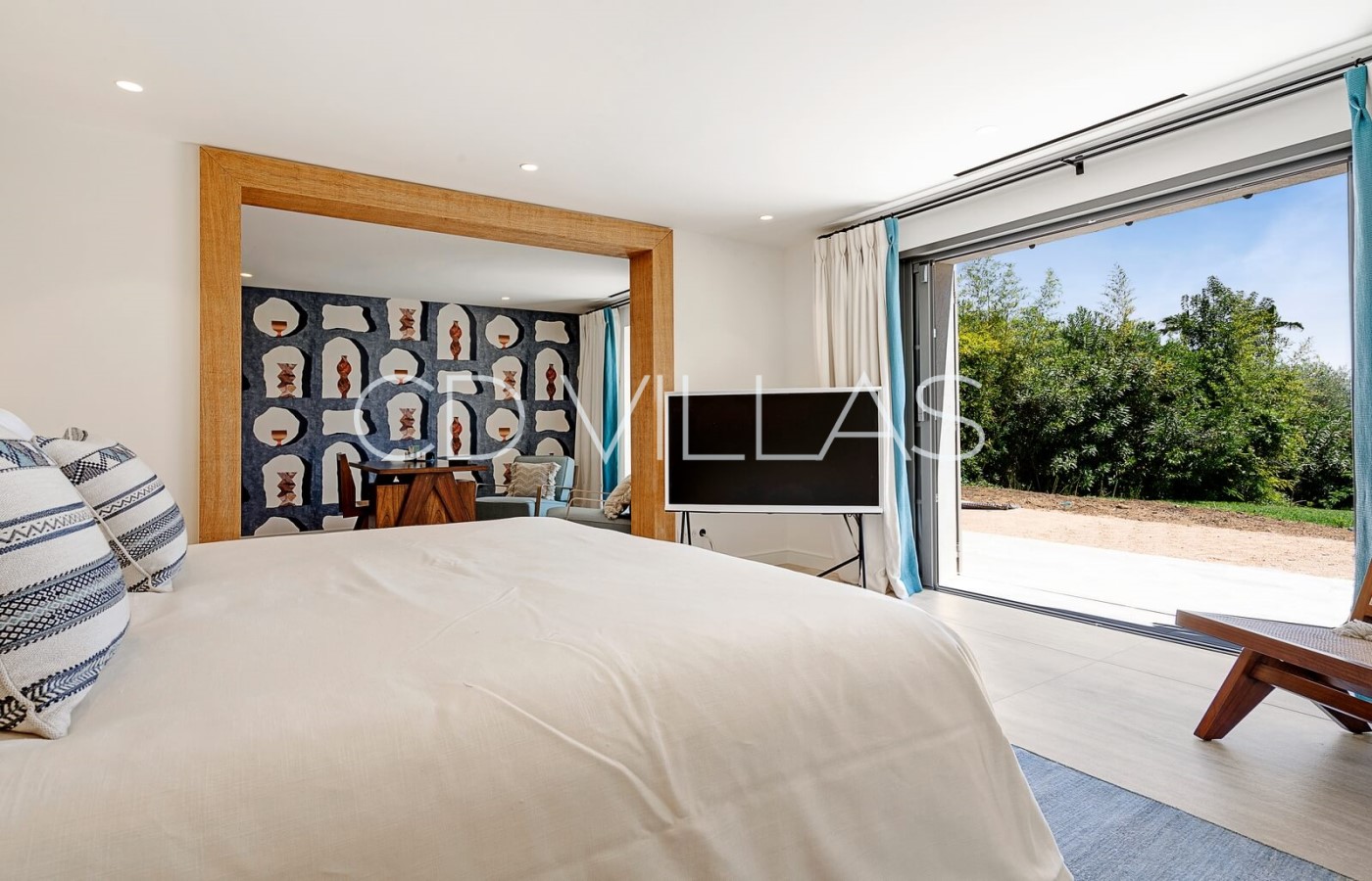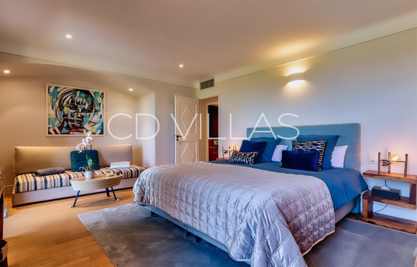 - Master Bedroom "Sirocco" (42 m2), King Size Double Bed 200, Dressing room for Mr, Bathroom for Mr. (Shower, sink, wc), Samsung 75 '' Smart TV, VOD, Satellite TV, Sonos sound system, safe, large dressing room for Madame, bathroom for Madame (Bath, double sink, WC and bidet) access to a terrace and balcony (outdoor lounge under an arbor), full west jaw drop stunning Sea view of the Baie des Canoubiers, the Château Borelli, the Vineyards and the Colline du Capon.