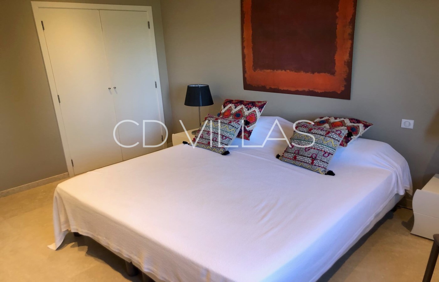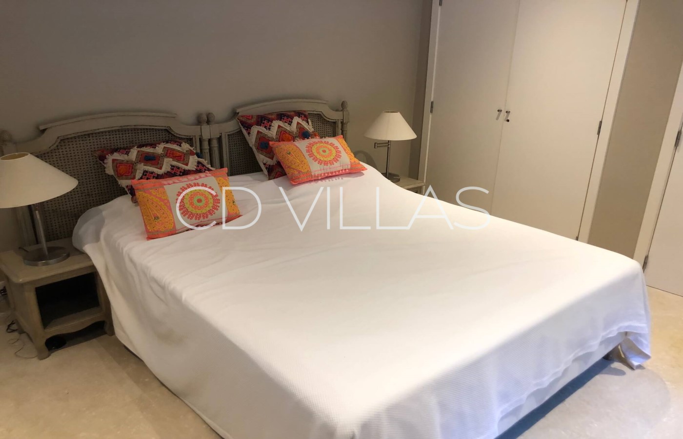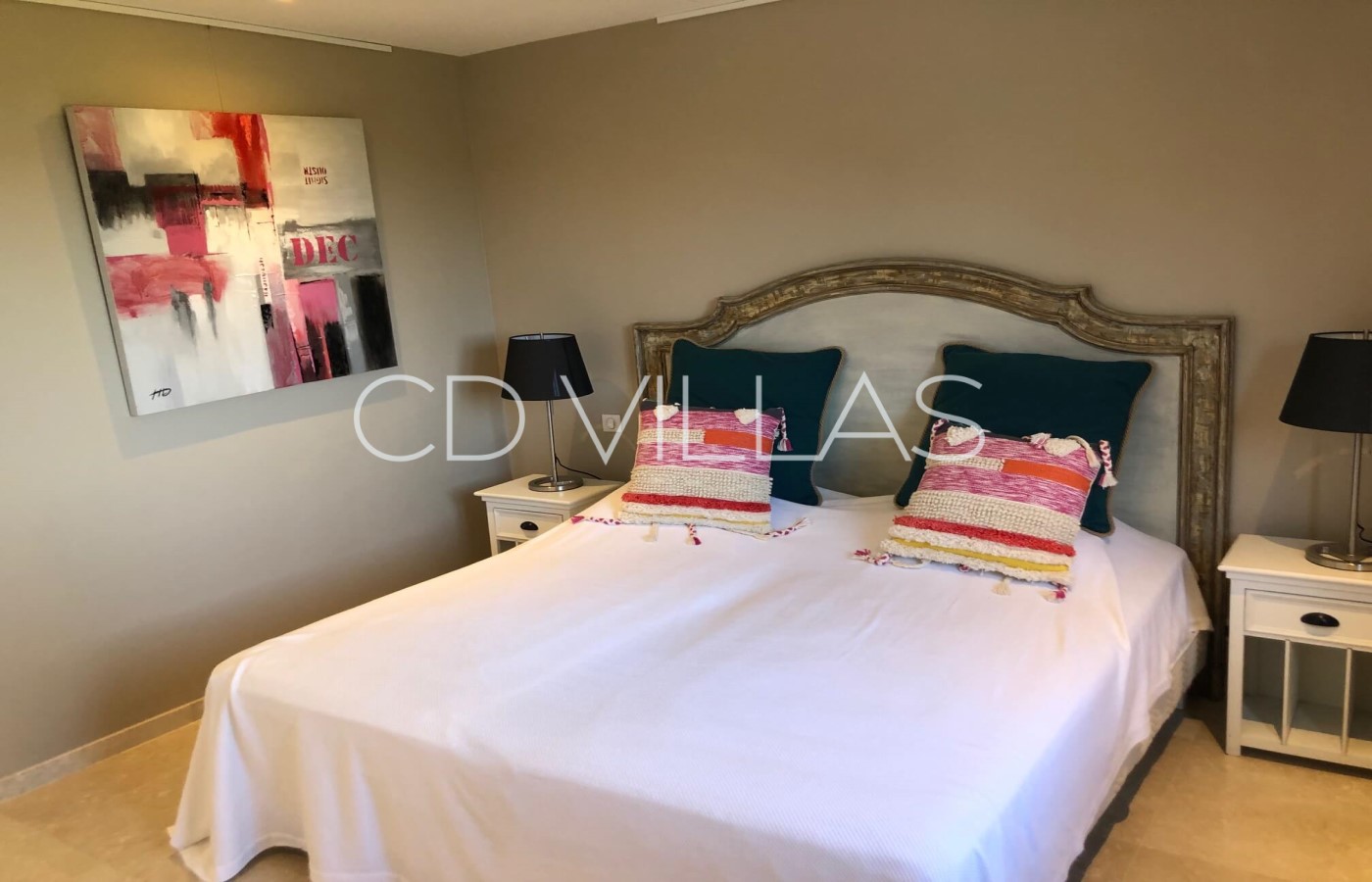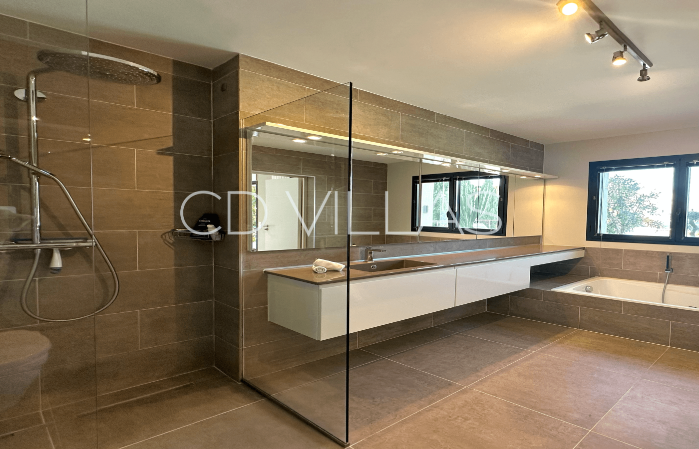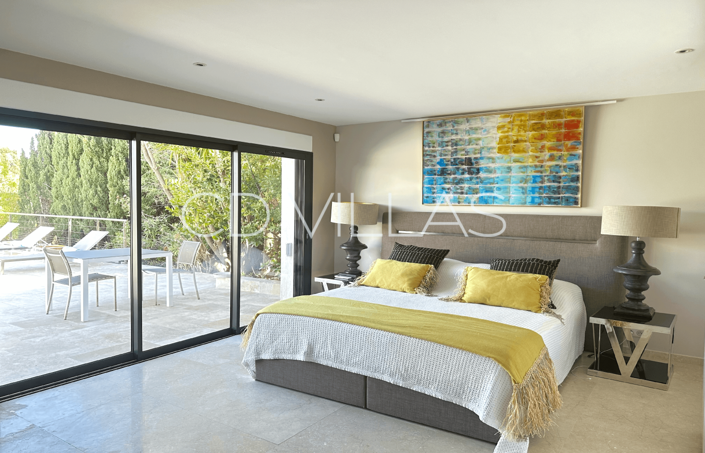 Behind the living room, the Master bedroom with very large sleeping quarters, king size bed, fitted wardrobe, full ensuite bathroom with shower and bathtub, seaview and direct access to the terrace and pool.
