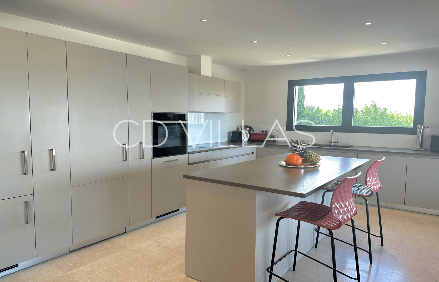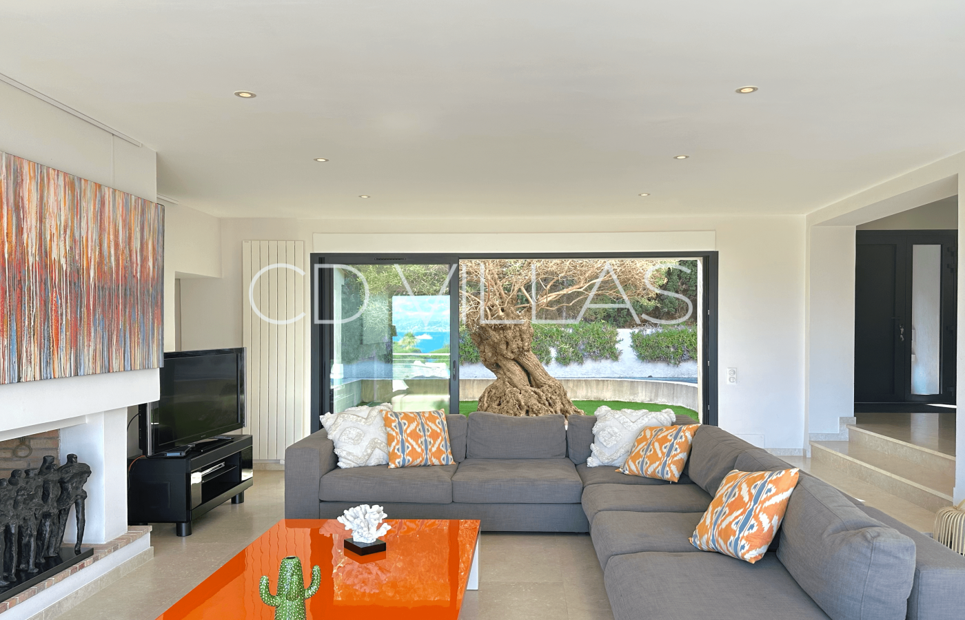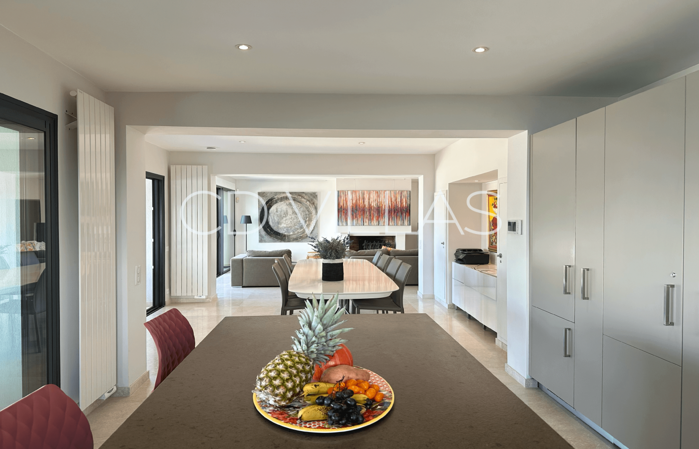 The entrance opens onto a large lobby open to the large living room with comfortable sofas, smart TV, seaview and direct access to the terrace and pool area.