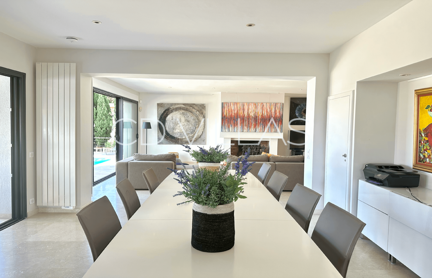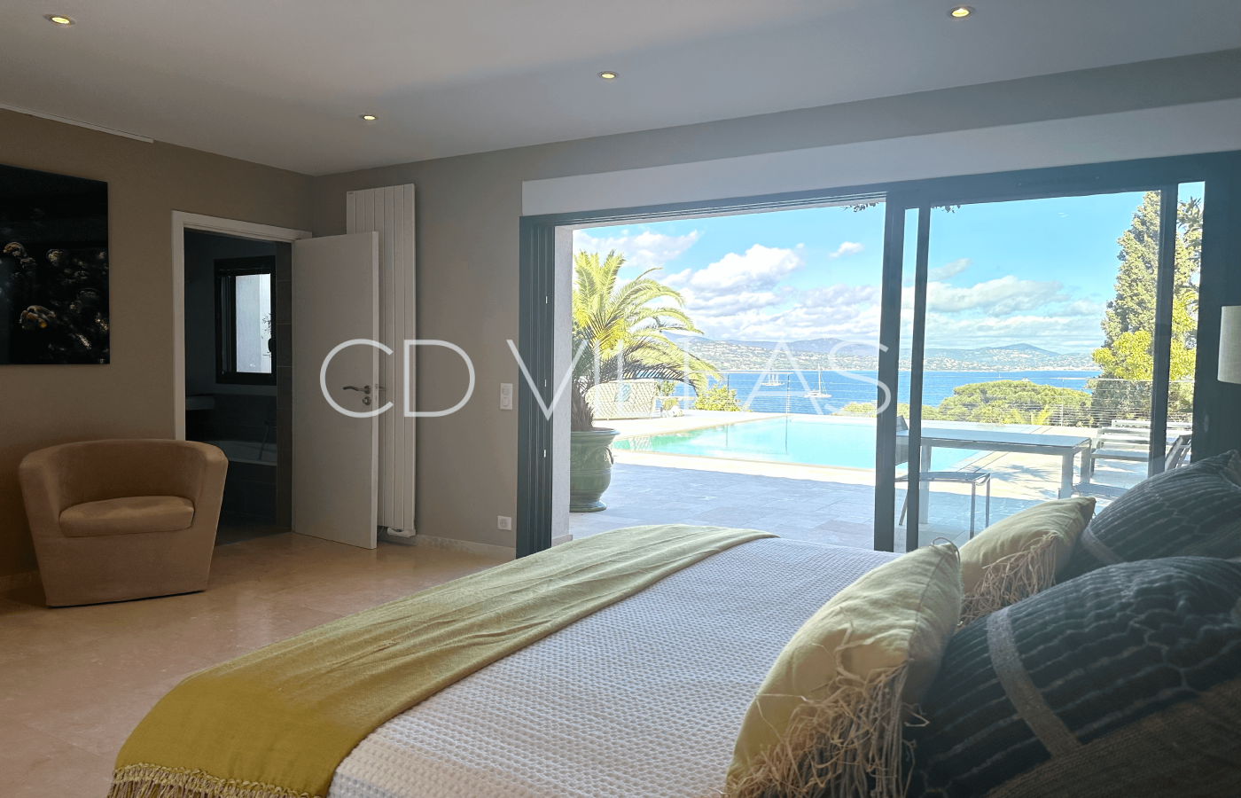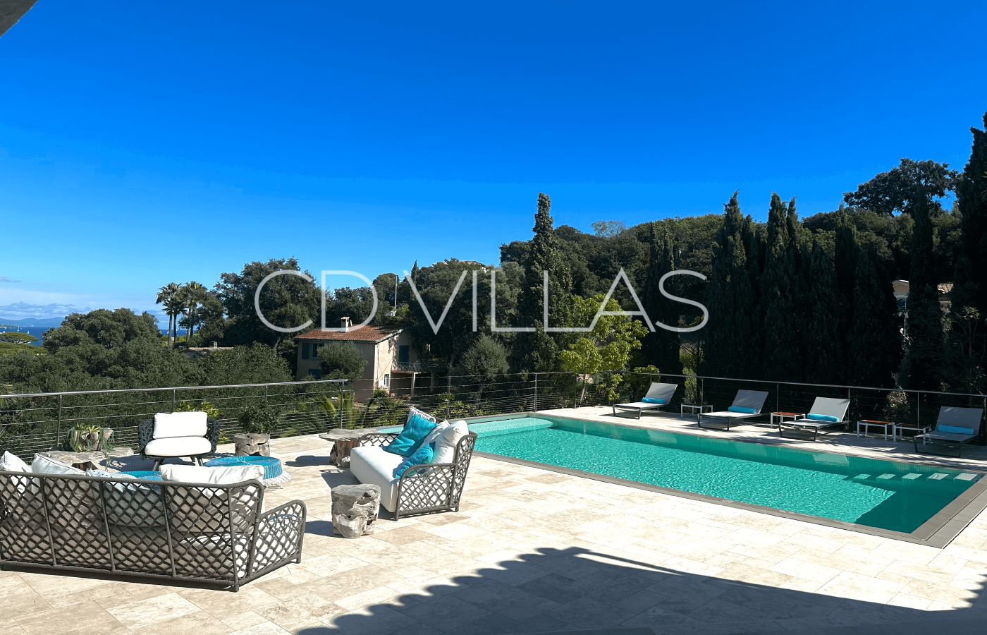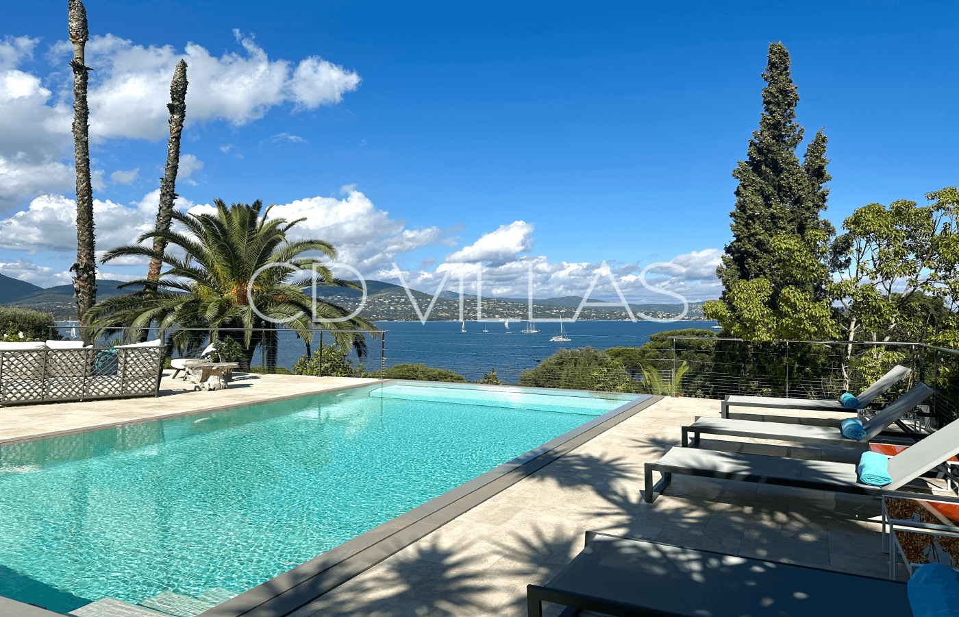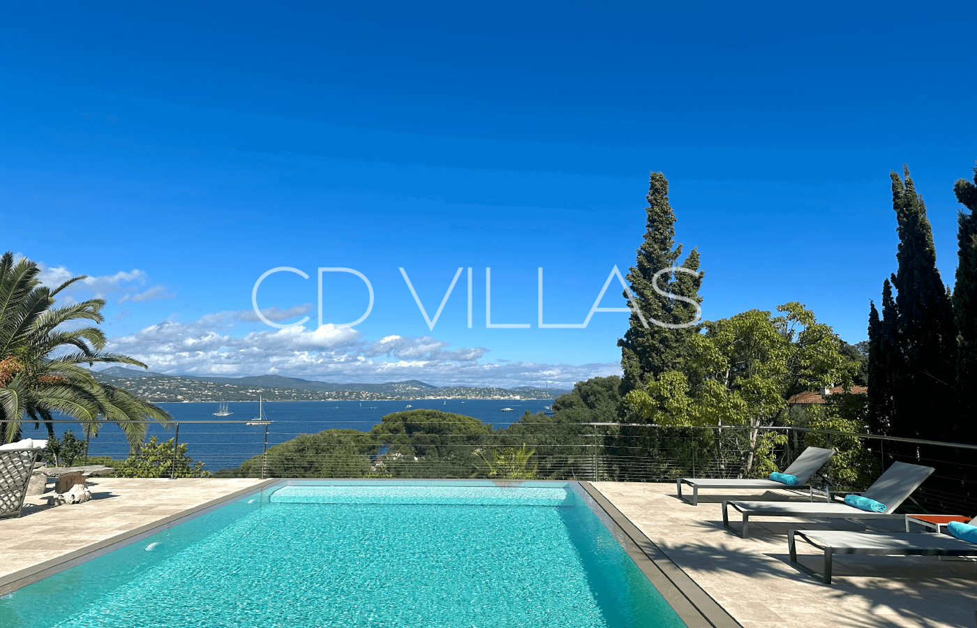 With impeccable finishes, this modern property sits on the side of a hill and offers an amazing seaview of the Bay of Saint Tropez, Sainte Maxime, port Grimaud.