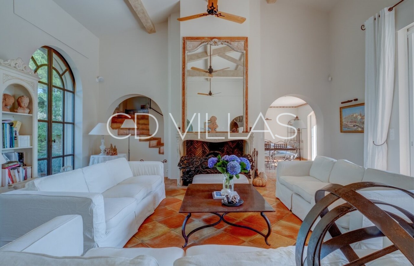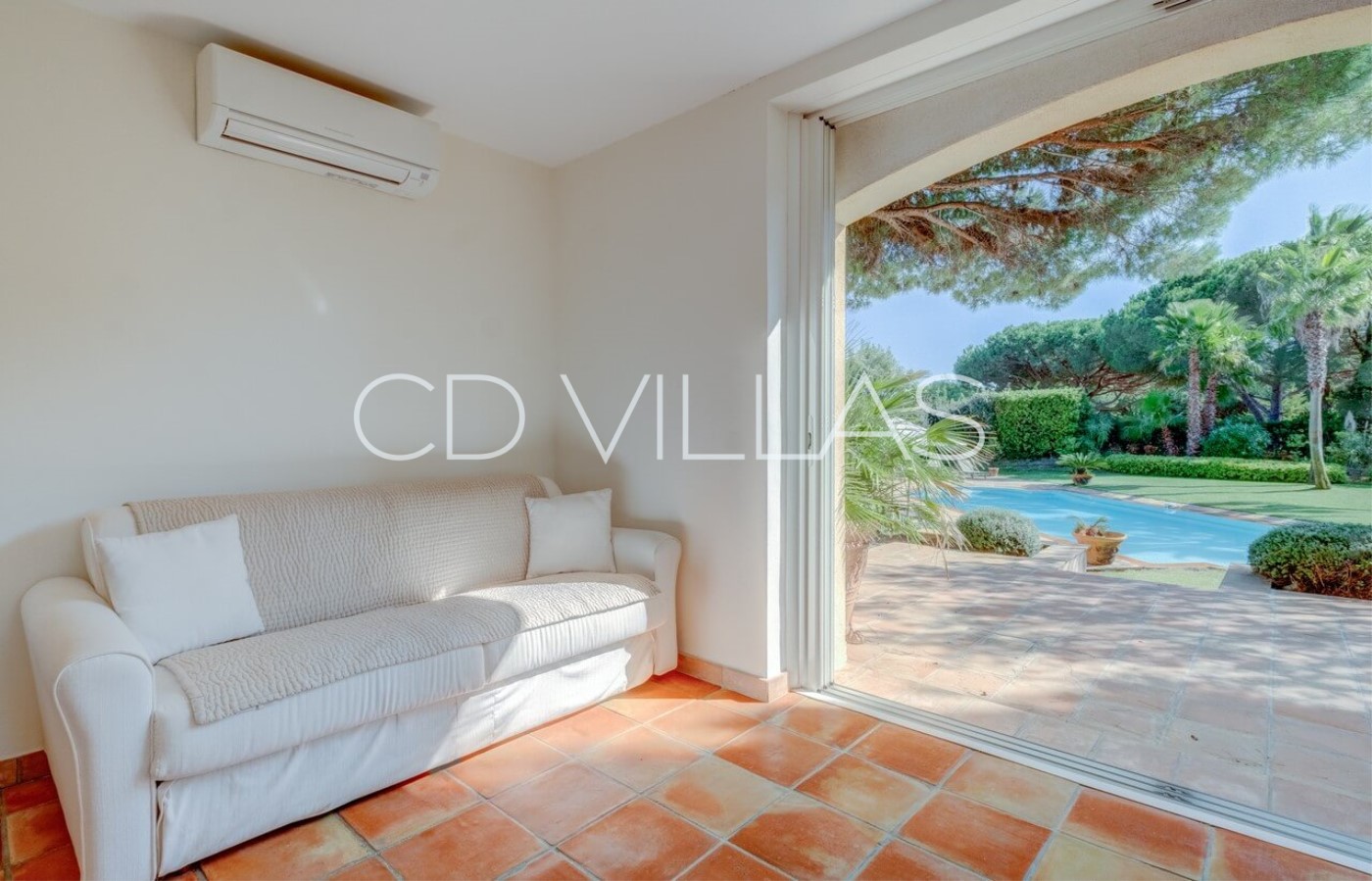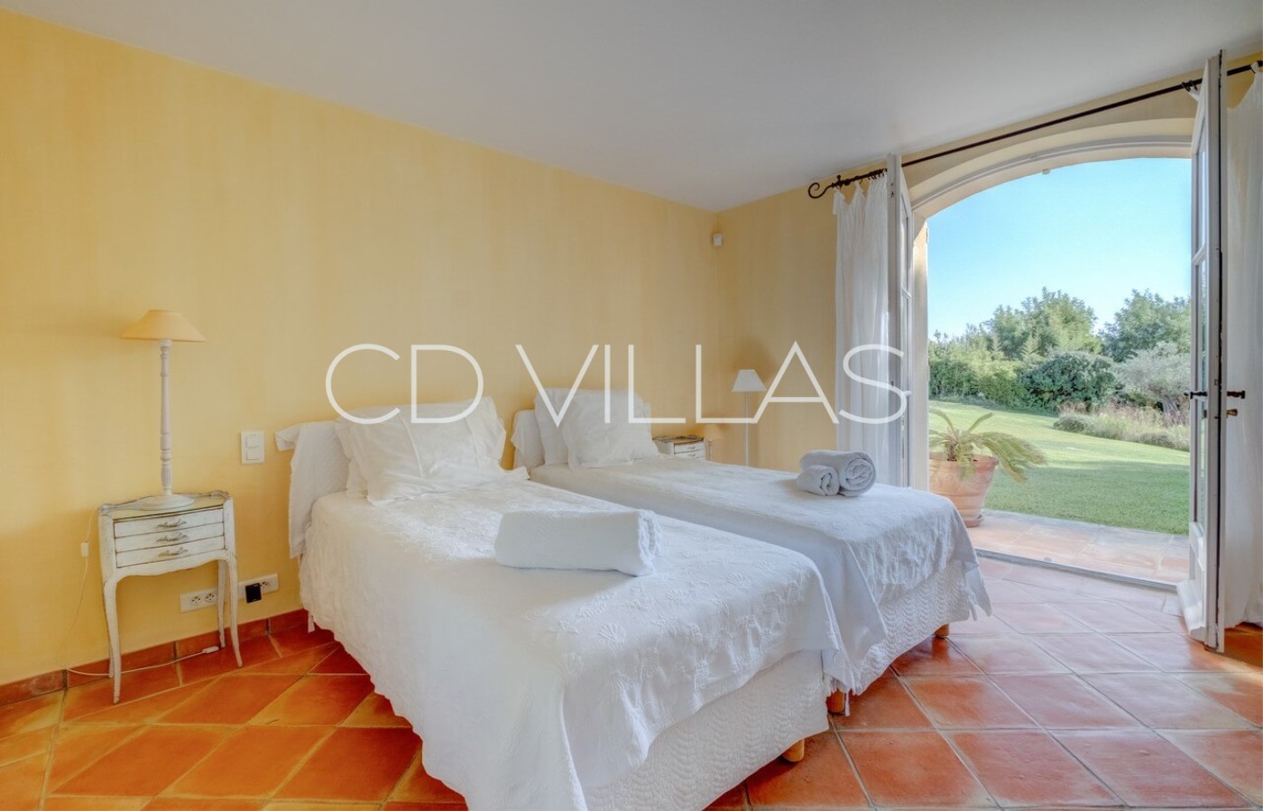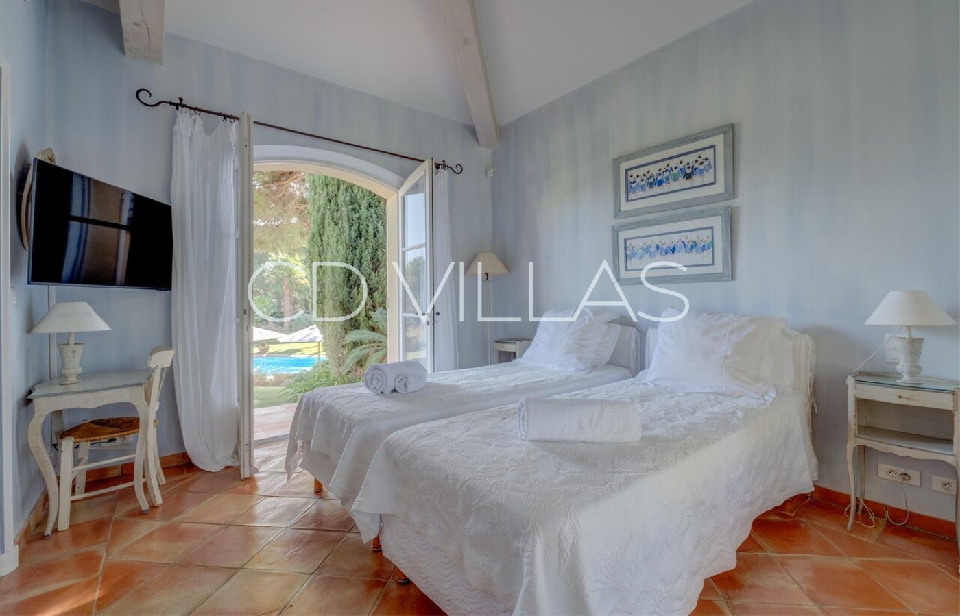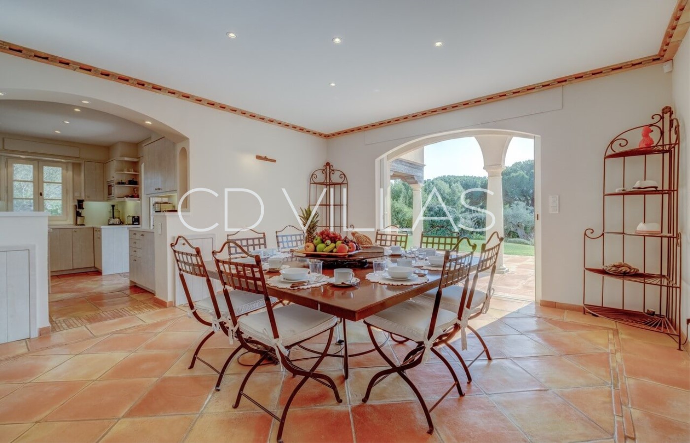 The villa opens onto a large living room offering comfortable sofas to sit on and a fireplace, with terraces on both sides offering plenty of natural light and beautiful garden views. Leading from there, a smaller lounge is next to the living room with large windows opening onto the lawn, then a dining room for 8 guests opening onto the kitchen fully equipped with breakfast bar, dishwasher, fridge-freezer, Gaggenau steam and conventional oven, microwave oven, blender, Sodastream, kettle, Nespresso coffee machine, filter coffee, etc. There is a utilities room behind the kitchen with washing machine and tumble dryer. All the ground floor rooms have direct access to the garden and pool area.