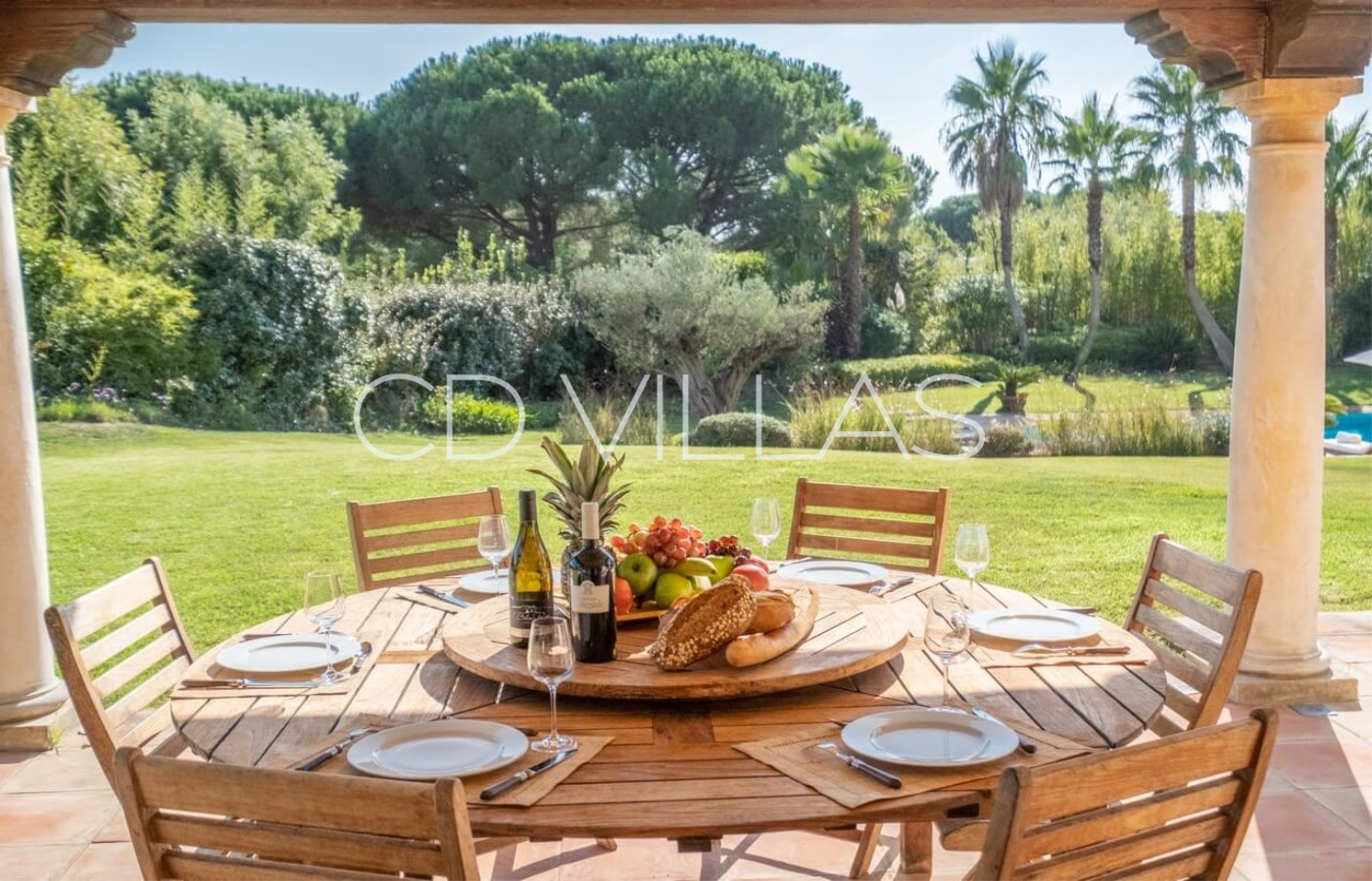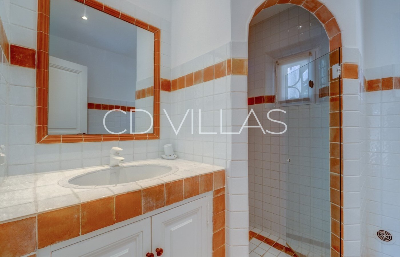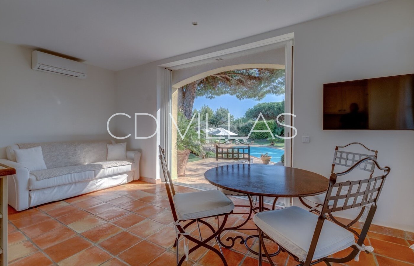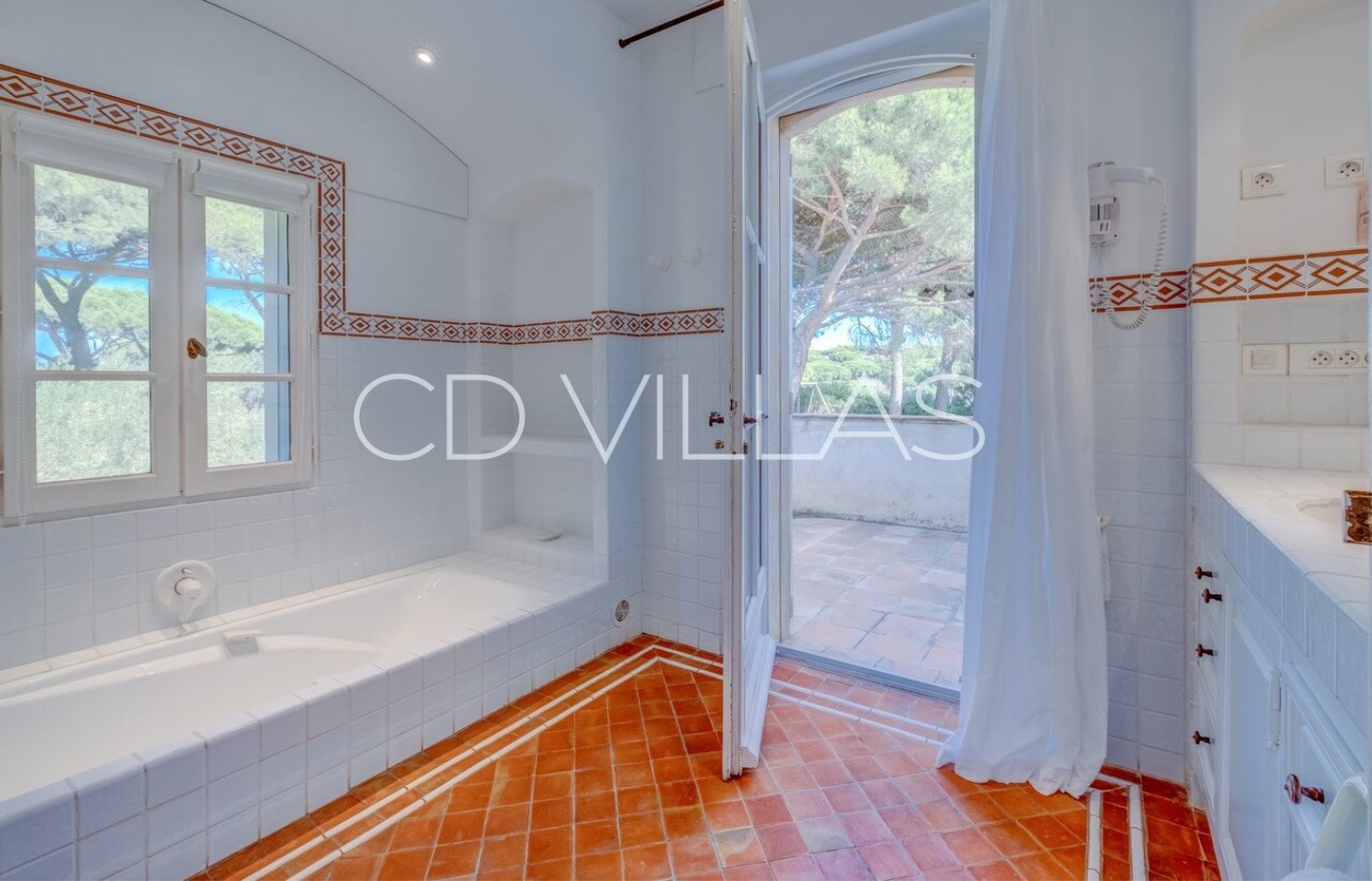 The villa opens onto a large living room offering comfortable sofas to sit on and a fireplace, with terraces on both sides offering plenty of natural light and beautiful garden views. Leading from there, a smaller lounge is next to the living room with large windows opening onto the lawn, then a dining room for 8 guests opening onto the kitchen fully equipped with breakfast bar, dishwasher, fridge-freezer, Gaggenau steam and conventional oven, microwave oven, blender, Sodastream, kettle, Nespresso coffee machine, filter coffee, etc. There is a utilities room behind the kitchen with washing machine and tumble dryer. All the ground floor rooms have direct access to the garden and pool area.