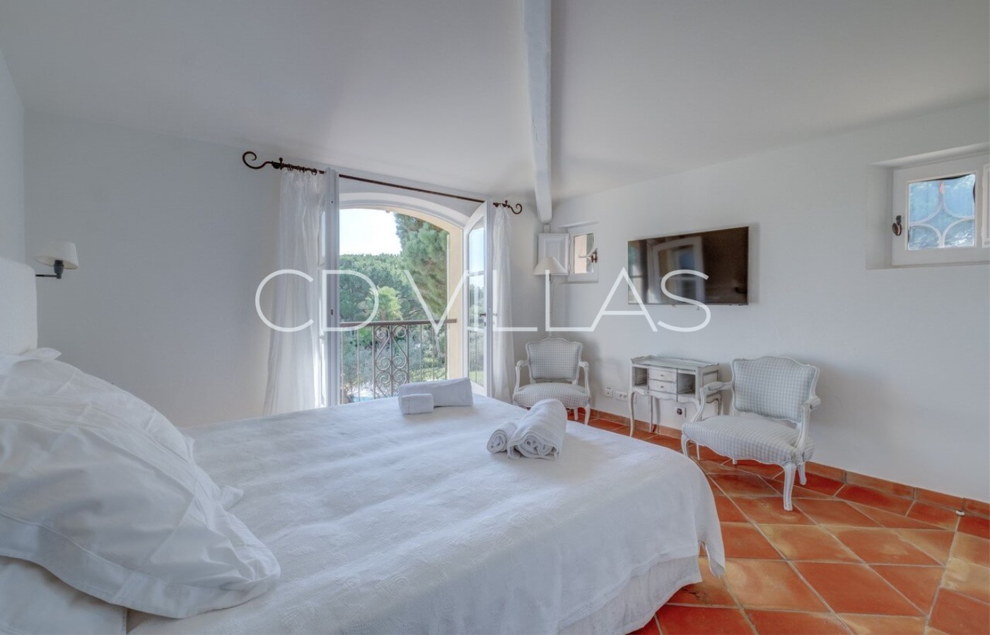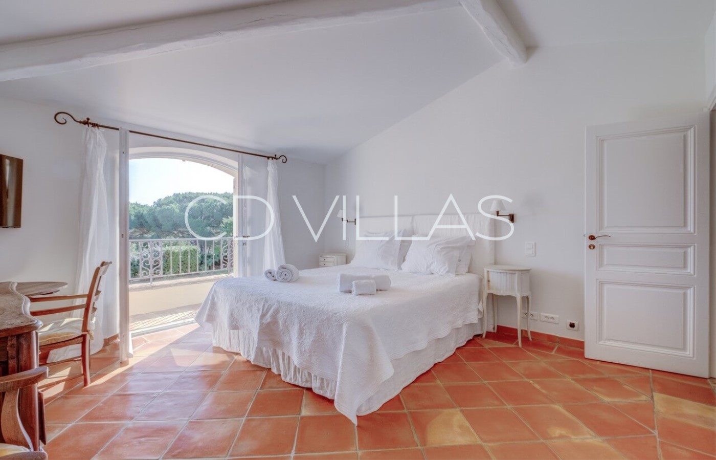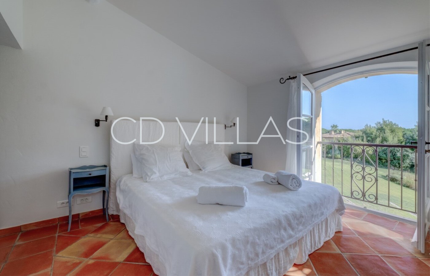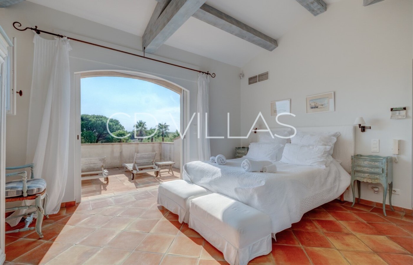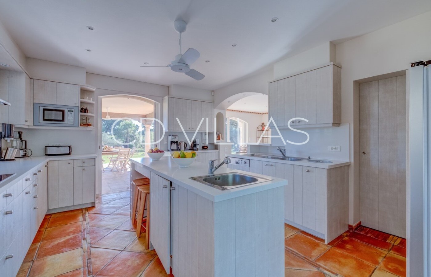 The villa opens onto a large living room offering comfortable sofas to sit on and a fireplace, with terraces on both sides offering plenty of natural light and beautiful garden views. Leading from there, a smaller lounge is next to the living room with large windows opening onto the lawn, then a dining room for 8 guests opening onto the kitchen fully equipped with breakfast bar, dishwasher, fridge-freezer, Gaggenau steam and conventional oven, microwave oven, blender, Sodastream, kettle, Nespresso coffee machine, filter coffee, etc. There is a utilities room behind the kitchen with washing machine and tumble dryer. All the ground floor rooms have direct access to the garden and pool area.
