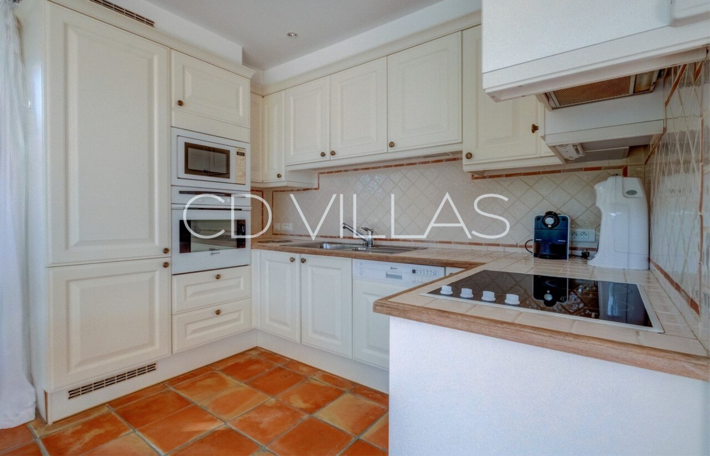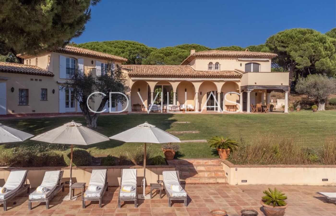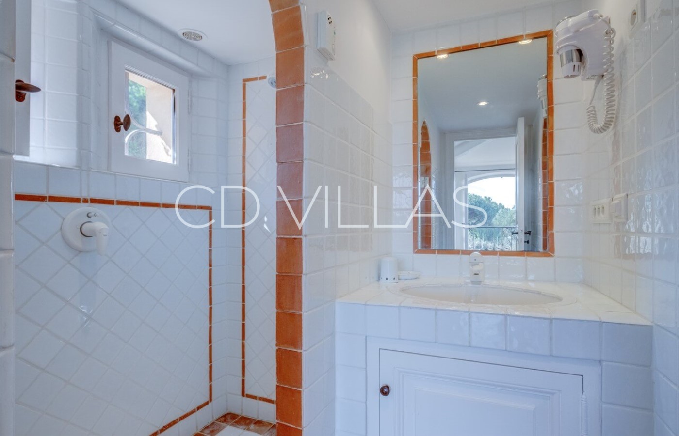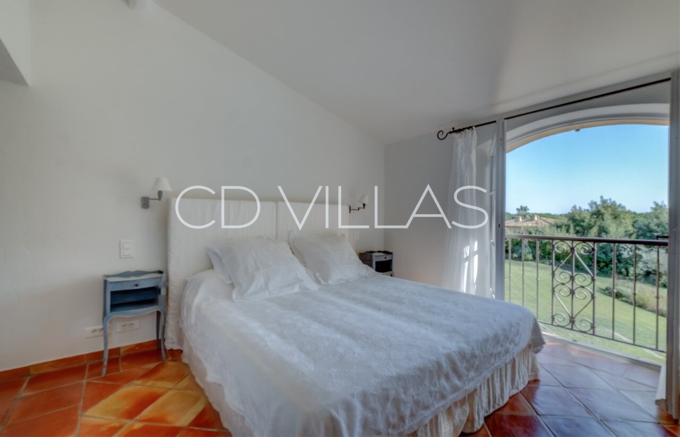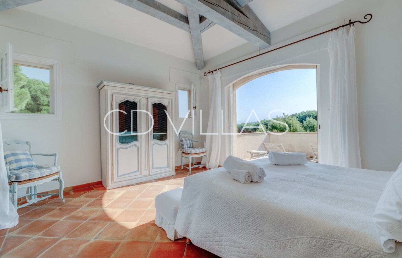 The villa opens onto a large living room offering comfortable sofas to sit on and a fireplace, with terraces on both sides offering plenty of natural light and beautiful garden views. Leading from there, a smaller lounge is next to the living room with large windows opening onto the lawn, then a dining room for 8 guests opening onto the kitchen fully equipped with breakfast bar, dishwasher, fridge-freezer, Gaggenau steam and conventional oven, microwave oven, blender, Sodastream, kettle, Nespresso coffee machine, filter coffee, etc. There is a utilities room behind the kitchen with washing machine and tumble dryer. All the ground floor rooms have direct access to the garden and pool area.