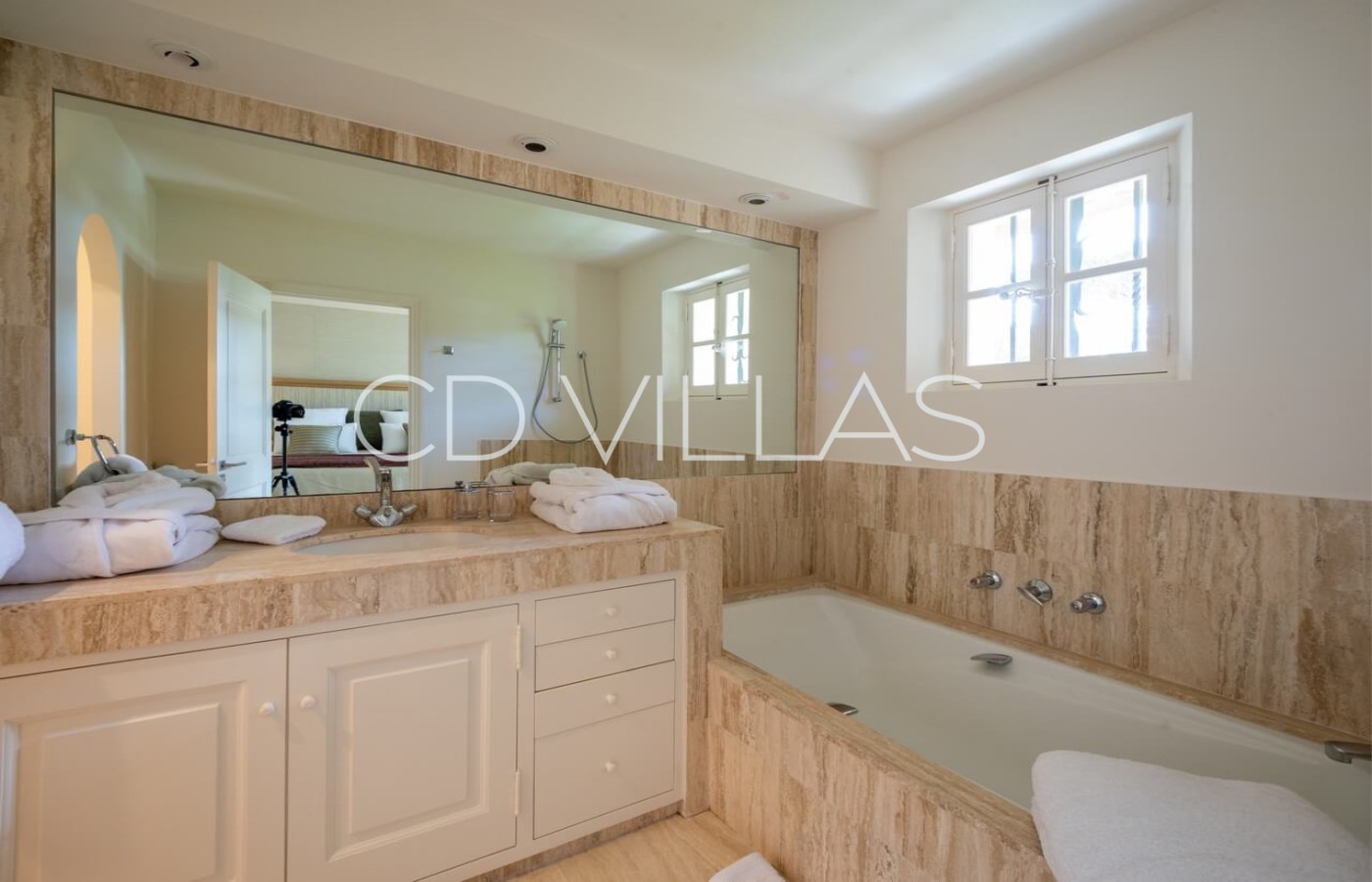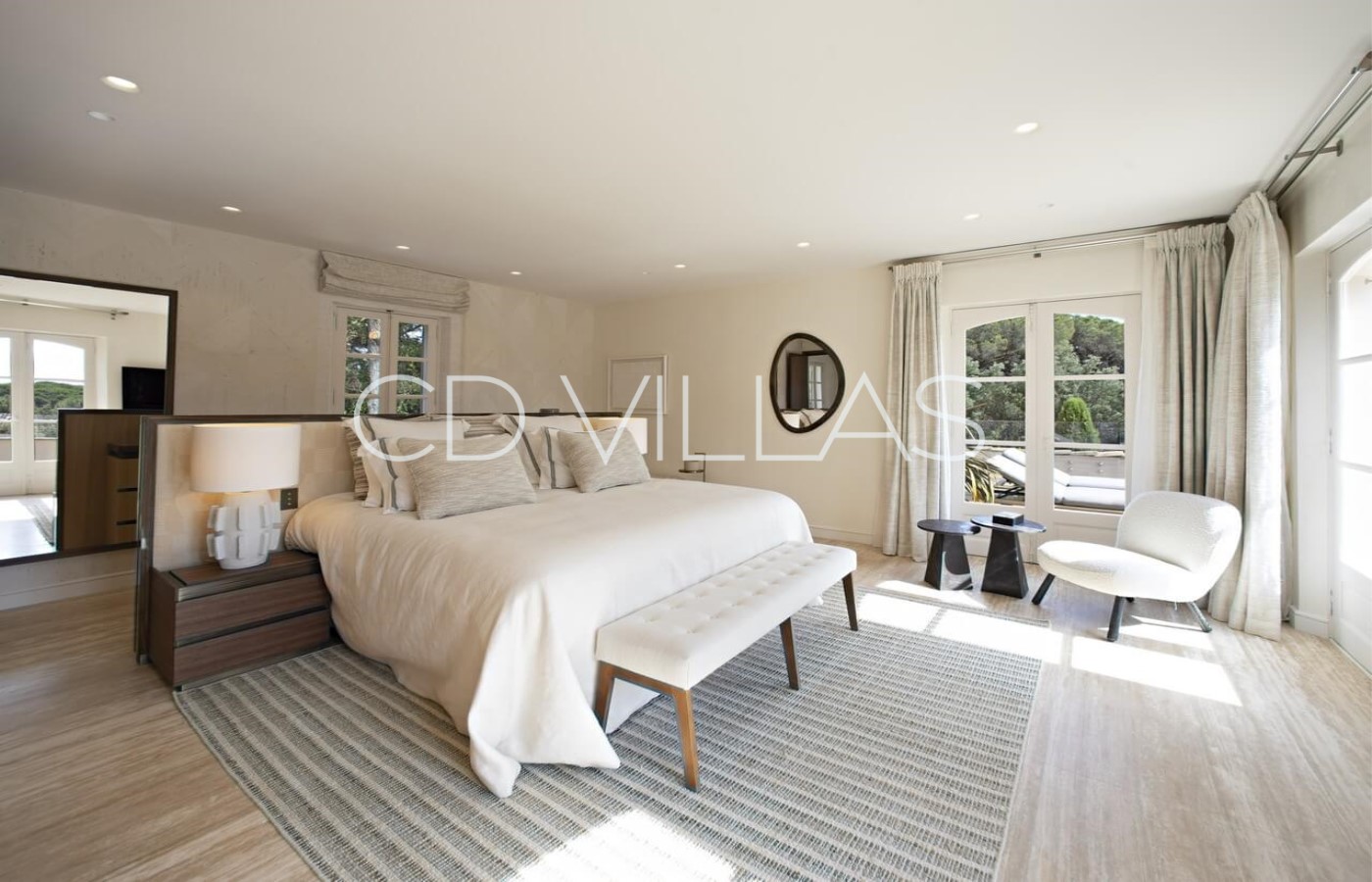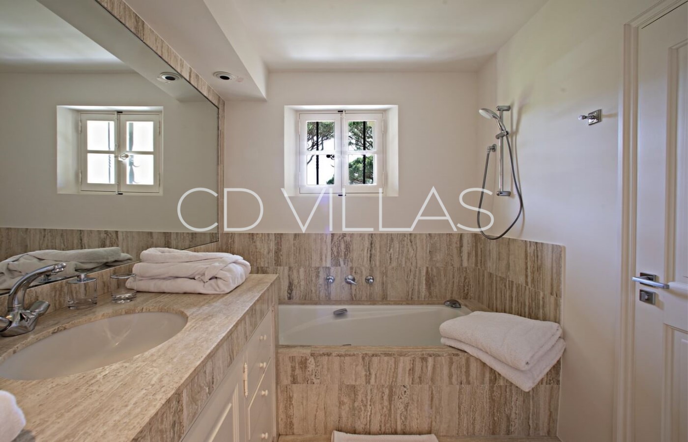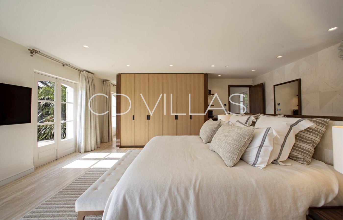 The Master bedroom is located on the first floor with Emperor double bed, 200cm, full bathroom including shower enclosure and bathtub, large closet, smart TV, Sonos system, satellite TV and private terrace with view of the landscaped garden and pool.