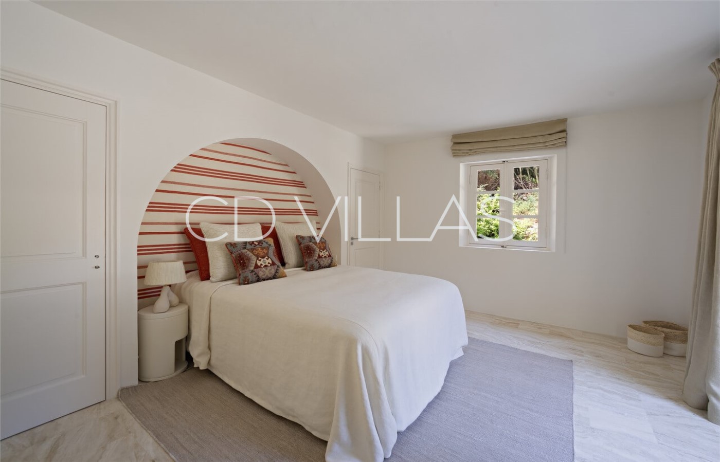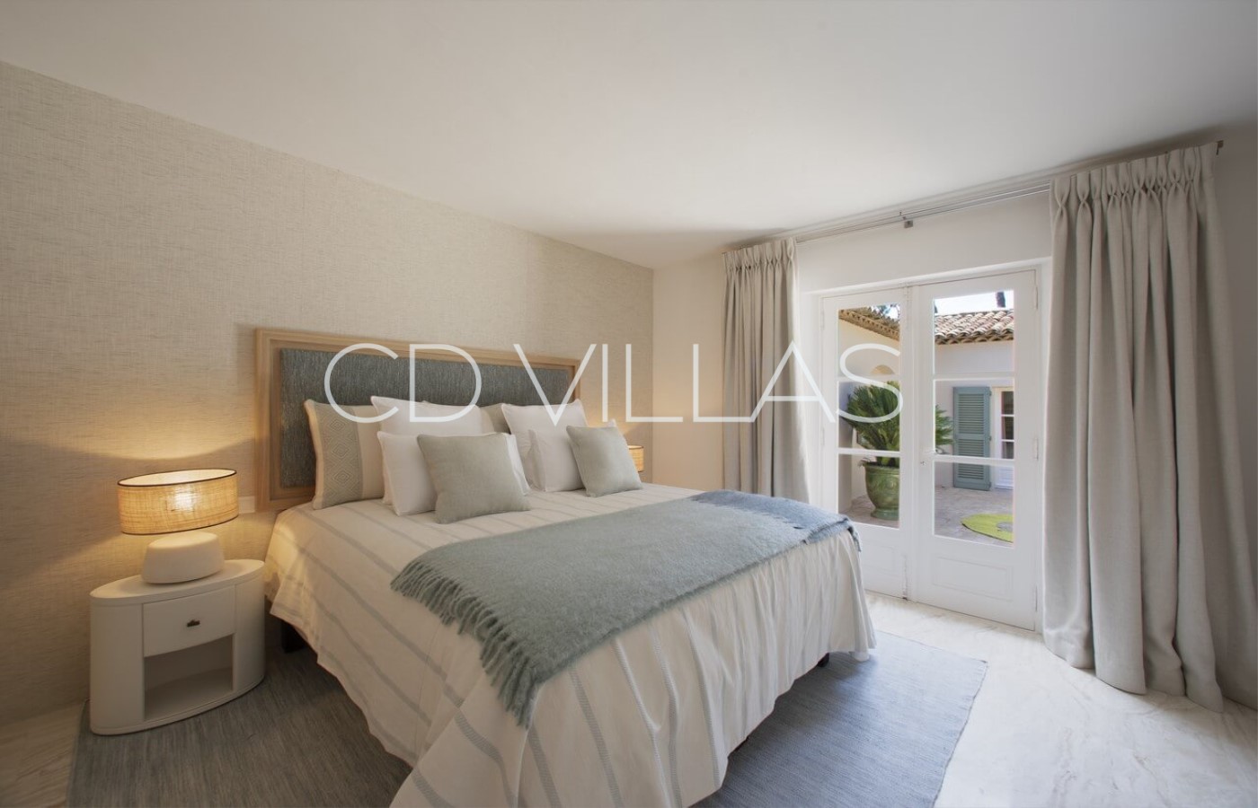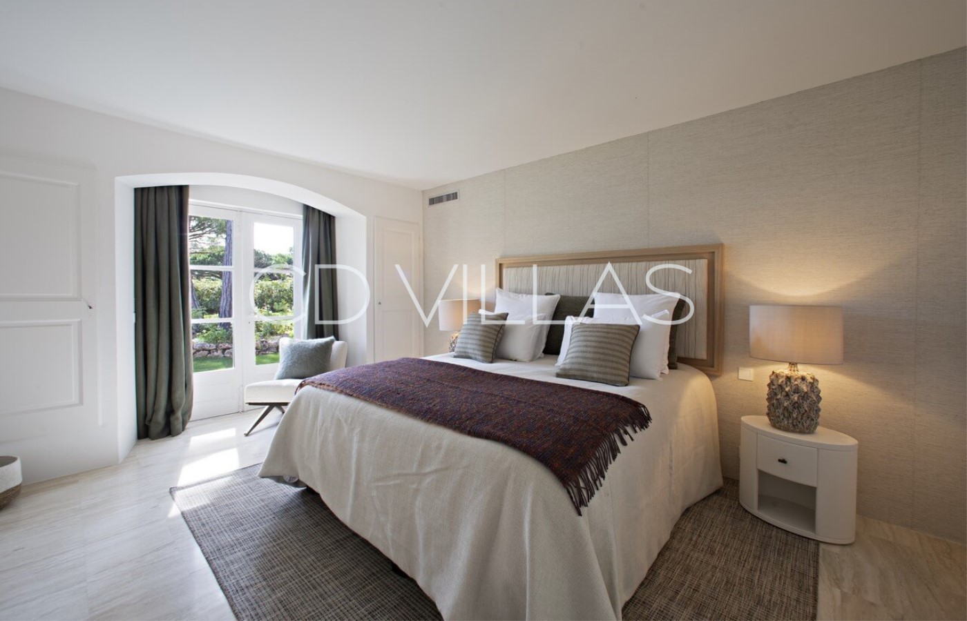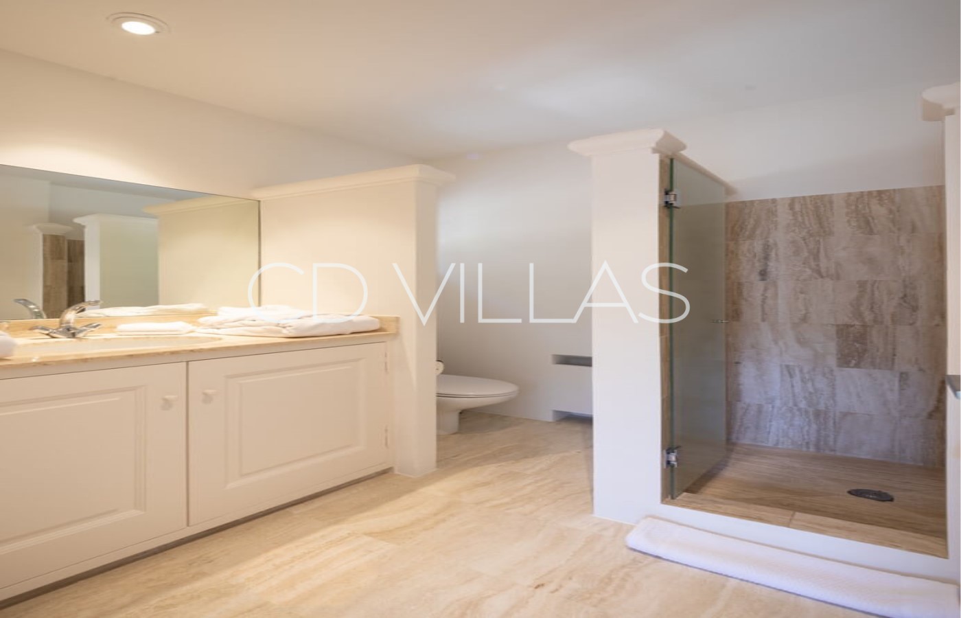 The Master bedroom is located on the first floor with Emperor double bed, 200cm, full bathroom including shower enclosure and bathtub, large closet, smart TV, Sonos system, satellite TV and private terrace with view of the landscaped garden and pool.