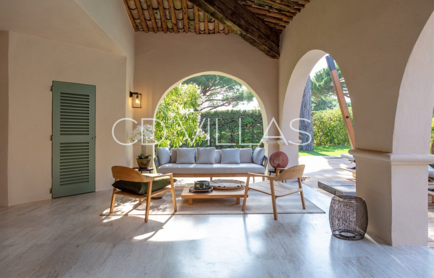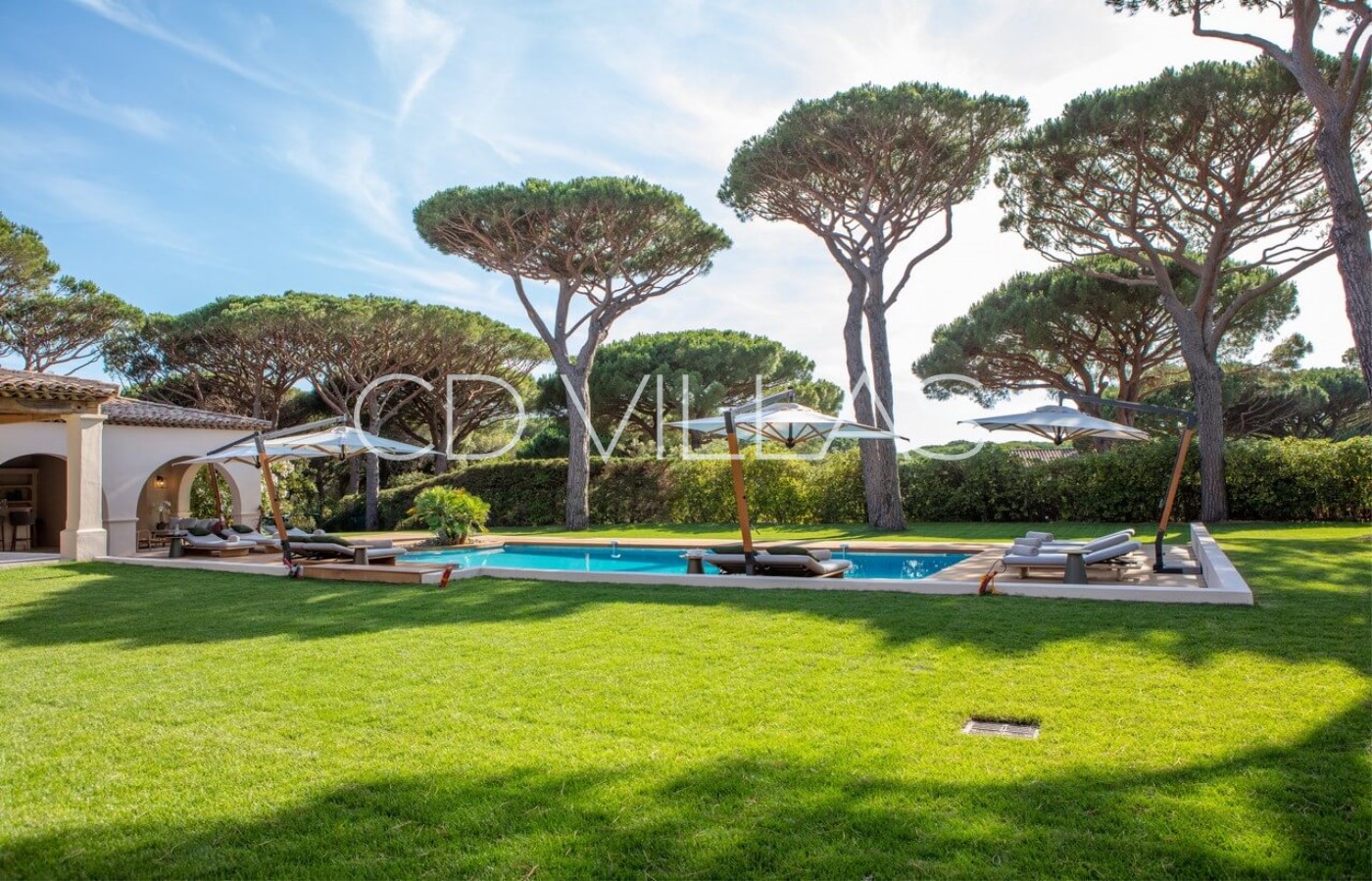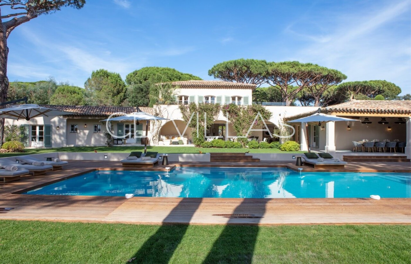 A magnificent building with many indoor and outdoor living spaces (patios, private terraces, covered terraces, sunbathing, Pool House, teak beach). A Mediterranean landscaped park overlooked by majestic umbrella pines houses a swimming pool with Hollywood dimensions. The villa is located in the most exclusive private domain in Saint Tropez, Domaine des Parcs and offers a haven of peace for holidays with family or friends.