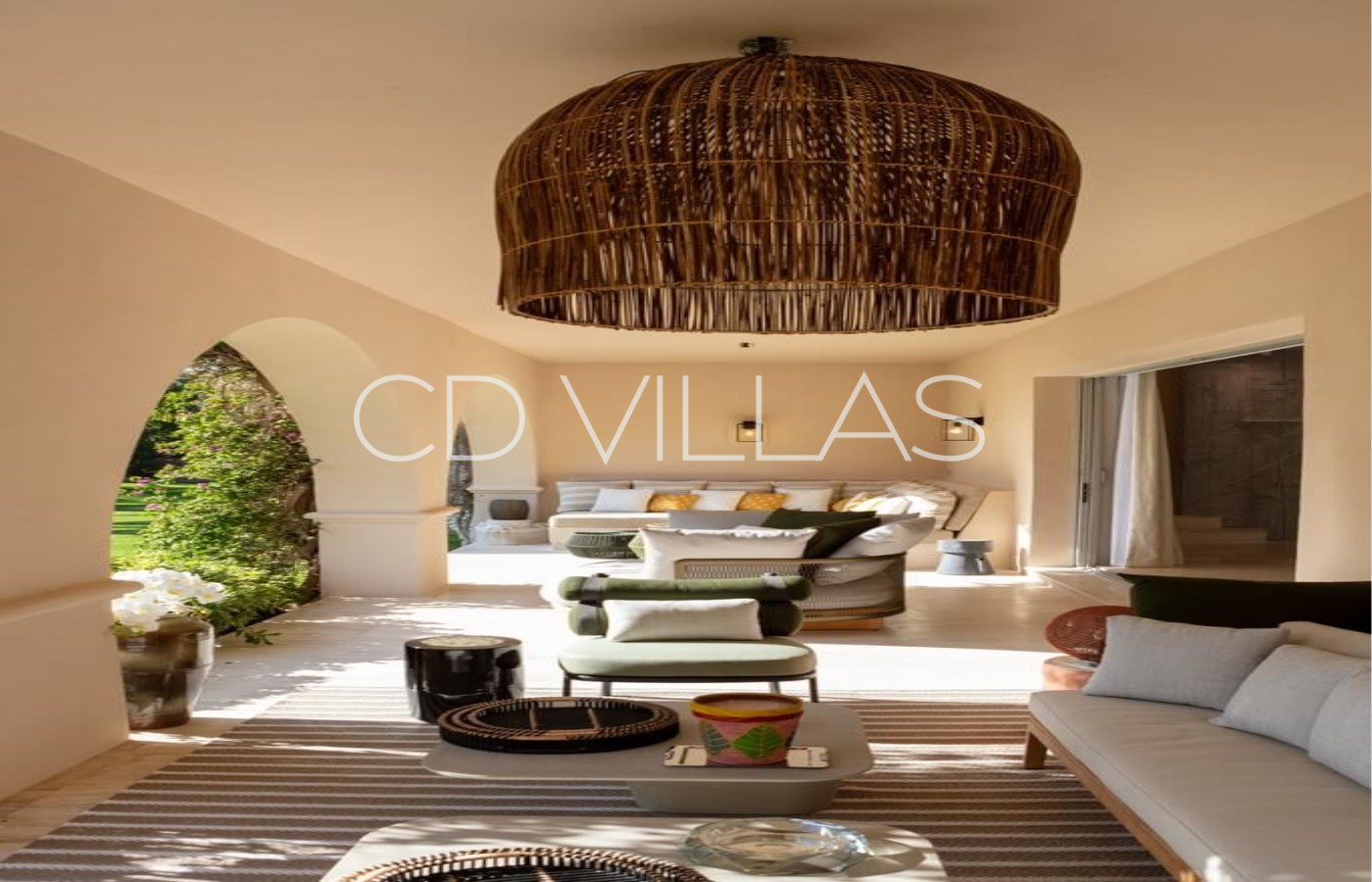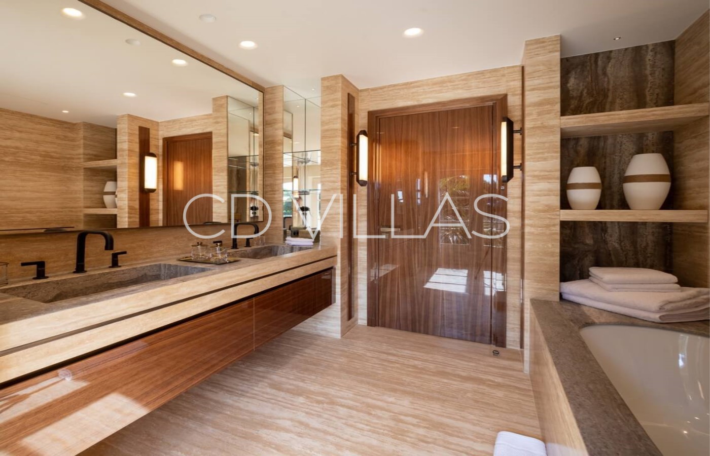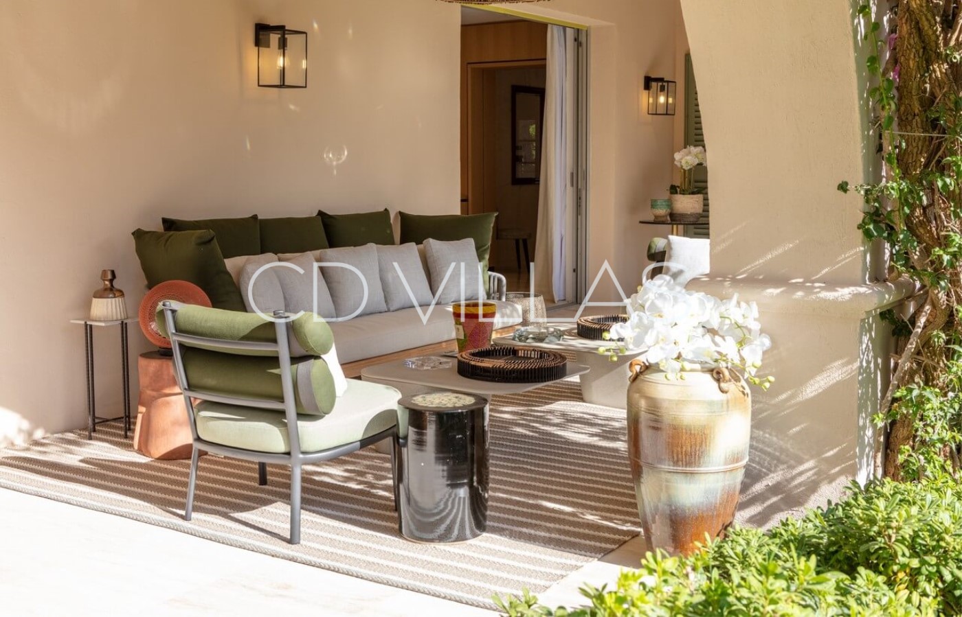 On the villa's ground floor, guests will find a vestibule, cloakroom and guest toilet ; 2 Lounges in a row, Sonos sound system. Fitted with large bay window, giving access to the outdoor lounges and the swimming pool as well as on the other side a patio (80 m2)