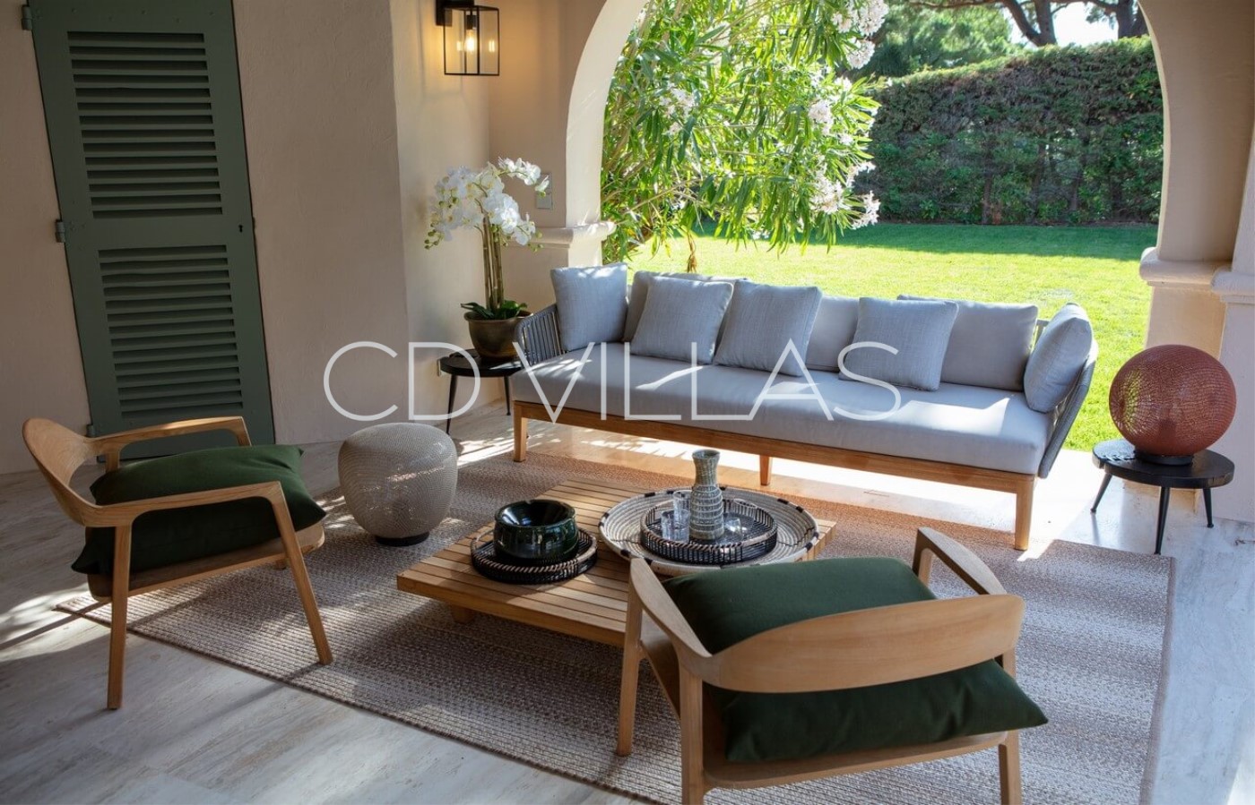 The outdoor area includes 2 Patios on the east side of the Villa, 2 Large outdoor covered lounges in a row on the Pool and Park side, Outdoor shaded "Al Fresco" Dining Room, Large Pool House, Weber Bar and BBQ, Shower, WC, cabin / changing room, Garden Lounge, Landscaped Mediterranean garden with rare species, in the shade of 25 Majestic Double Umbrella Pines, Heated swimming pool (15m x 6m), deckchairs and sun umbrellas, Full Audio Sound System "SONOS".