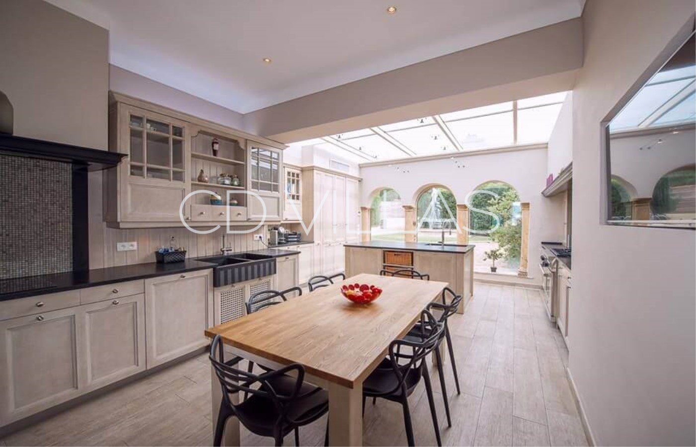 appliances and features a unique glass ceiling as arched