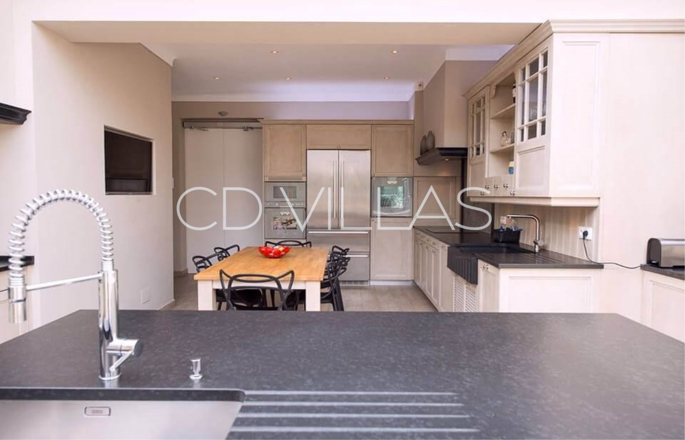 Kitchen - connected to dining room via automatic doors. Fully equipped with gaz range with large oven, induction hot plates, conventional and microwave oven, steam oven, 2* fridges/freezers, ice making machine, wine cellar, nespresso machine, blender, mixer, juicer, dishwasher. Large walk in cold room next to kitchen