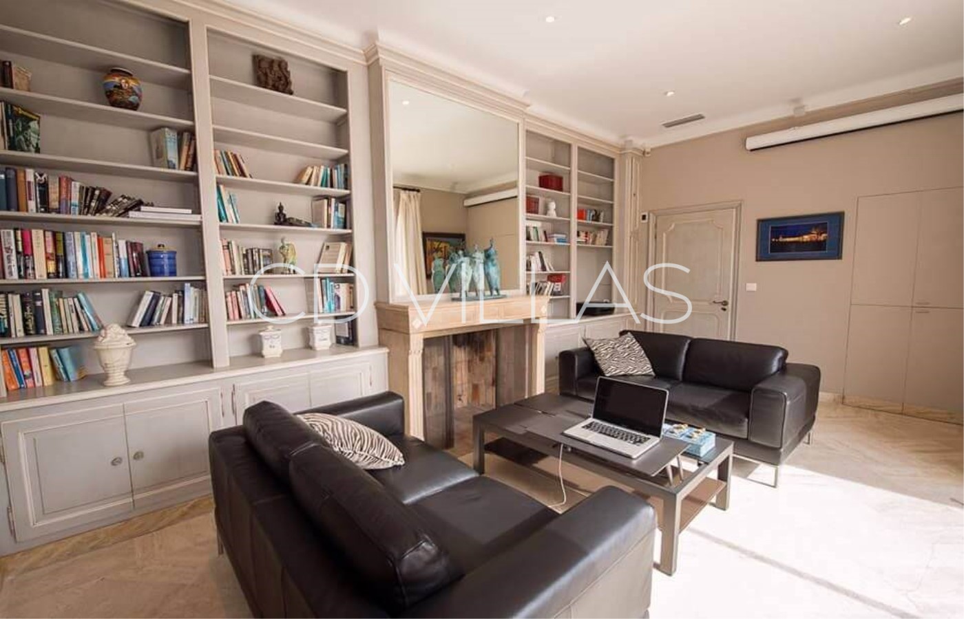 library with a fireplace and home cinema.