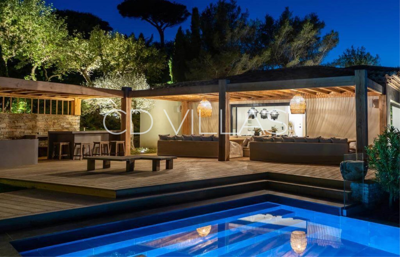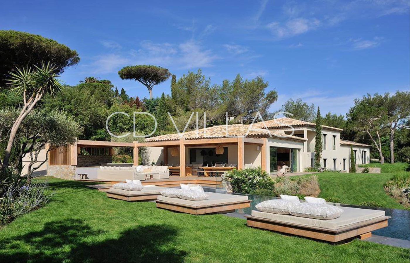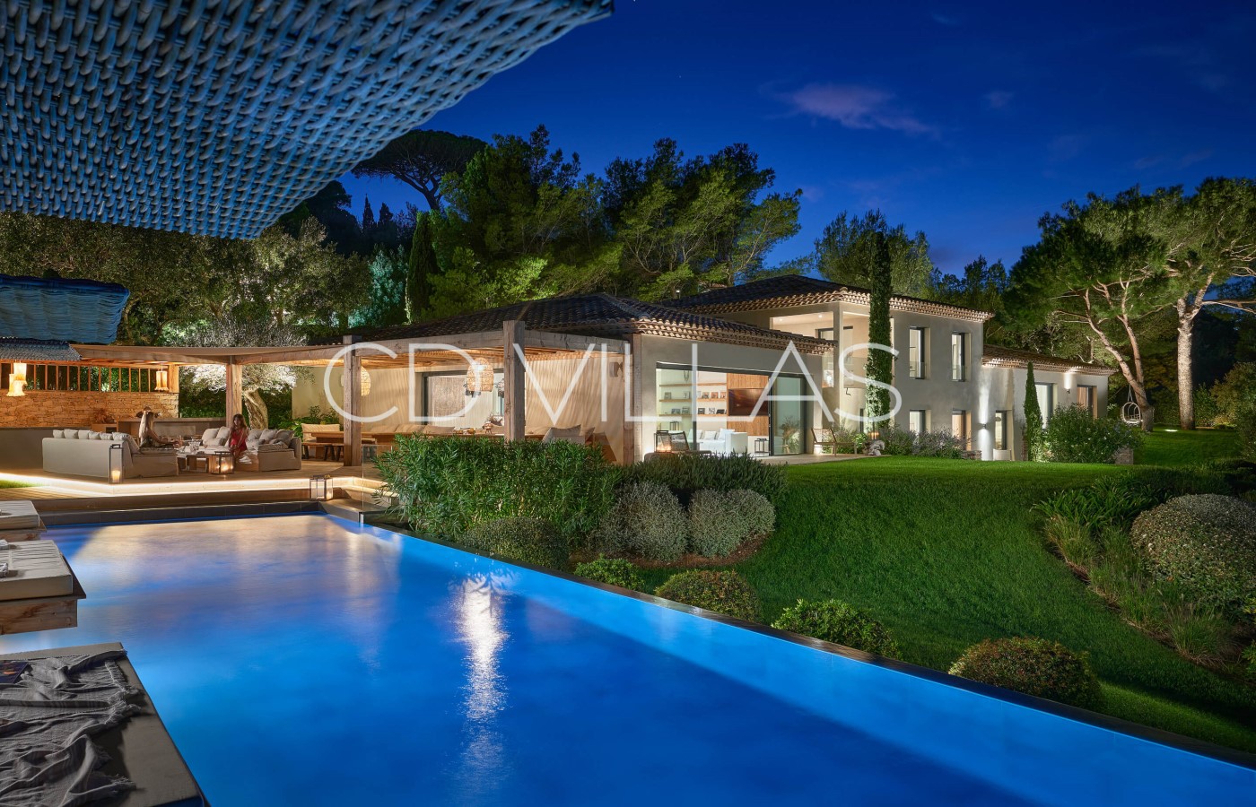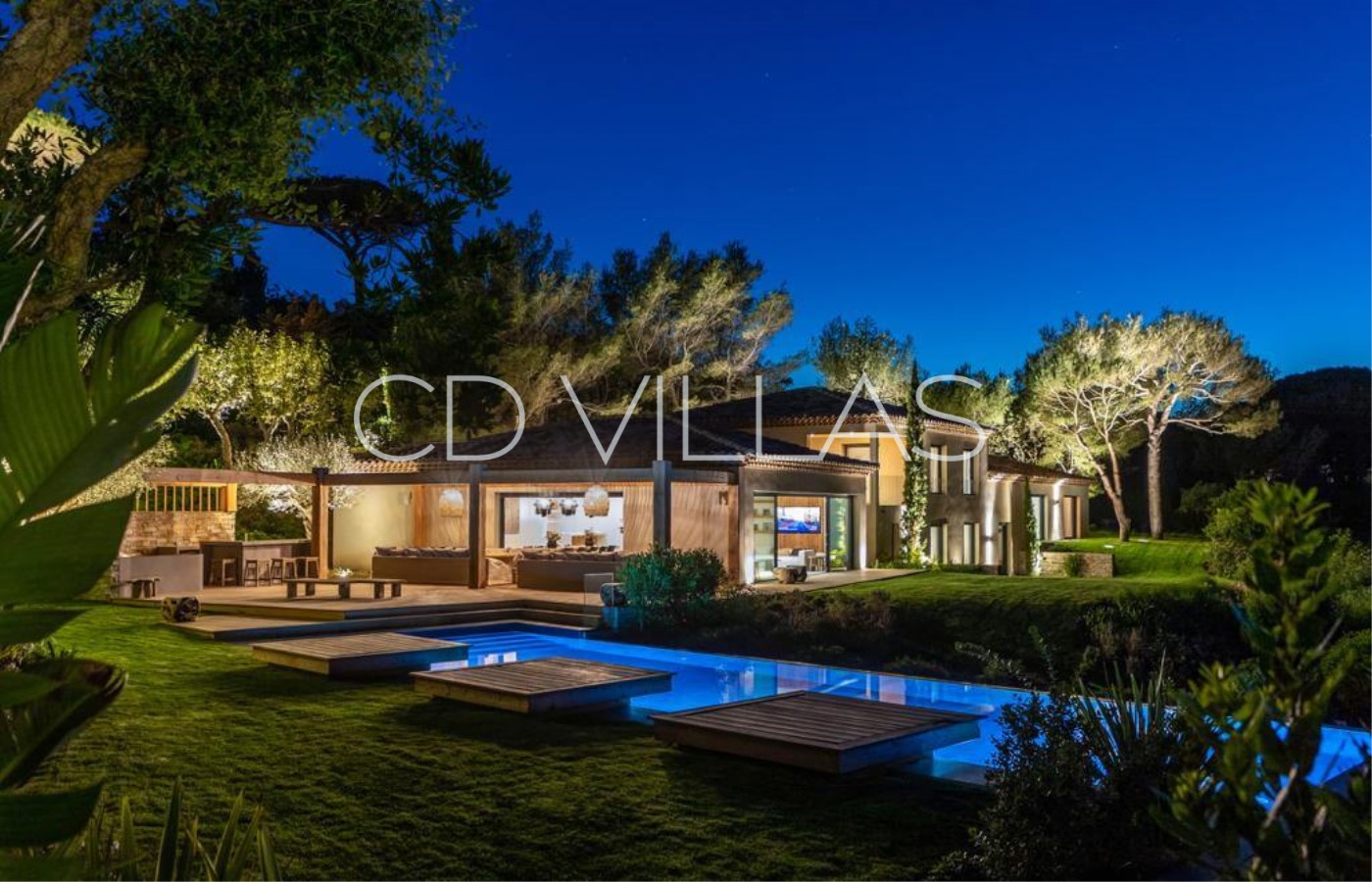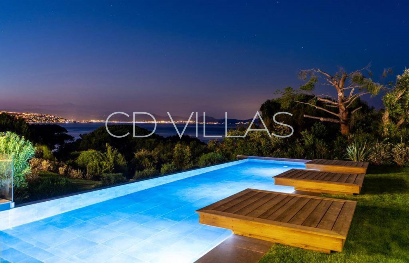 The lobby opens onto a large common room with floor to ceiling windows to enjoy the view of the Mediterranean, with a large living and dining room (110m²), a fully equipped modern kitchen and direct access to the terrace and pool area offering a covered dining and lounge area, comfortable daybeds around the infinity pool and a large poolhouse.