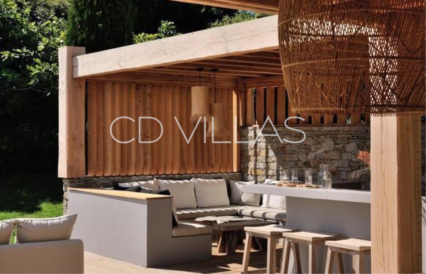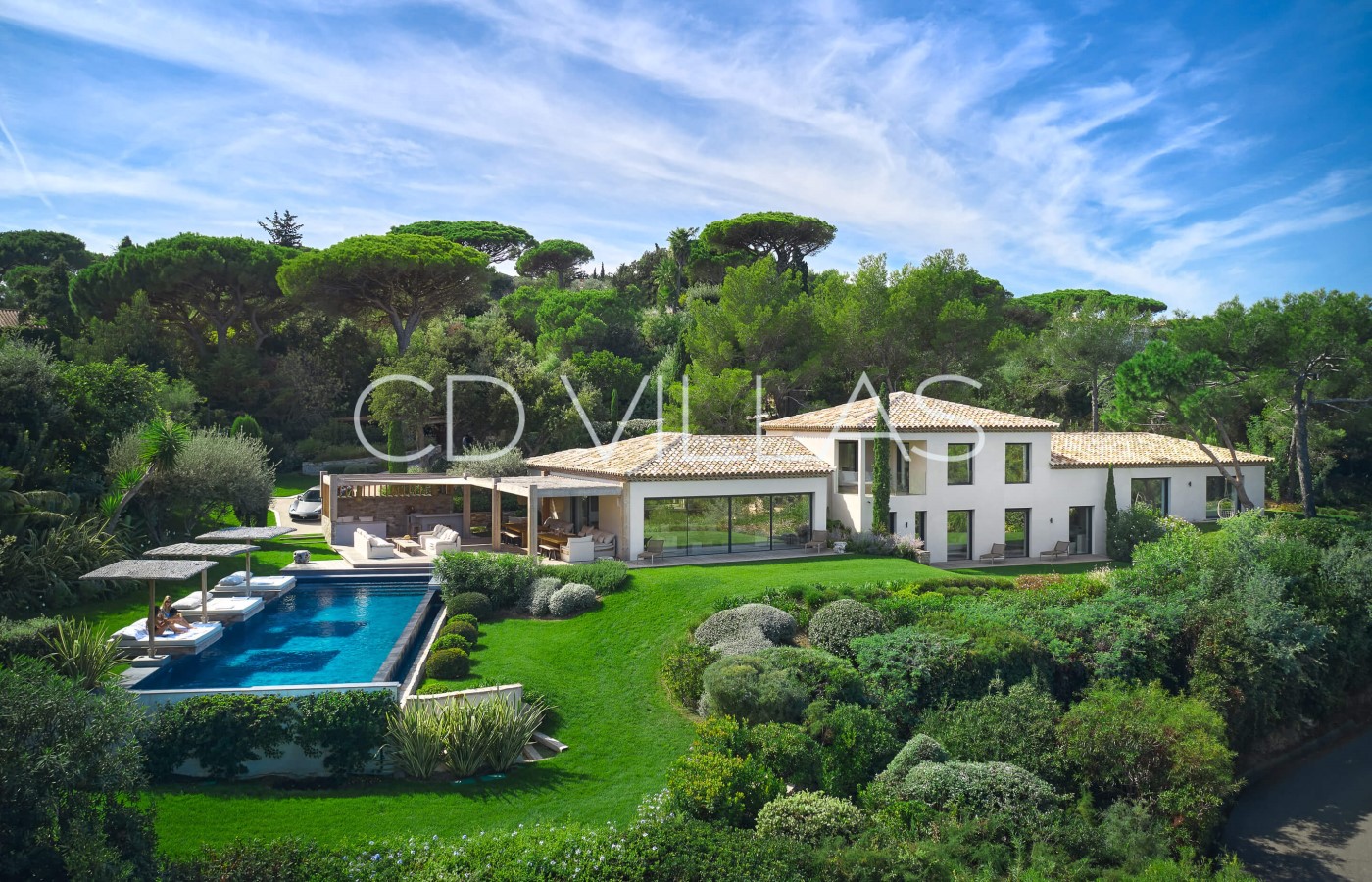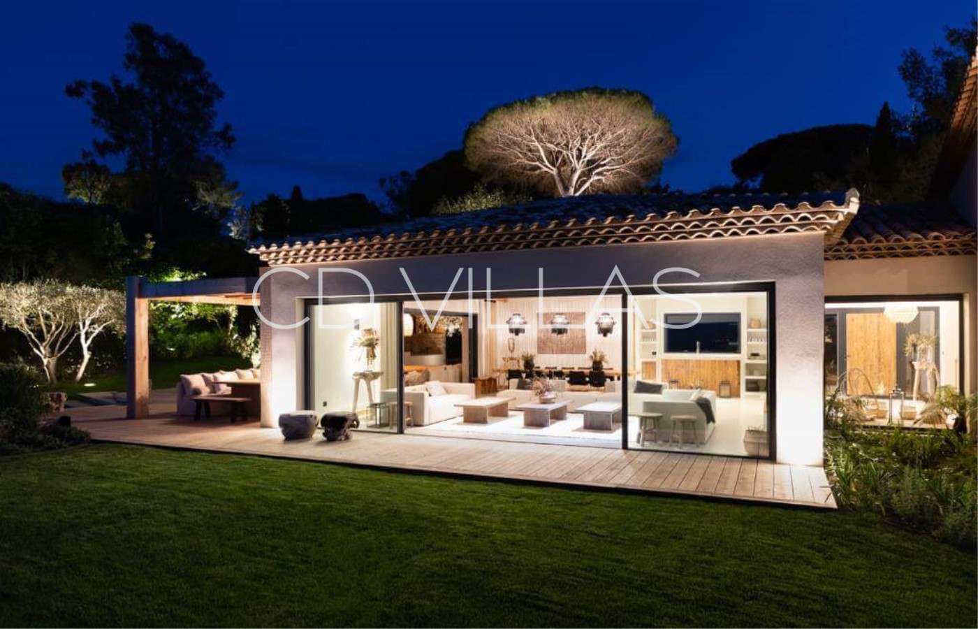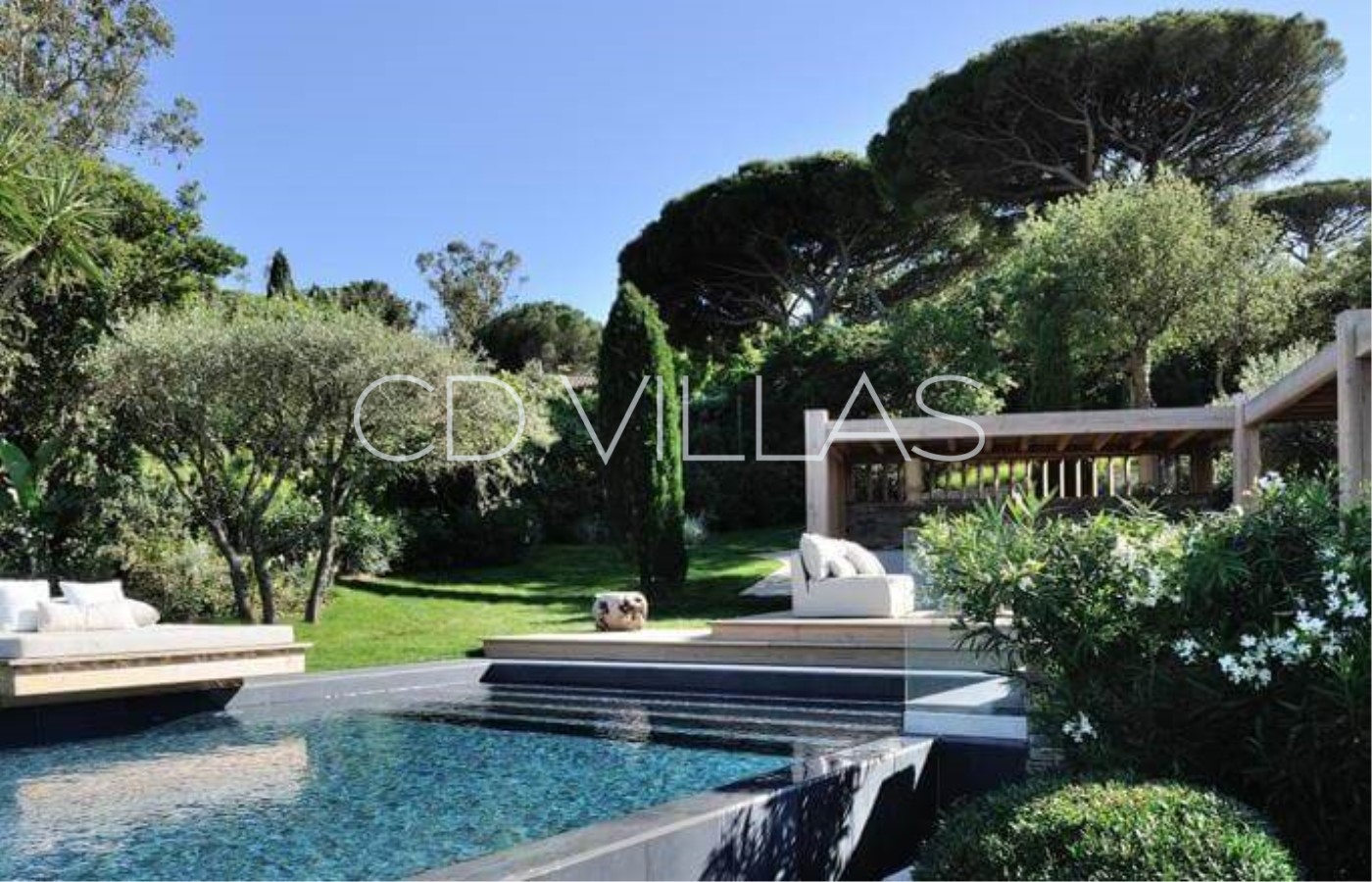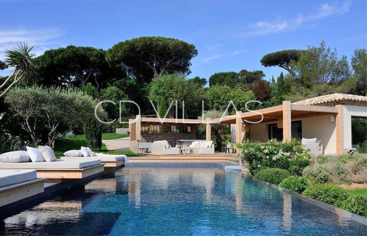 The lobby opens onto a large common room with floor to ceiling windows to enjoy the view of the Mediterranean, with a large living and dining room (110m²), a fully equipped modern kitchen and direct access to the terrace and pool area offering a covered dining and lounge area, comfortable daybeds around the infinity pool and a large poolhouse.