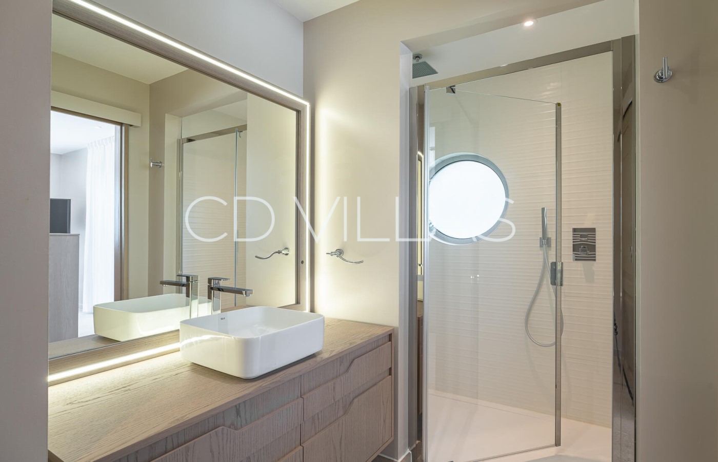 The villa offers six luxurious bedroom suites, all individually designed and decorated. There are two bedroom suites on the ground floor and 4 bedrooms on the first floor. An additonal studio can be made available with bedroom, bathroom, kitchenette and is located on the lower level, ideal for staff or teenagers.