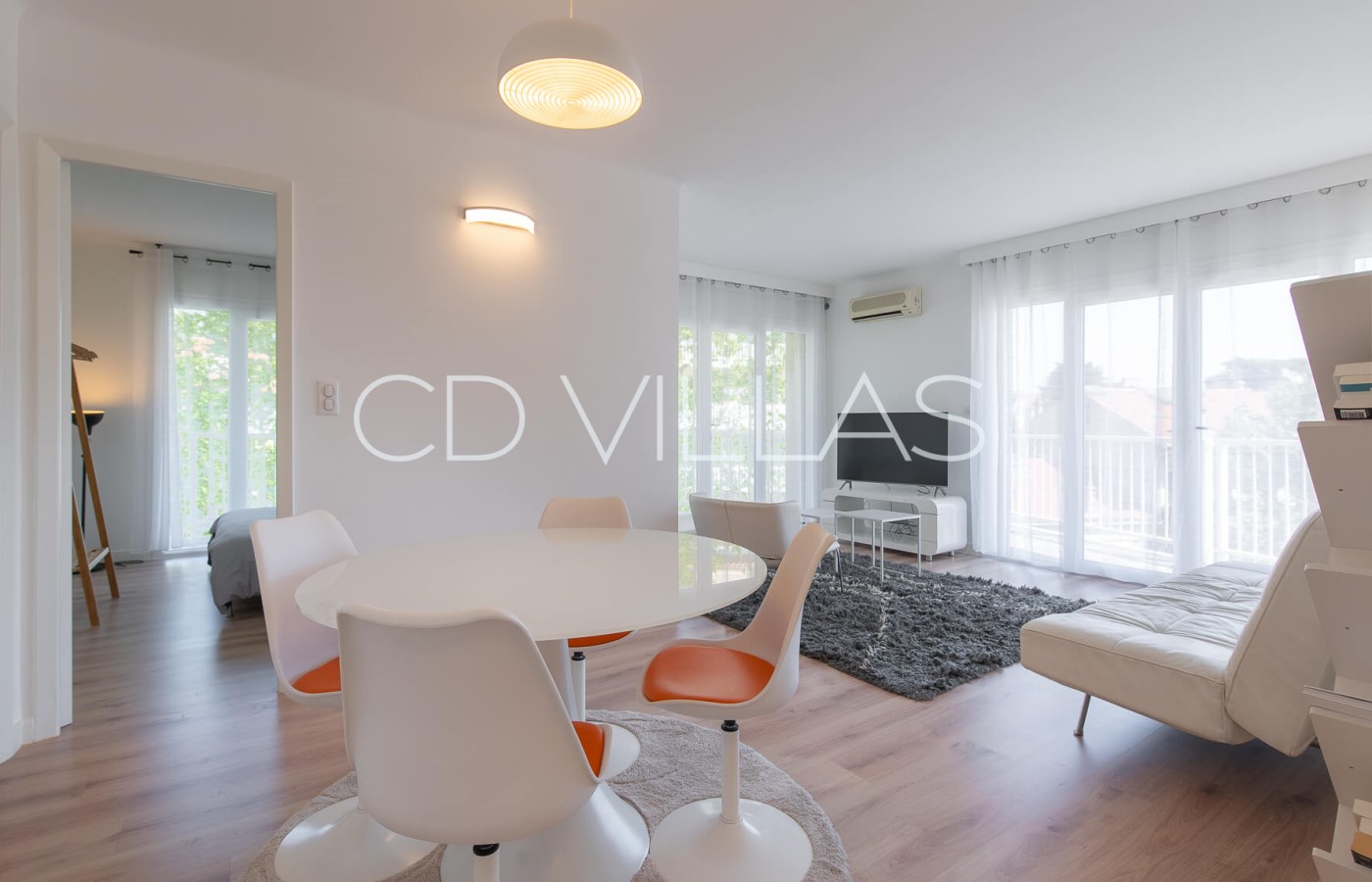The apartment was recently completely renovated and is equipped with high end furnishings and appliances throughout. An elevator gives access to the 5fth floor and the entry opens to a beautiful open living dining area with large windows and views over Cannes. The well equipped kitchen is located on one site, with a small corridor leading to the other side where the two bedrooms and the shared bathroom are located.