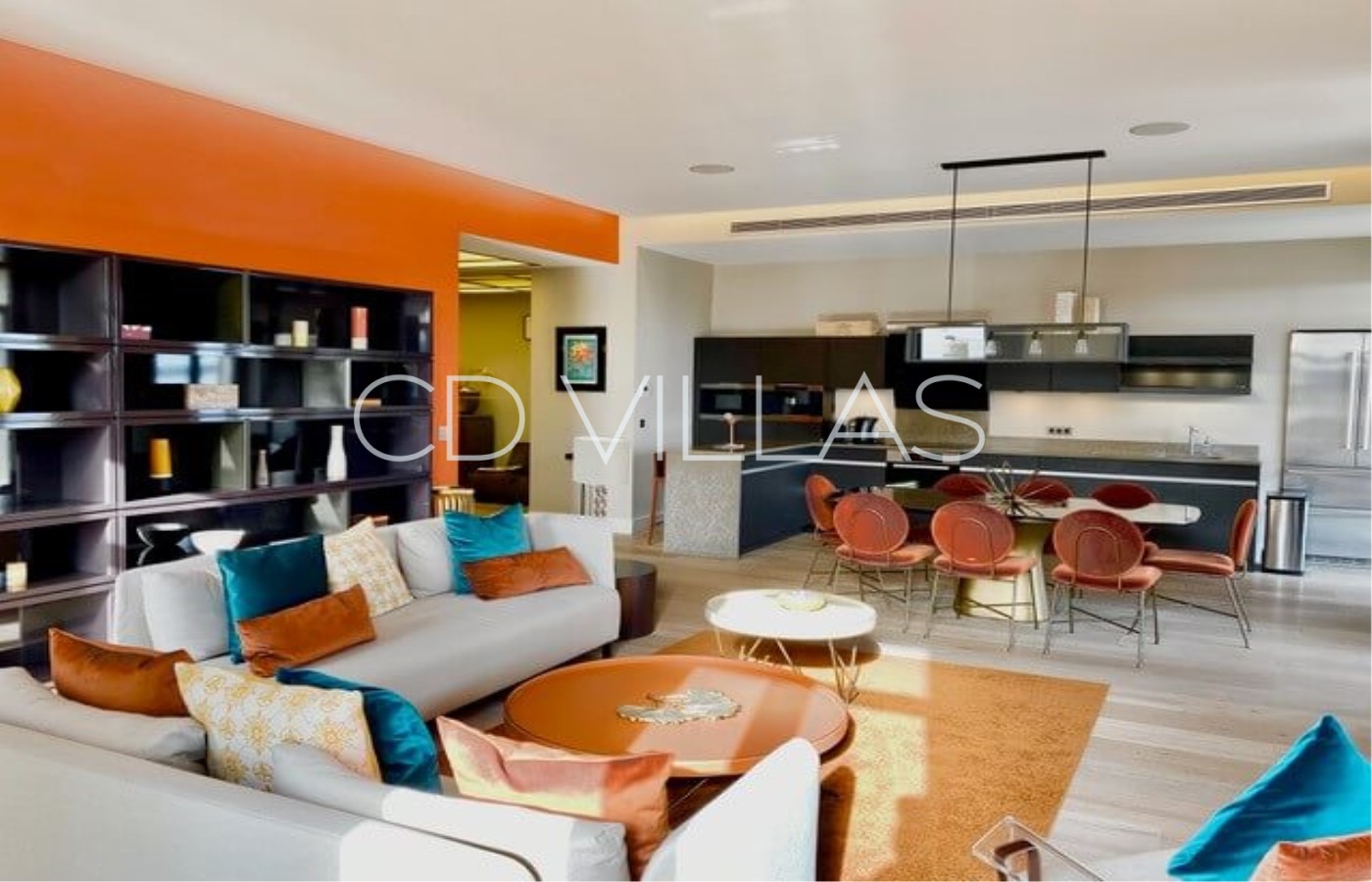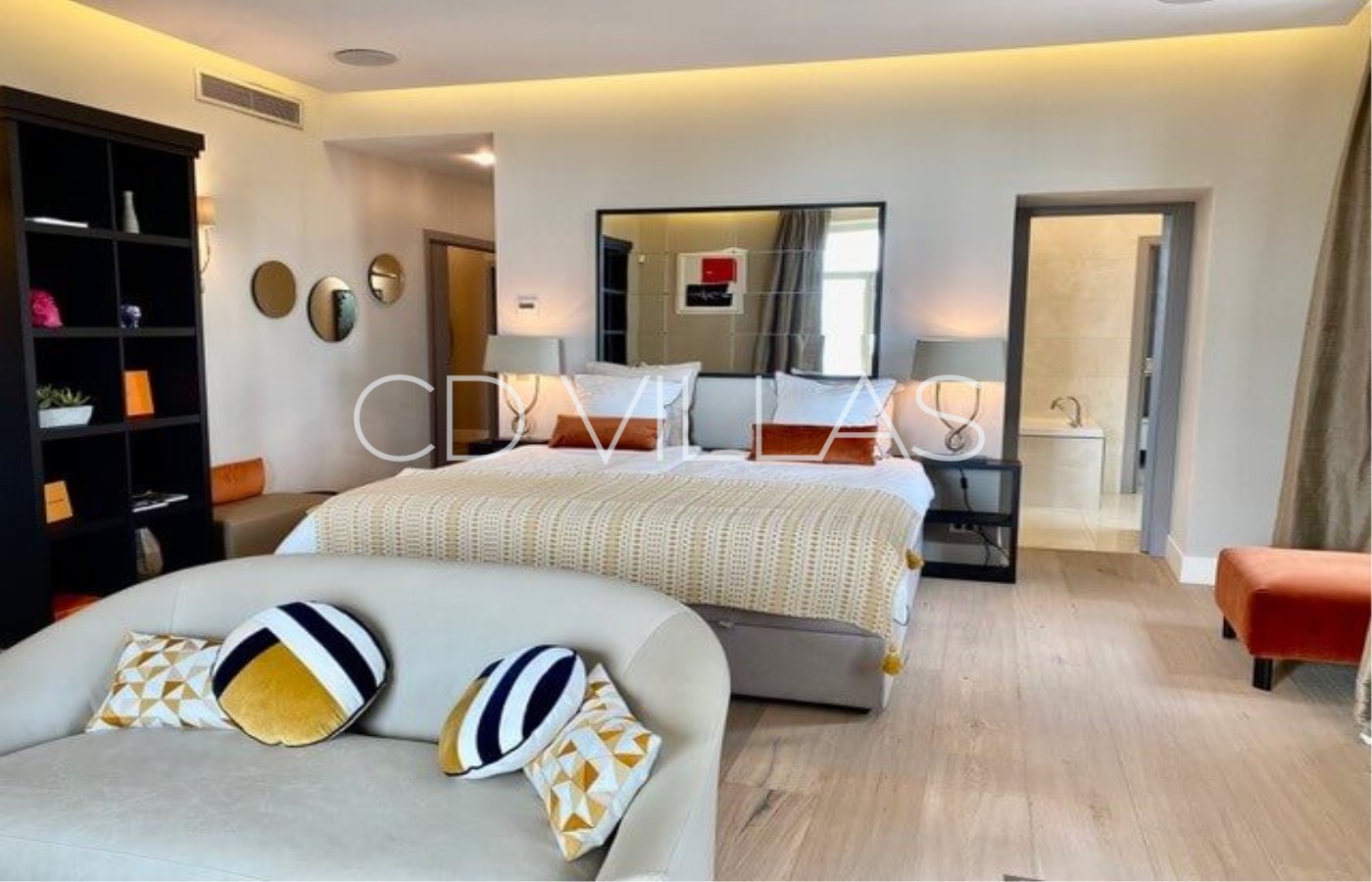 The apartment is composed of an entry hall with guest WC leading through to the spacious living room with open kitchen and dining area, opening up onto the 35m2 terraces with stunning views over beach and sea.