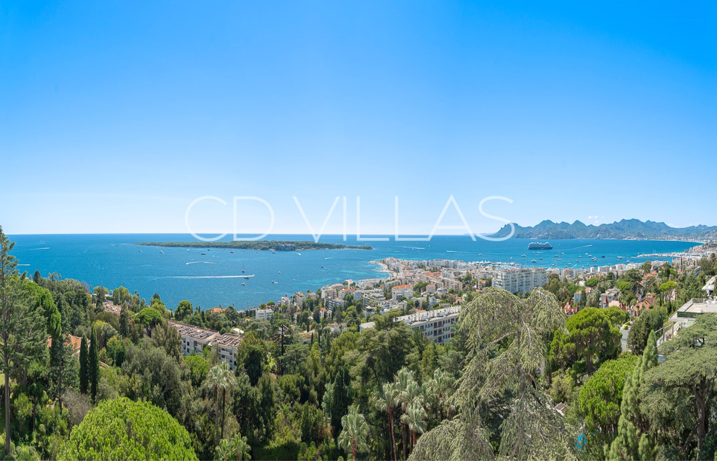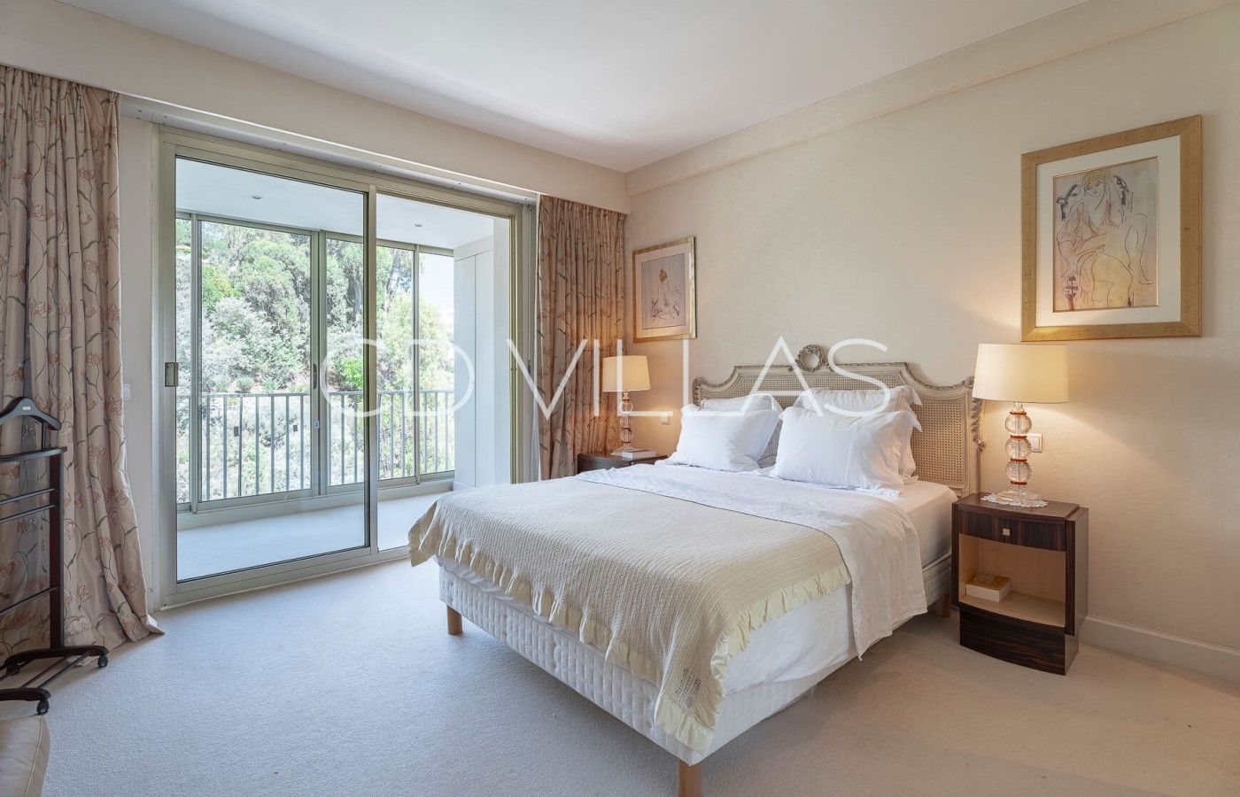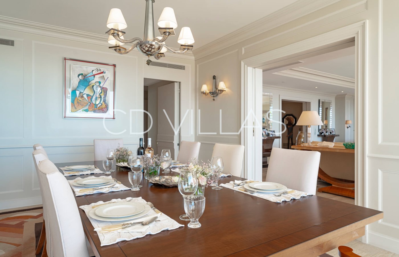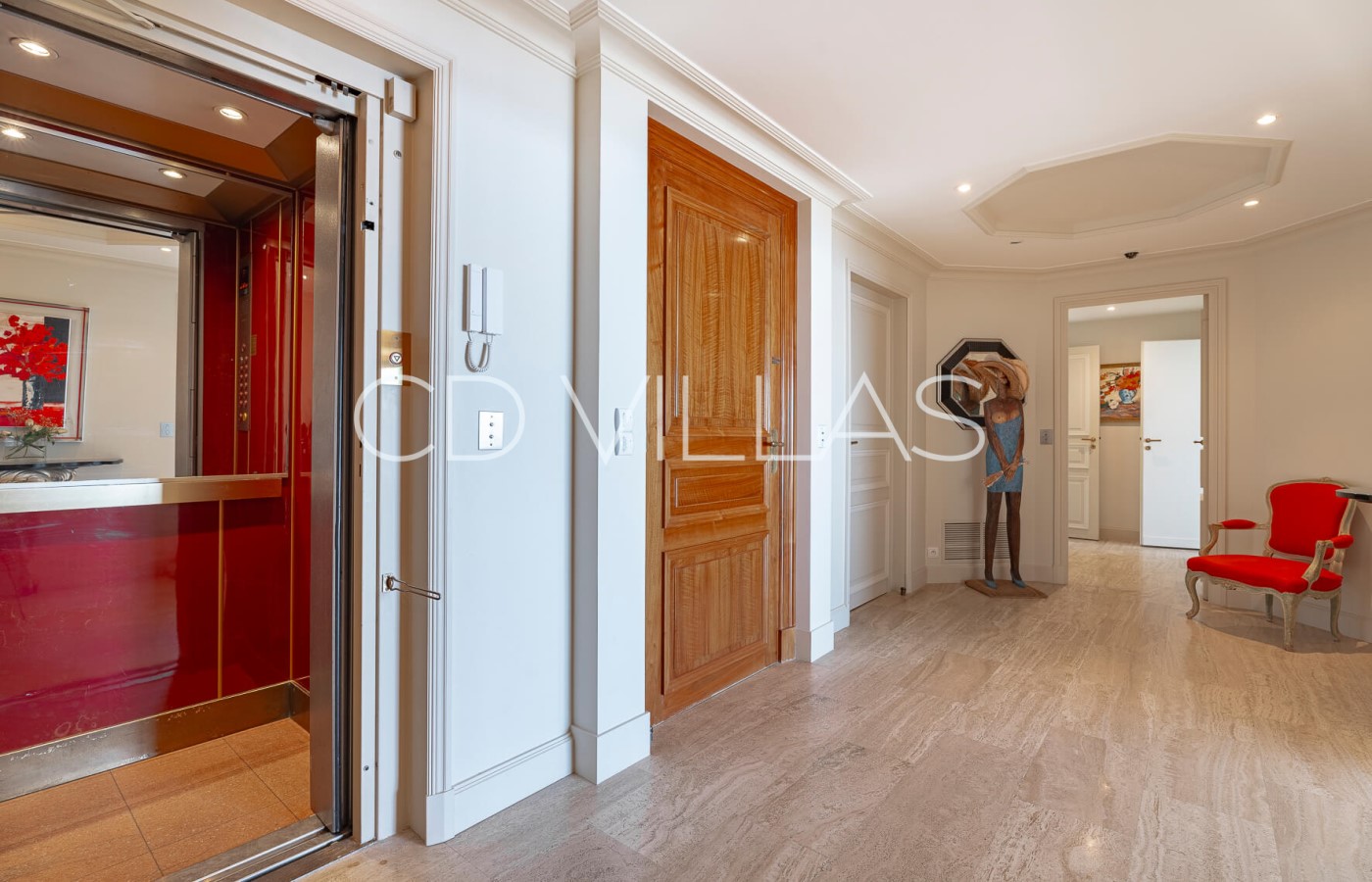 The exclusive domaine is accessed via electric gates with on site parking. A private elevator takes guests directly up to the top floor apartment and opens onto the spacious entry hall flowing over into the natural light flooded lving and dining areas. Here, large glass sliding doors open onto the balcany and views out over the Bay of Cannes.