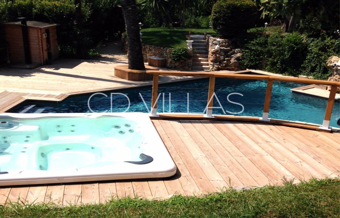 A magnificent terrace runs along the front the villa offering a unique venue for private parties or just relaxing with drinks al fresco. The free form heated pool with deck terrace and jacuzzi.