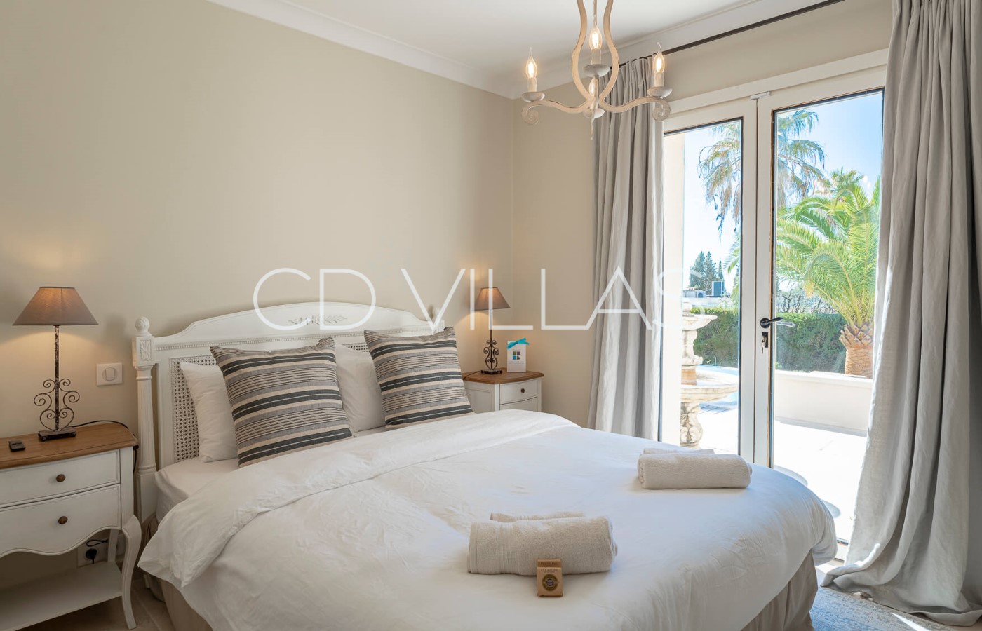 Outside are several seating areas, including a terrace with sun loungers by the pool.