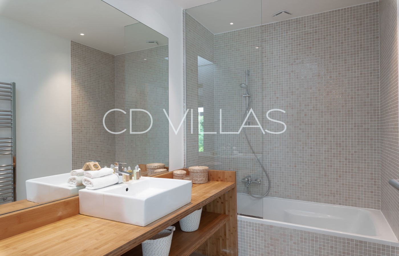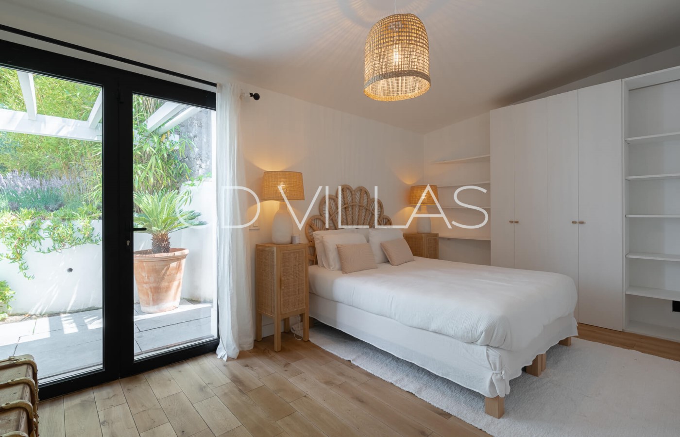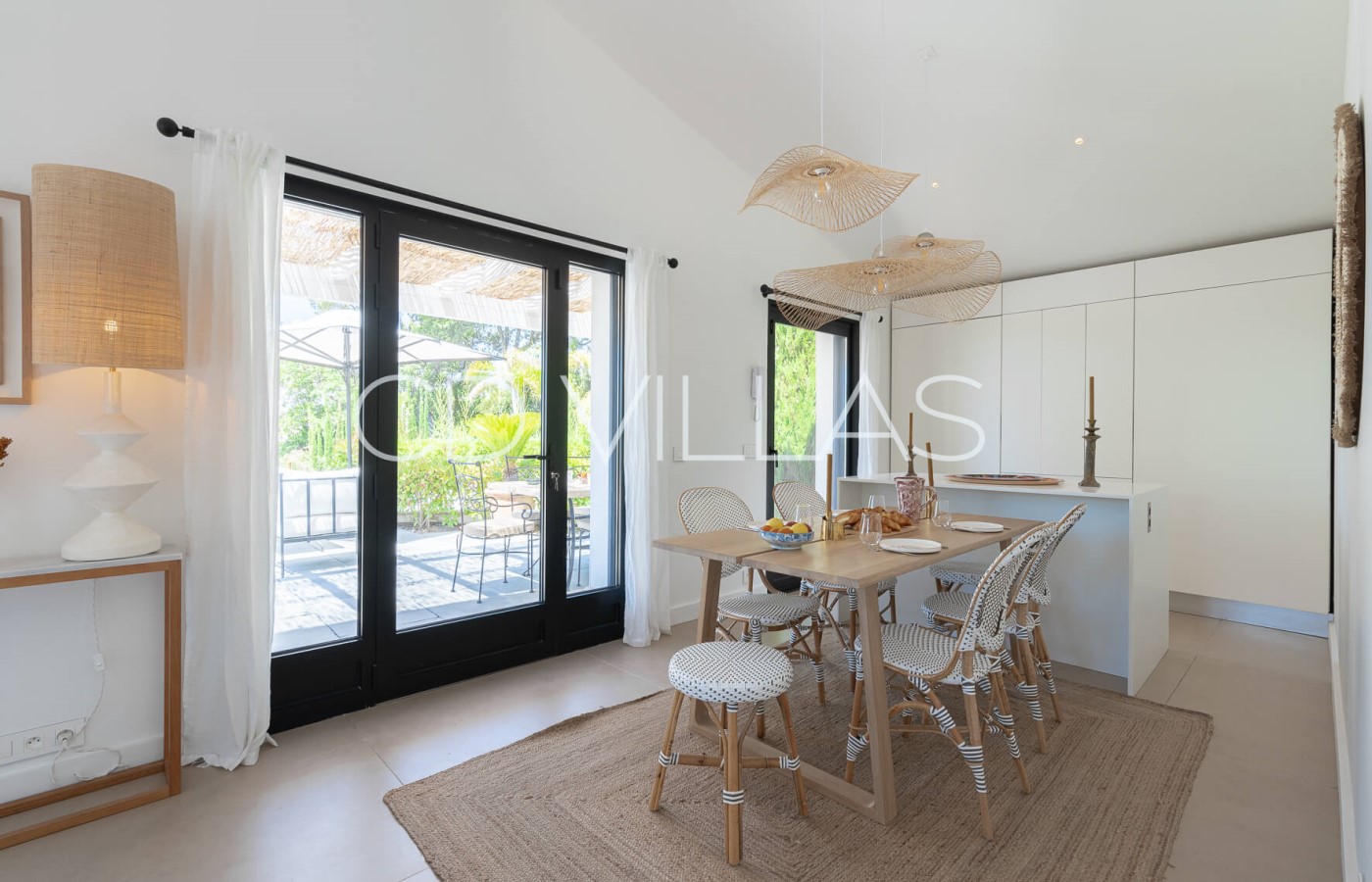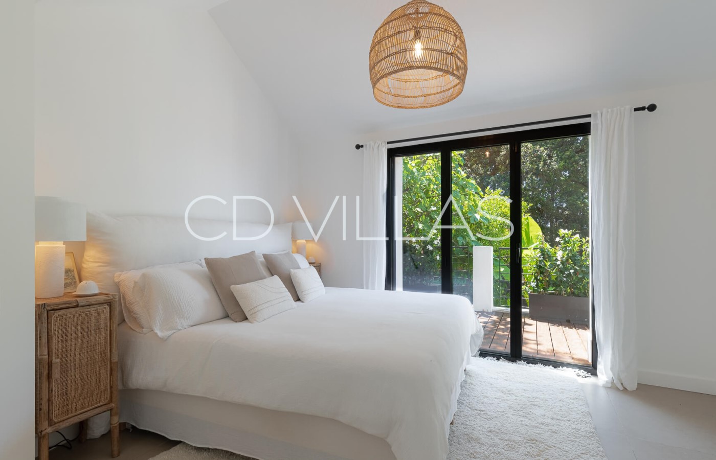 This beautiful property offers newly refurbished high end interiors with 3 bedrooms and 3 bathrooms and is fully air conditioned. The interiors are distributed over 2 floors with living, kitchen and dining on the ground floor, the en suite Master bedroom and bedroom 2 are located on the same floor. Steps lead down to the third bedroom with bathroom on the garden level. The living areas benefit from plenty of natural light and have access to an outdoor terrace with views. Outside the idyllic gardens with beautifully kept lawn and Mediterranean vegetation invite to relax in nature, a saltwater swimming pool which measures about 6 x 3 meters is available for guests. All outdoor living areas are quiet and private with no vis a vis.